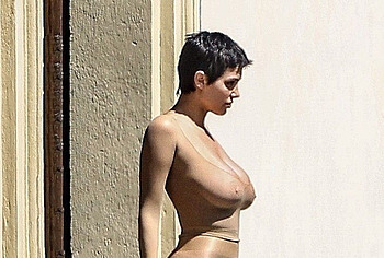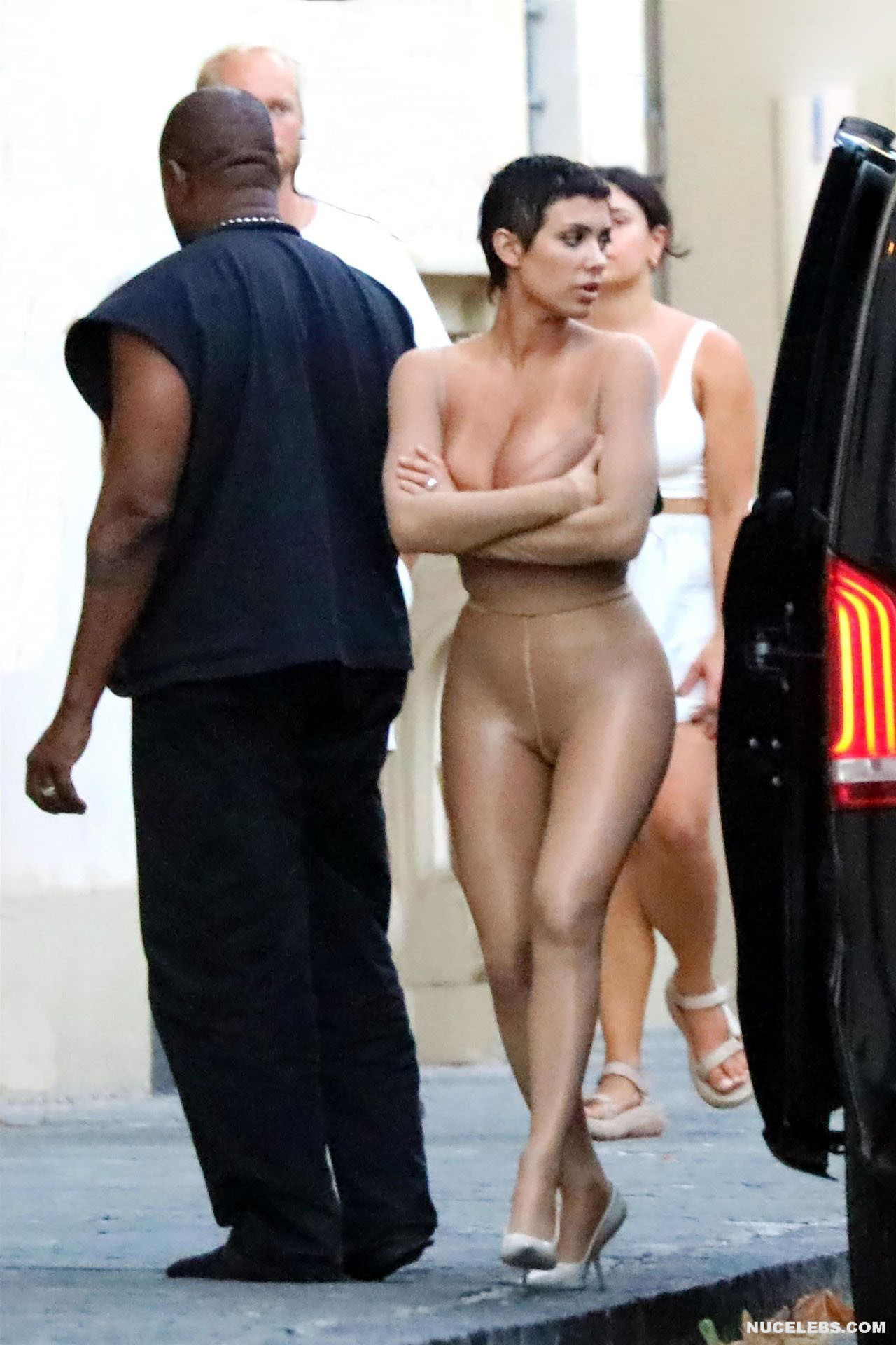 When you look at this photo, it will seem to you that you see Bianca Censori completely nude in the middle of the street! However, if you take a closer look, you can see that this celebrity was wearing a beige bodycon jumpsuit. The fabric of the jumpsuit was so thin that Bianca Censori’s boobs with poking nipples and her ass appeared to be exposed! Oh, this star made a splash on the streets with her outfit!