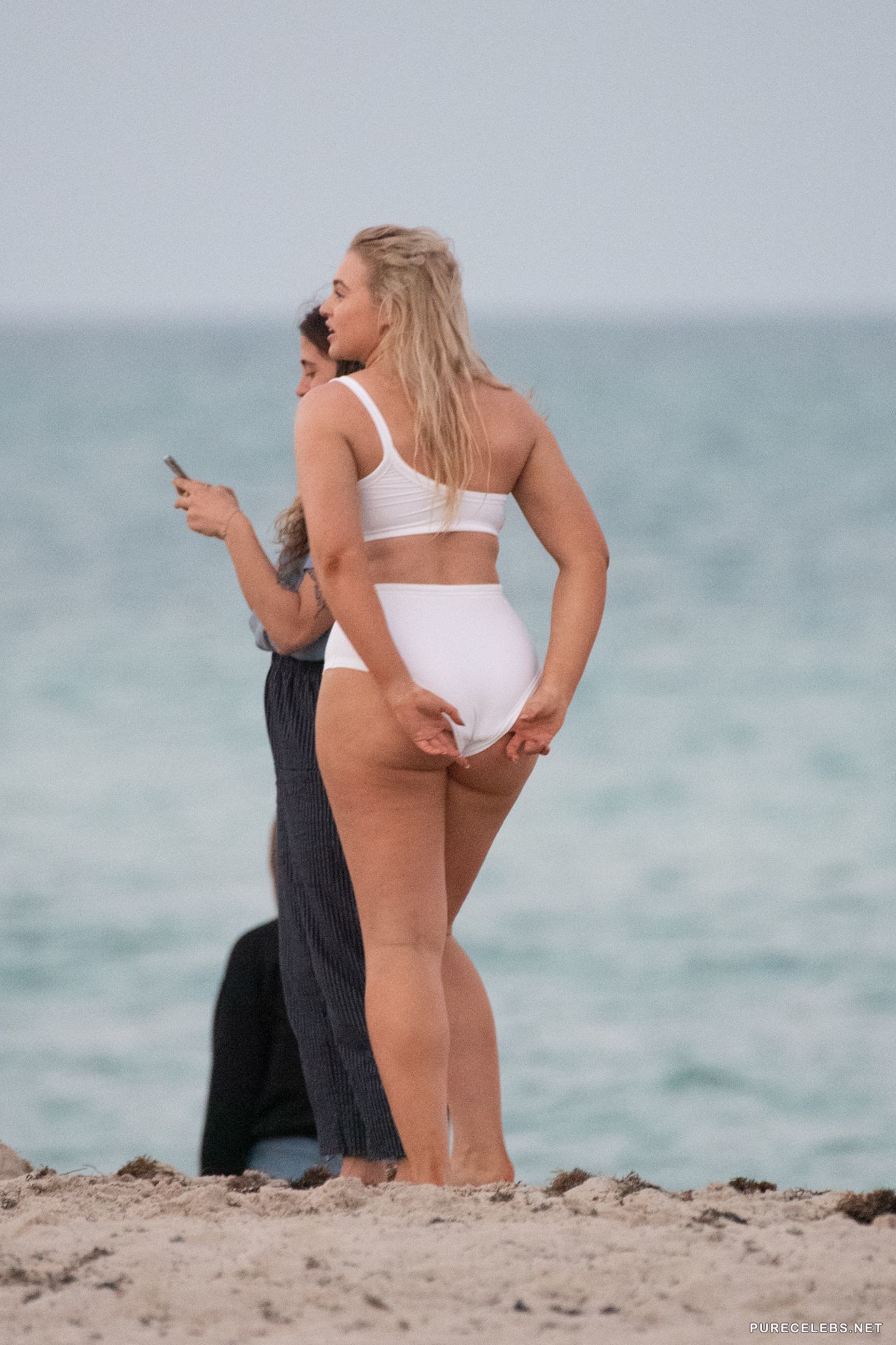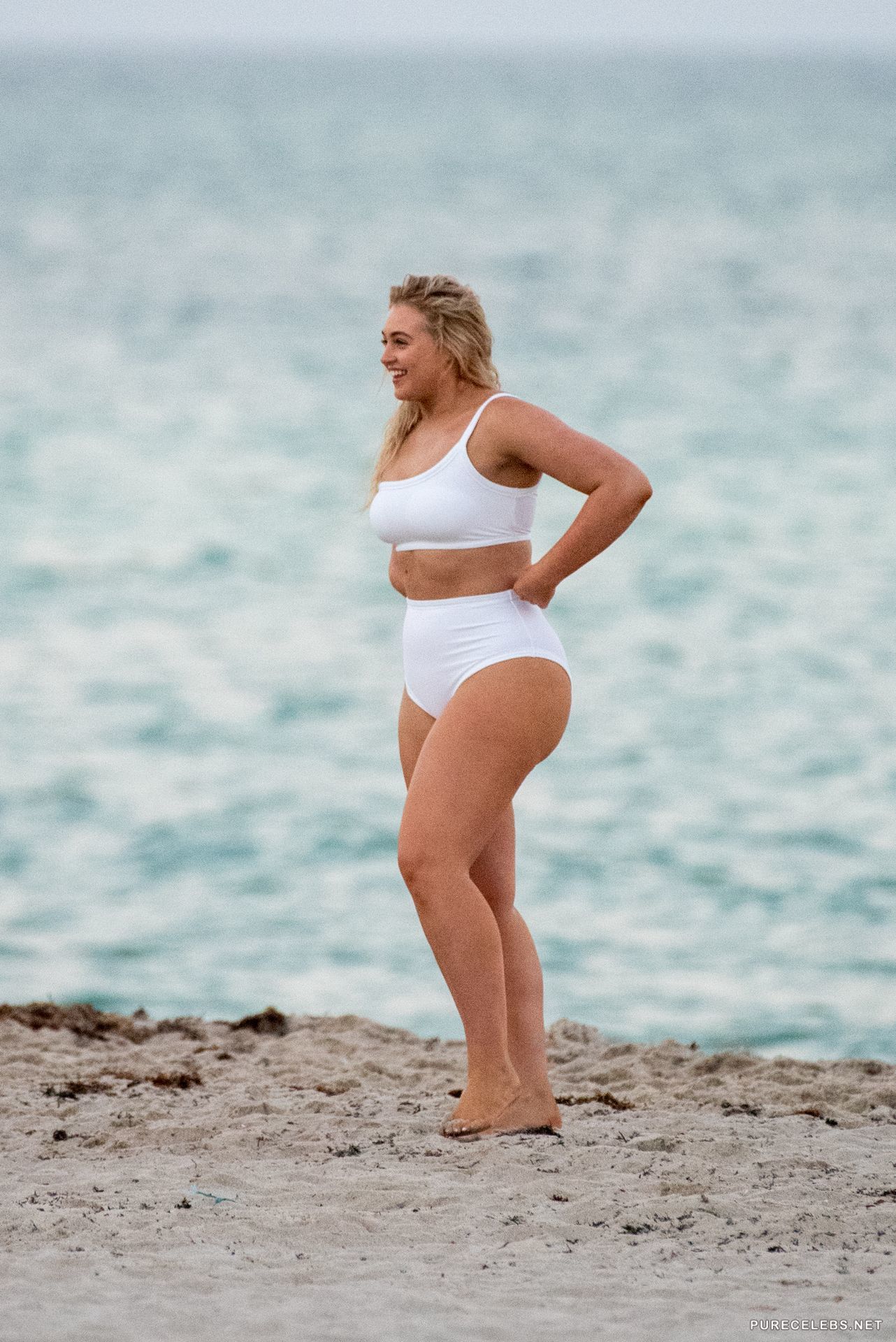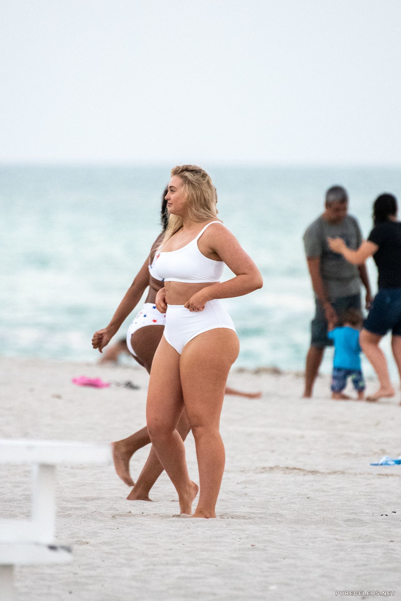 Big size model Iskra Lawrence is very proud of her magnificent forms and doesn’t miss a chance to show it to the public. The star wore a gorgeous white bikini for her beach vacation. A beautiful white top with straps over one shoulder accentuated her huge charming melons very well. And her white high-waisted panties perfectly demonstrated her magnificent lush booty and rounded tummy.