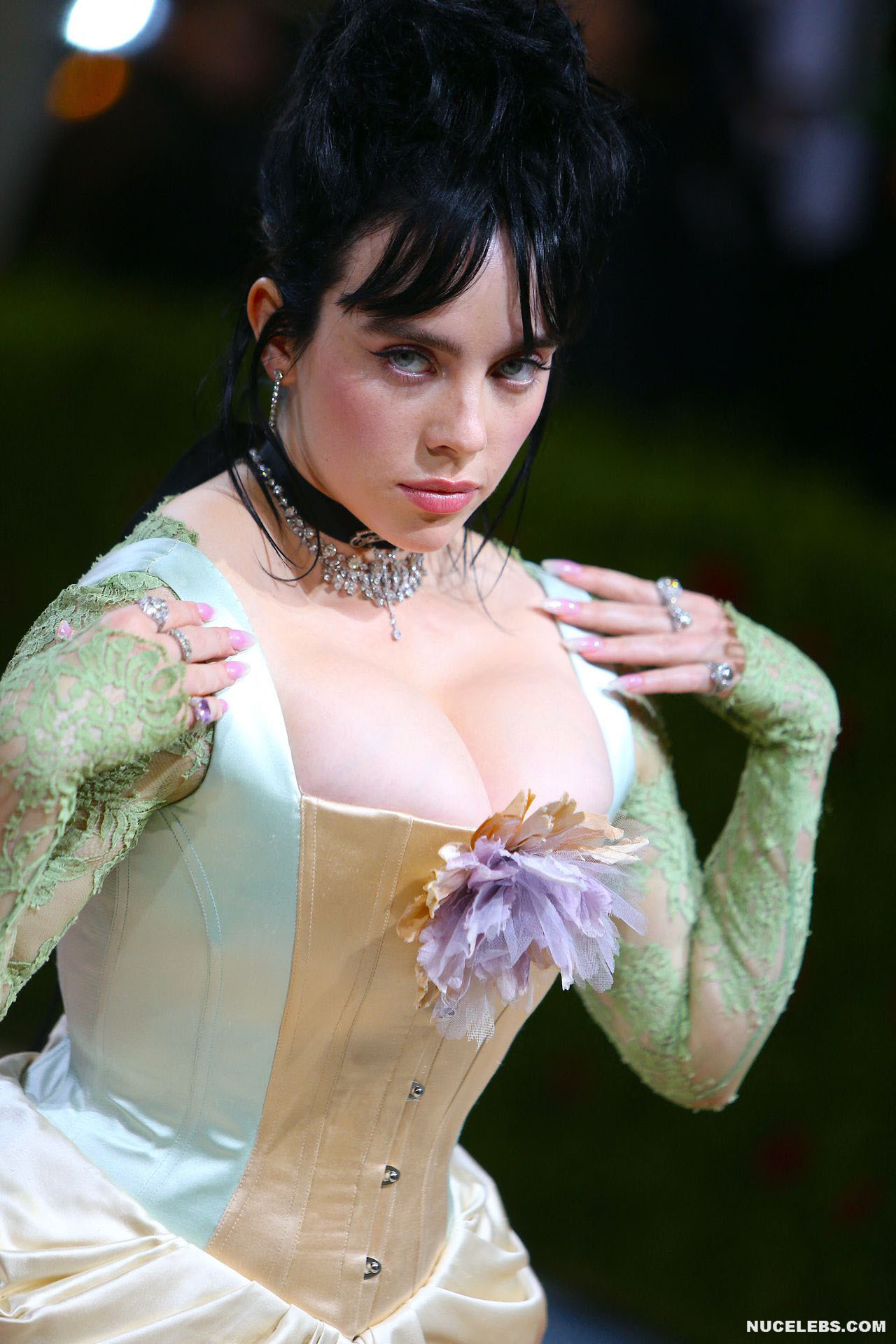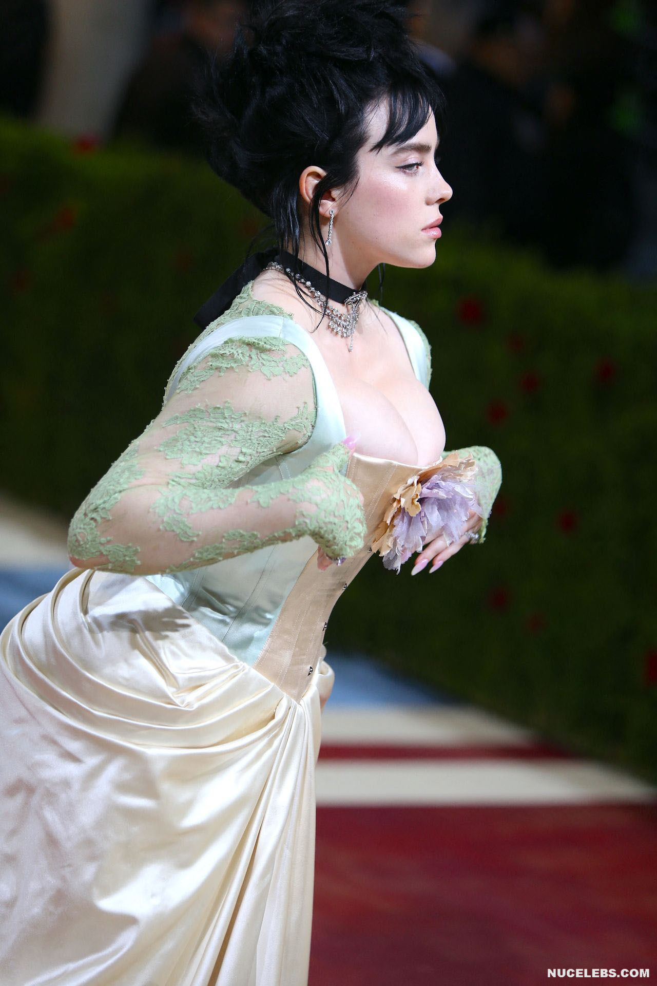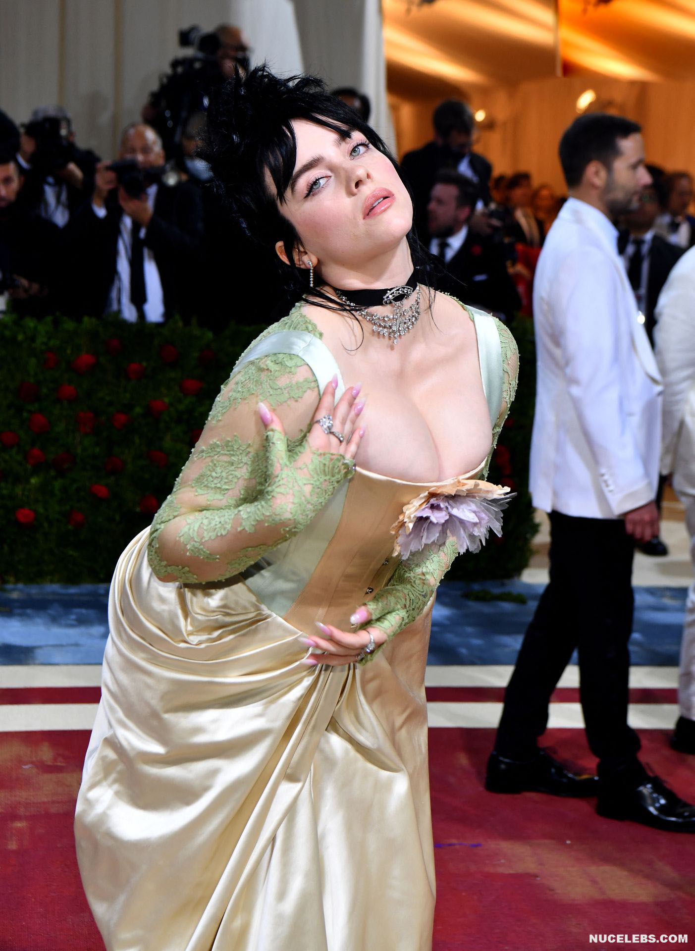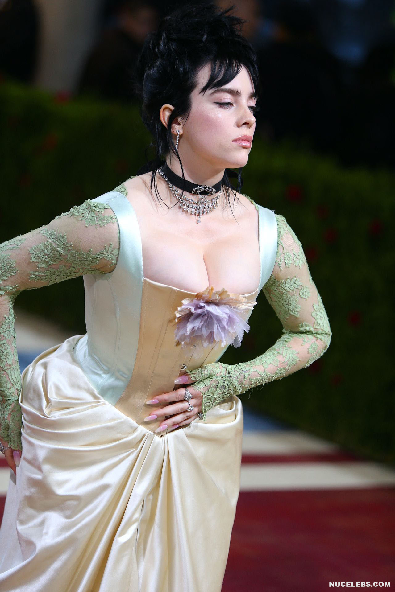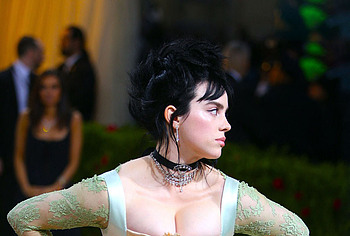 Billie Eilish took great care in choosing her outfit for one of the latest events. So, this 20 year old American actress was dressed in a light long dress with a corset. At the same time, Billie Eilish’s nude huge boobs almost jumped out of her tight corset. Especially when Billie Eilish leaned over her nude juicy breasts were almost completely on display and the paparazzi were happy to photograph her from various angles.
