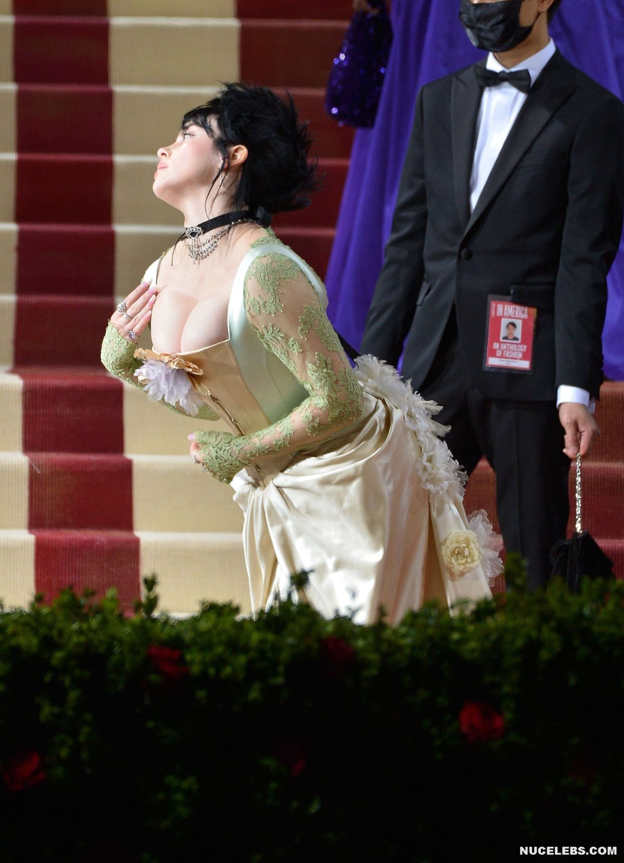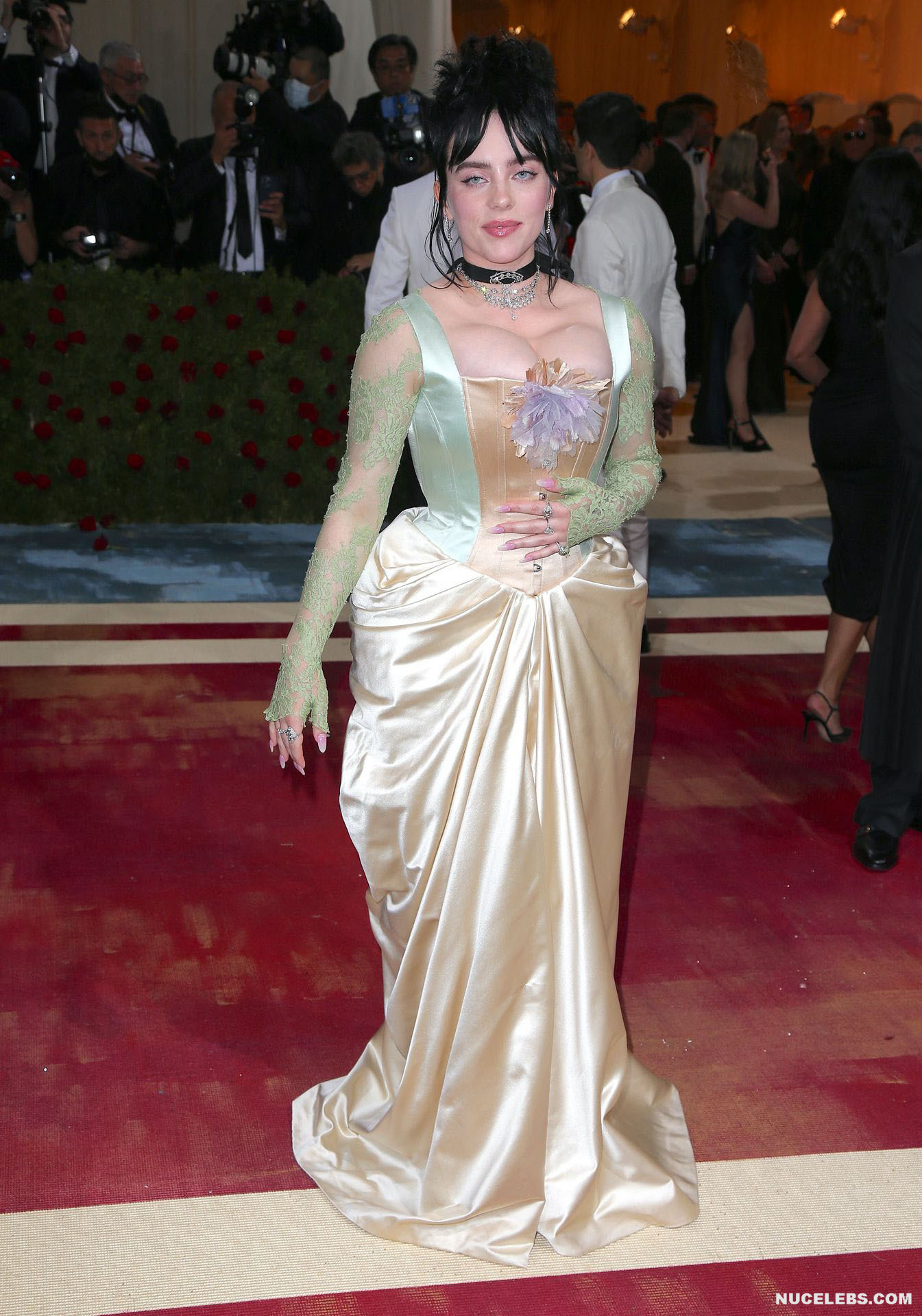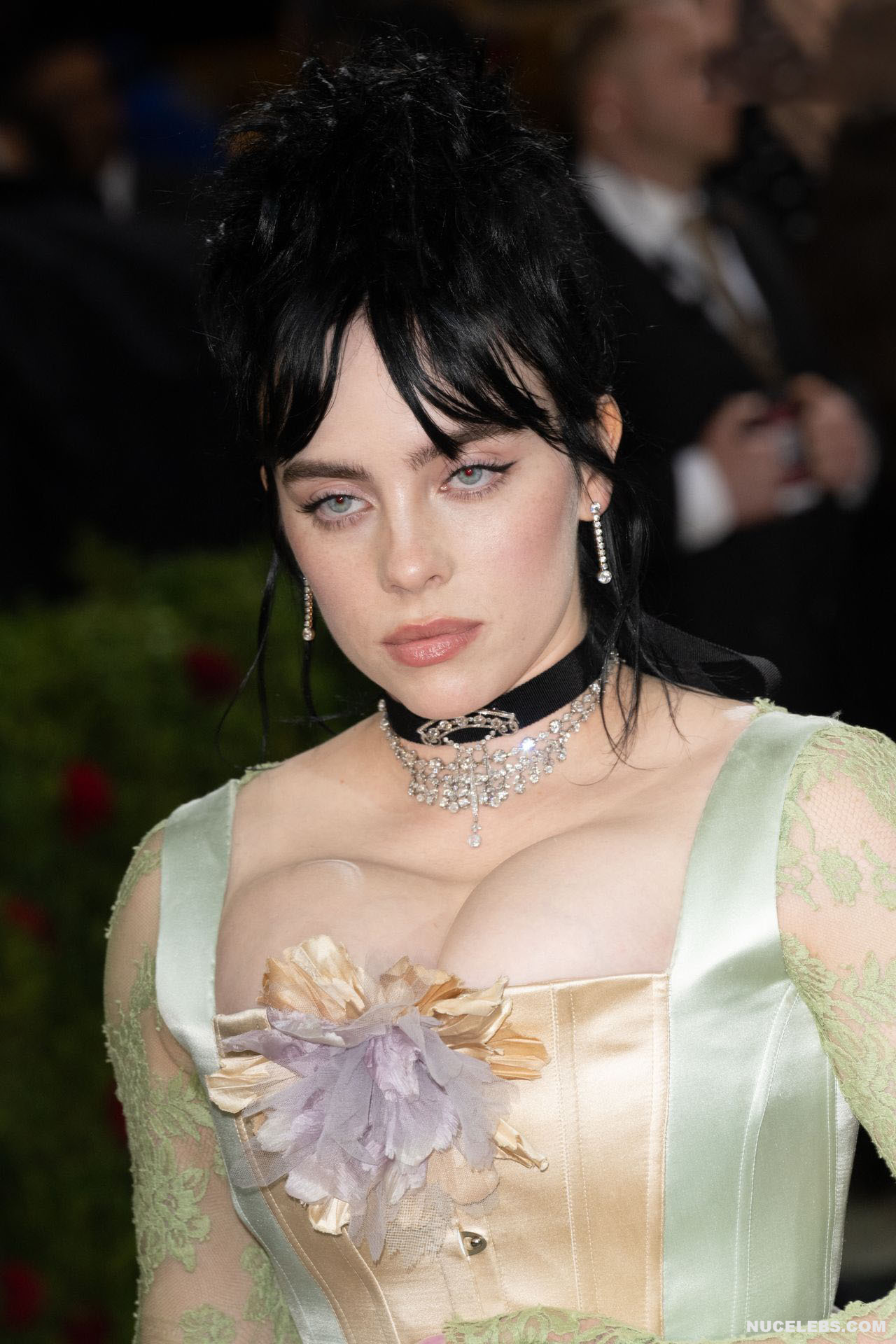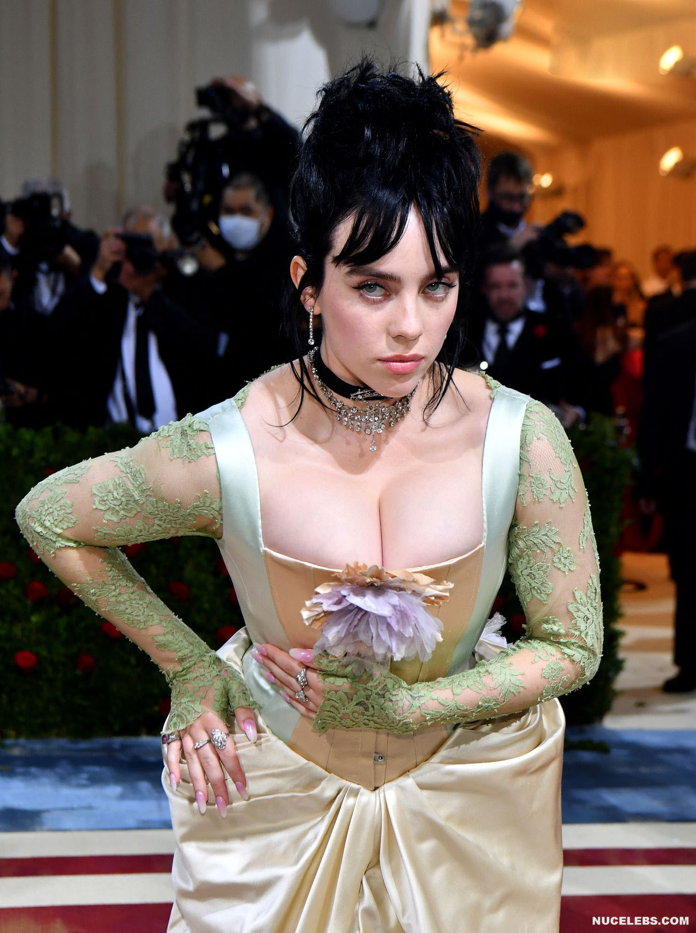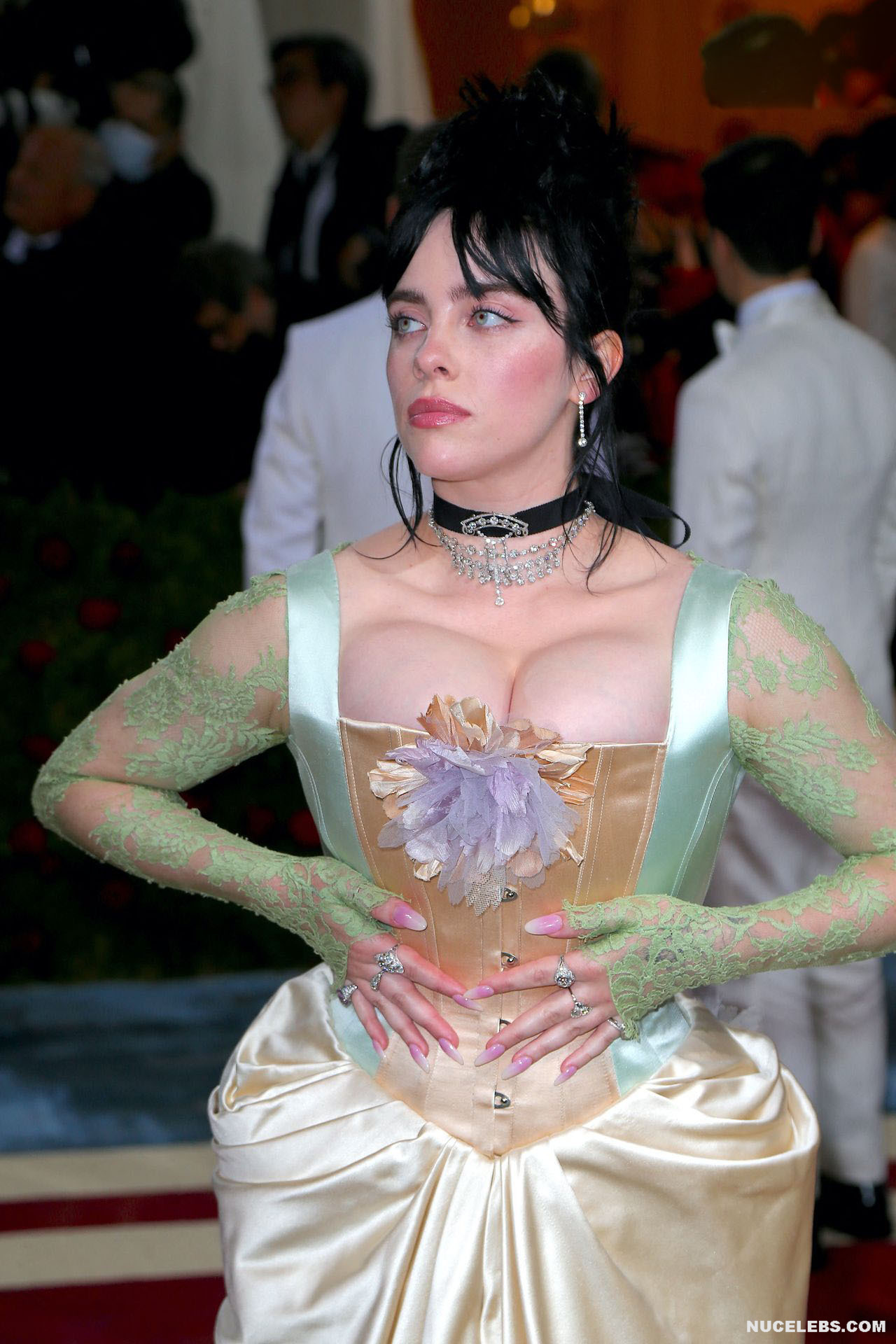 Billie Eilish took great care in choosing her outfit for one of the latest events. So, this 20 year old American actress was dressed in a light long dress with a corset. At the same time, Billie Eilish’s nude huge boobs almost jumped out of her tight corset. Especially when Billie Eilish leaned over her nude juicy breasts were almost completely on display and the paparazzi were happy to photograph her from various angles.