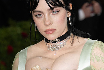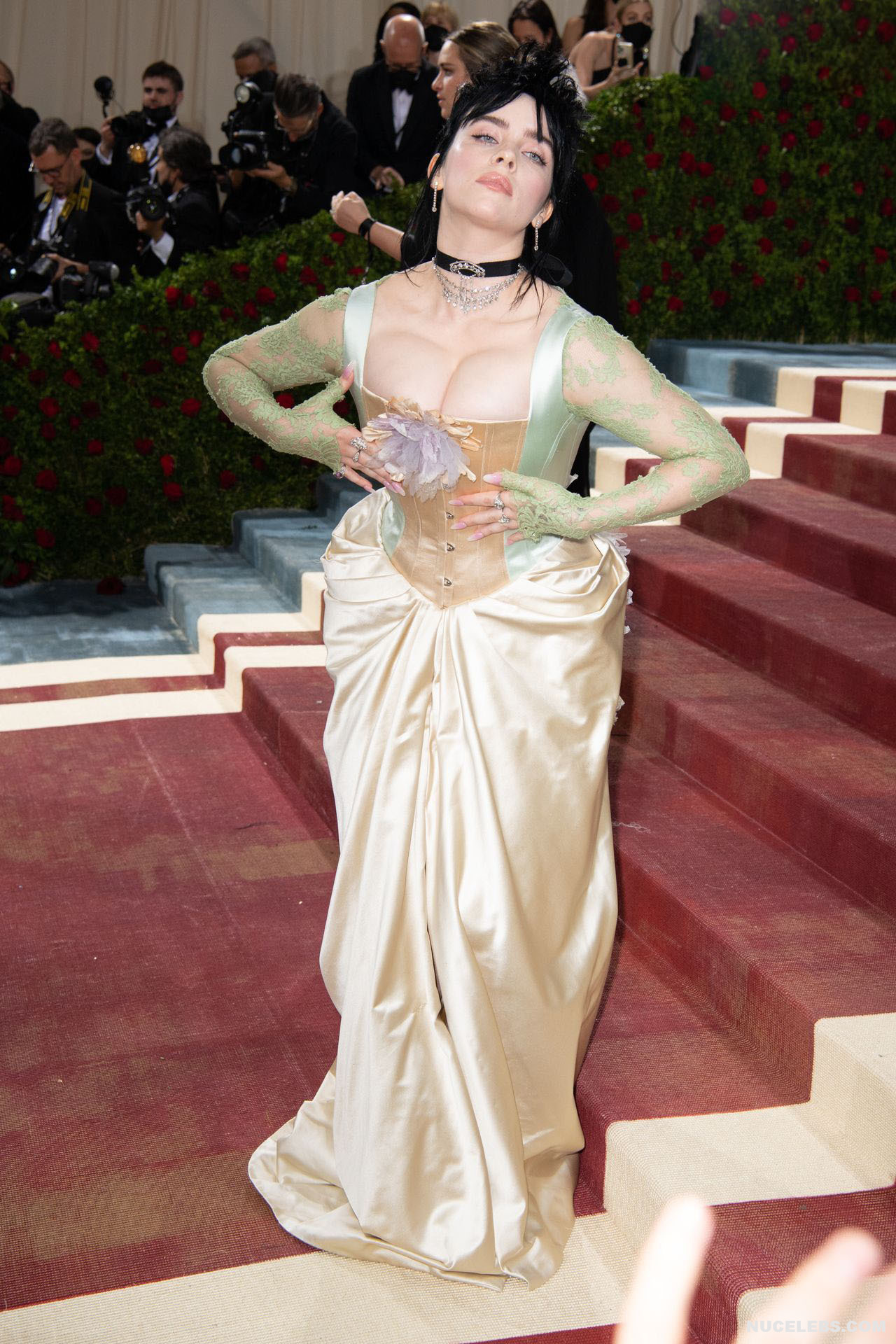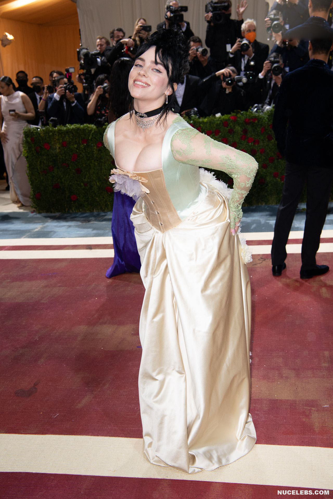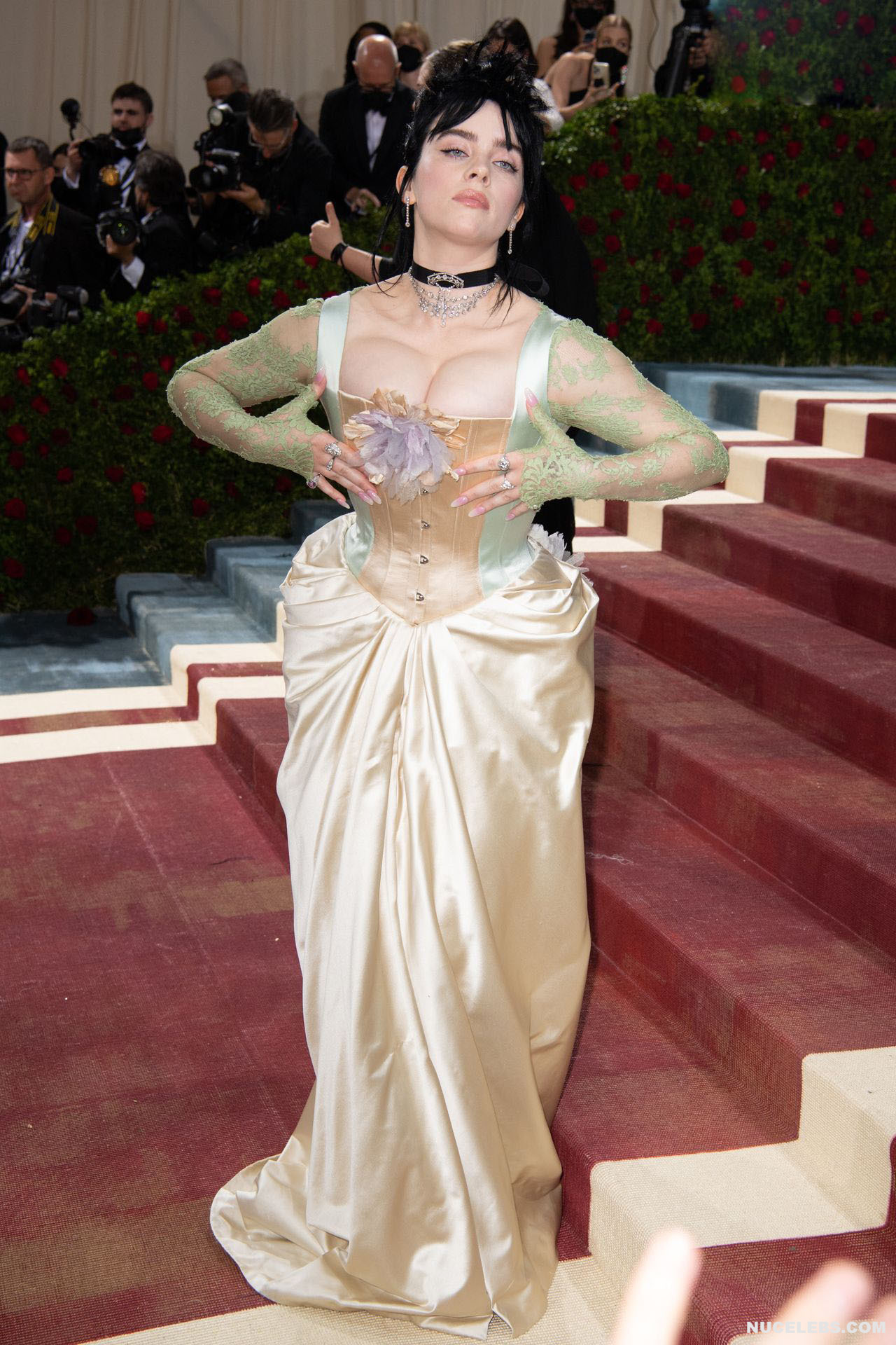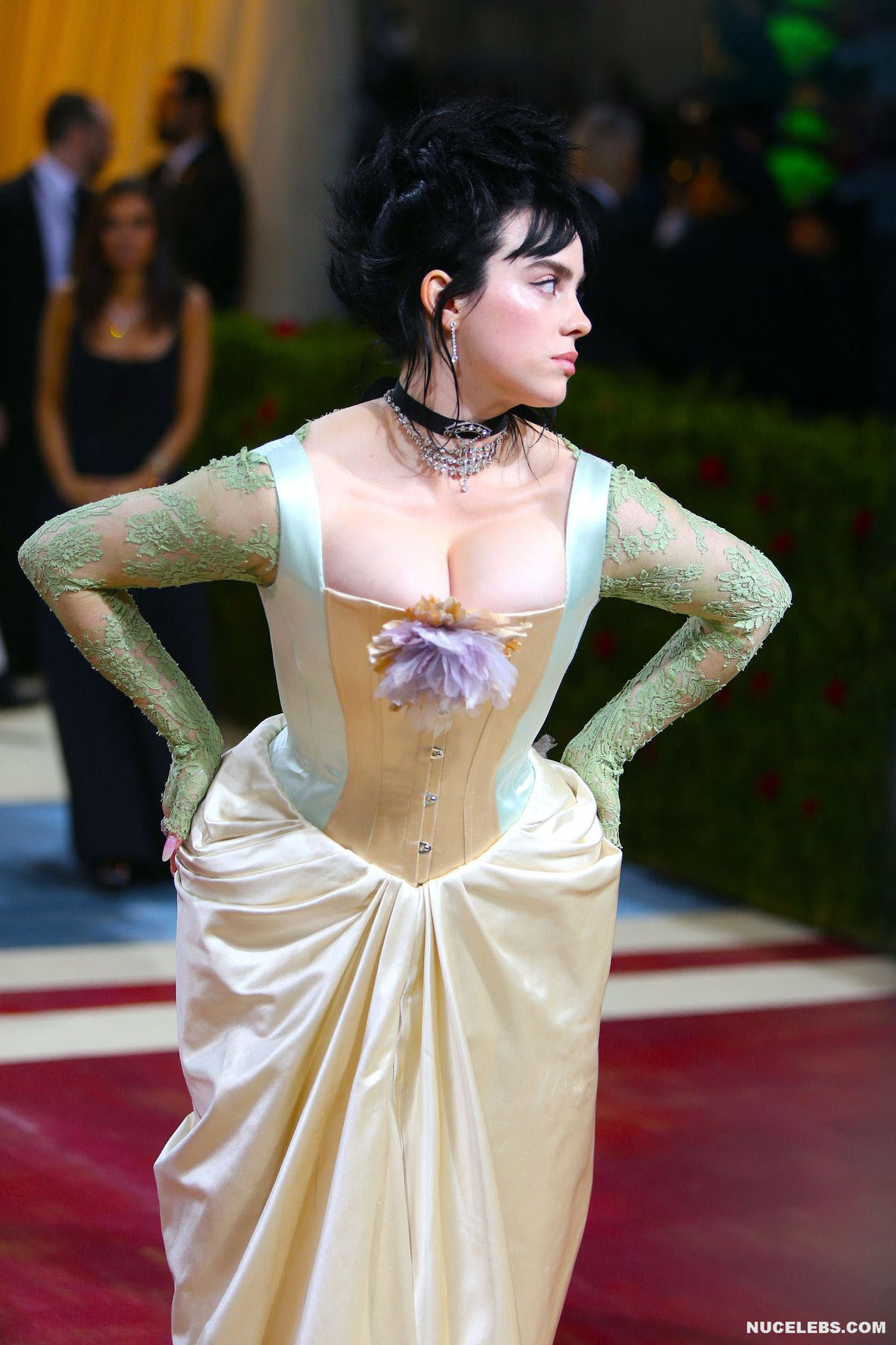 Billie Eilish took great care in choosing her outfit for one of the latest events. So, this 20 year old American actress was dressed in a light long dress with a corset. At the same time, Billie Eilish’s nude huge boobs almost jumped out of her tight corset. Especially when Billie Eilish leaned over her nude juicy breasts were almost completely on display and the paparazzi were happy to photograph her from various angles.