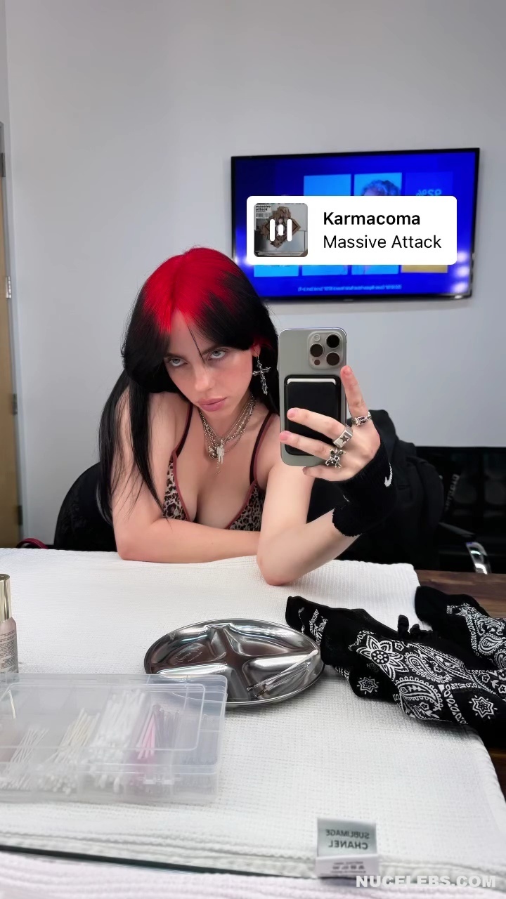 Billie Eilish redefines sensuality with their tasteful and empowering lingerie choices. Agree, her tattooed ass looked stunning in silver panties. This celebrity also flaunted her stunning cameltoe in wet brown panties while relaxing in the jacuzzi. And of course, you should see Billie Eilish’s gorgeous titties in a white lace bra, because they seemed huge when she took a selfie in front of the mirror.