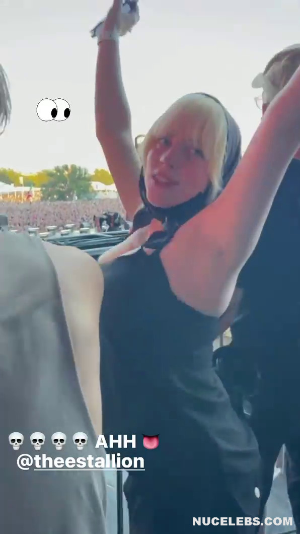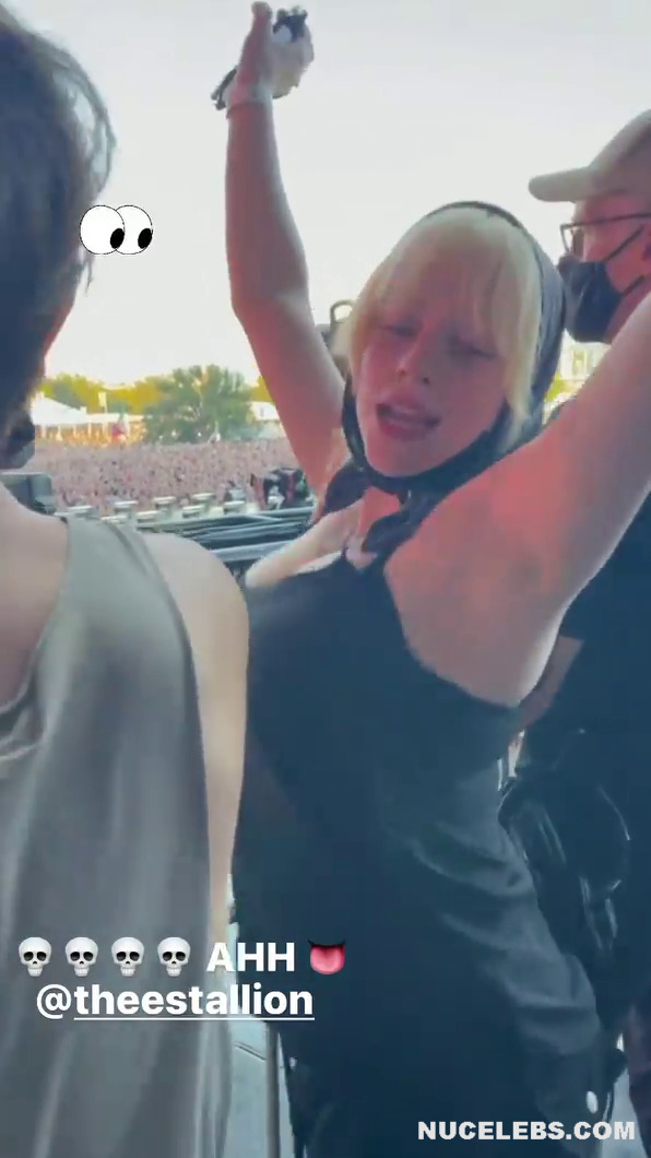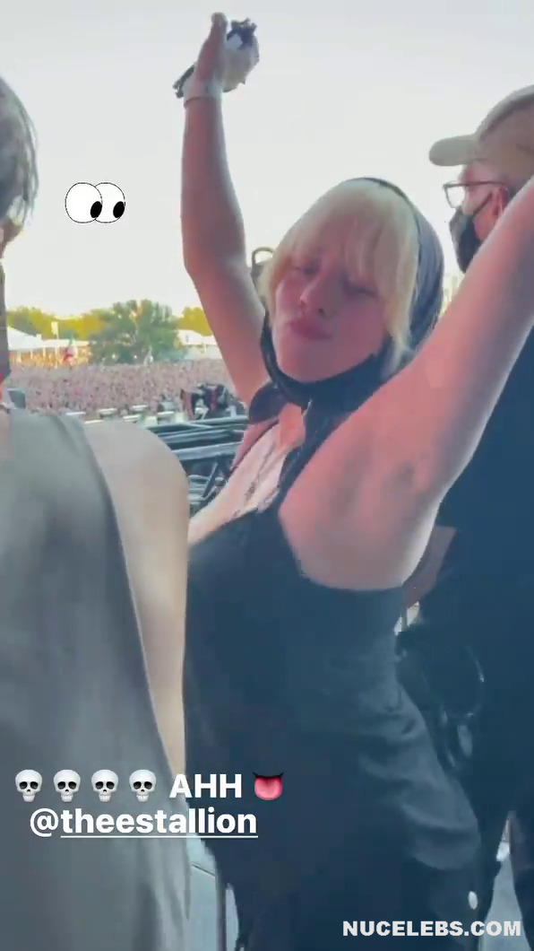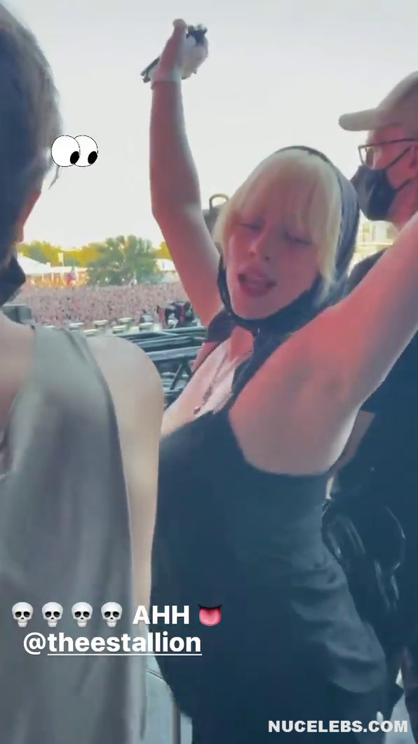 Check out Billie Eilish’s provocative video in which she almost shows off her nude boobs! So, this singer, dressed in a black headscarf and black dress, decided to put on a real show by jumping and shaking your breasts at one of the events. And since the neckline of her dress was very low, Billie Eilish’s nude huge tits almost slipped out of it from her active jumps!
