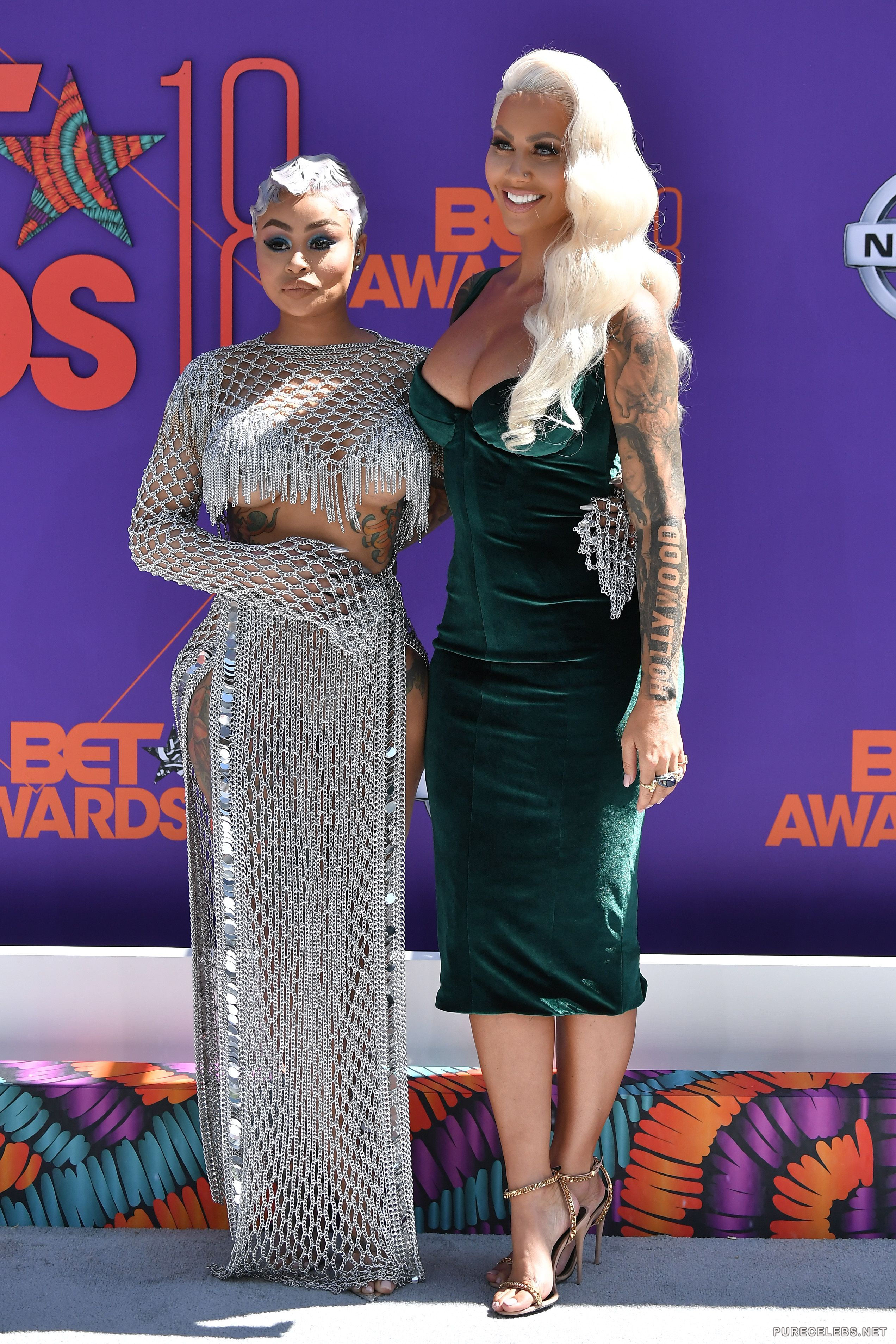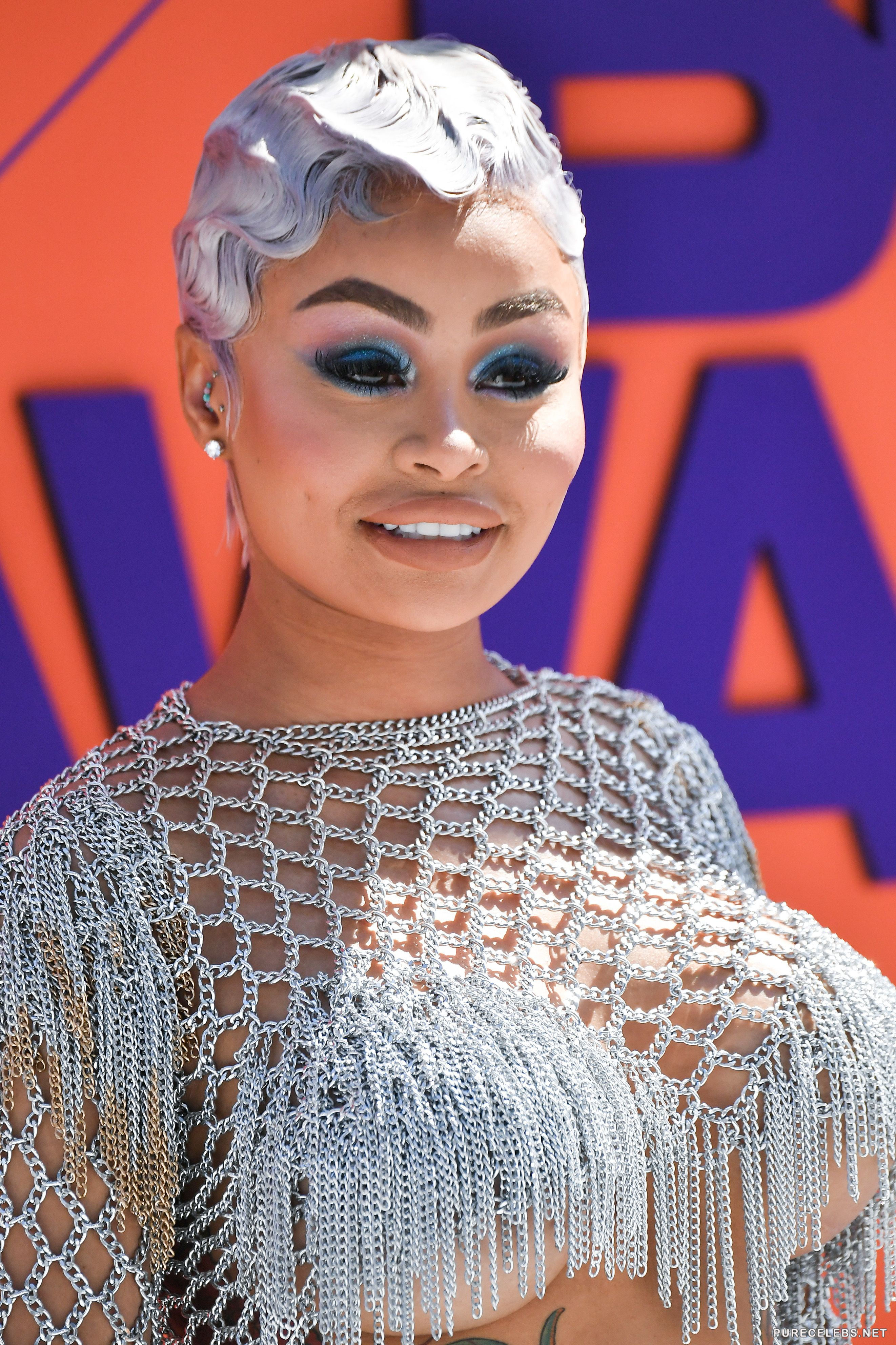 Blac Chyna kisses another woman that is taller then she is, but her tits are smaller then hers. We can check out how they eye one another as the curvy Blac Chyna exposes her knockers in the see through outfit. The silicone filled breasts do not need any support to stay up since they are so full and firm. The bimbo looks proud as she is exposing herself.