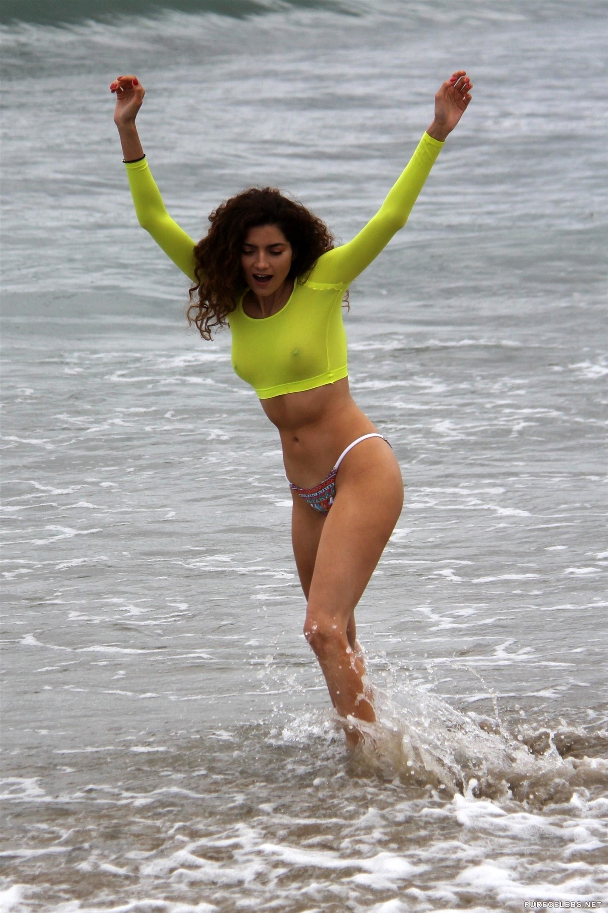 Hot actress Blanca Blanco is at the beach, getting her skin wet in the water. She still wears her top and as she ends up getting it wet, some dark spots form on it – those are her amazing sexy nipples and the tanned babe is happy to show them off. After a while, she takes off that wet top and she lies down topless to show off her ass.