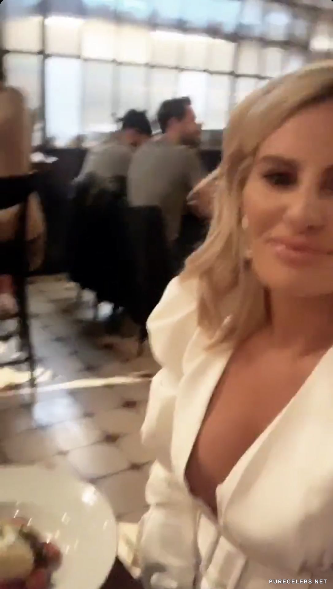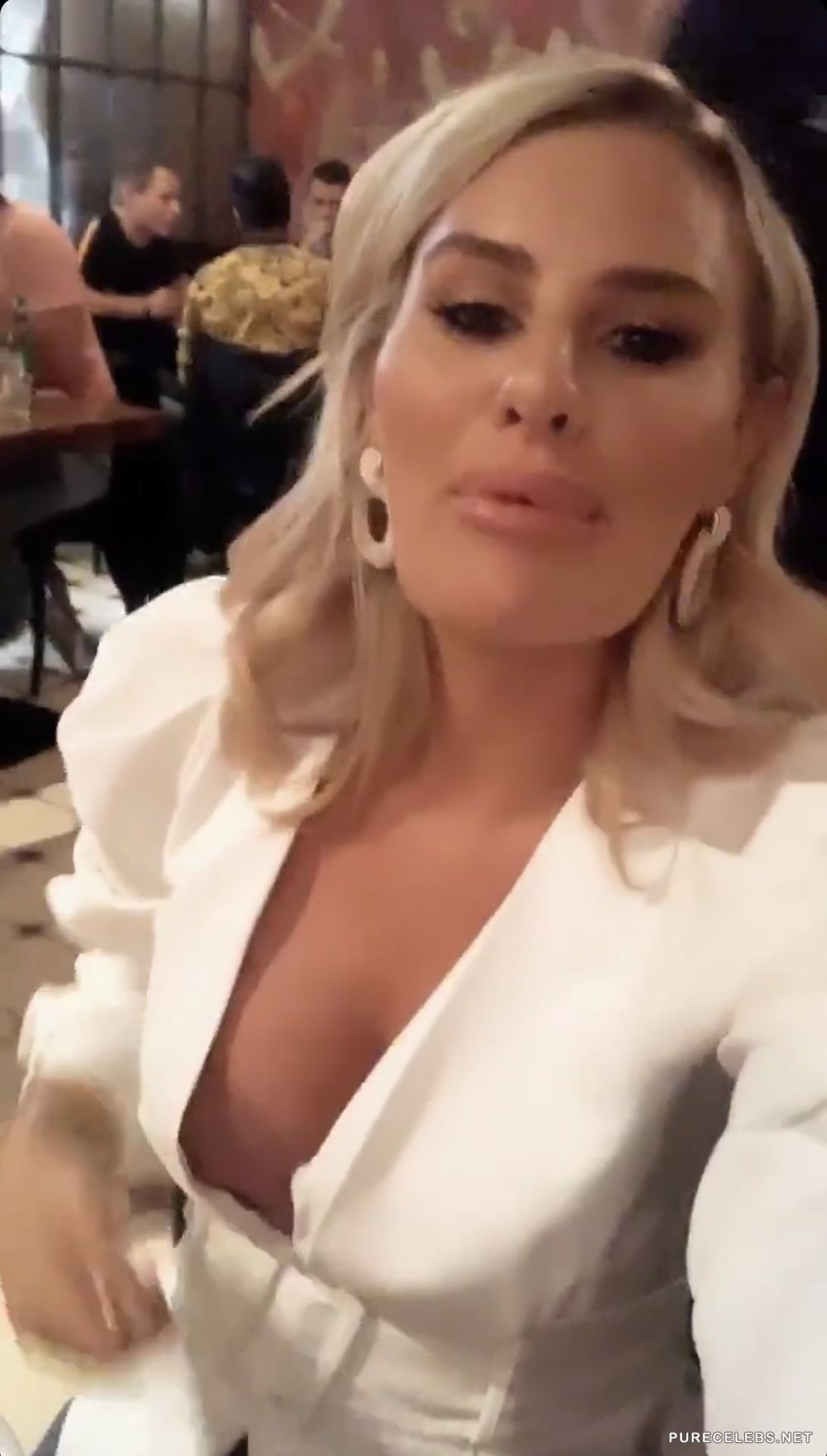 TV star Danielle Armstrong is sure to share with you her good mood when you see which video she recorded recently. The charming blonde was broadcasting from the restaurant, and the camera was focused on her white low-cut jacket. As you can see, the celebrity did not wear a bra, and therefore periodically her awesome boobs with areola nipples were visible from her jacket when the girl moved.