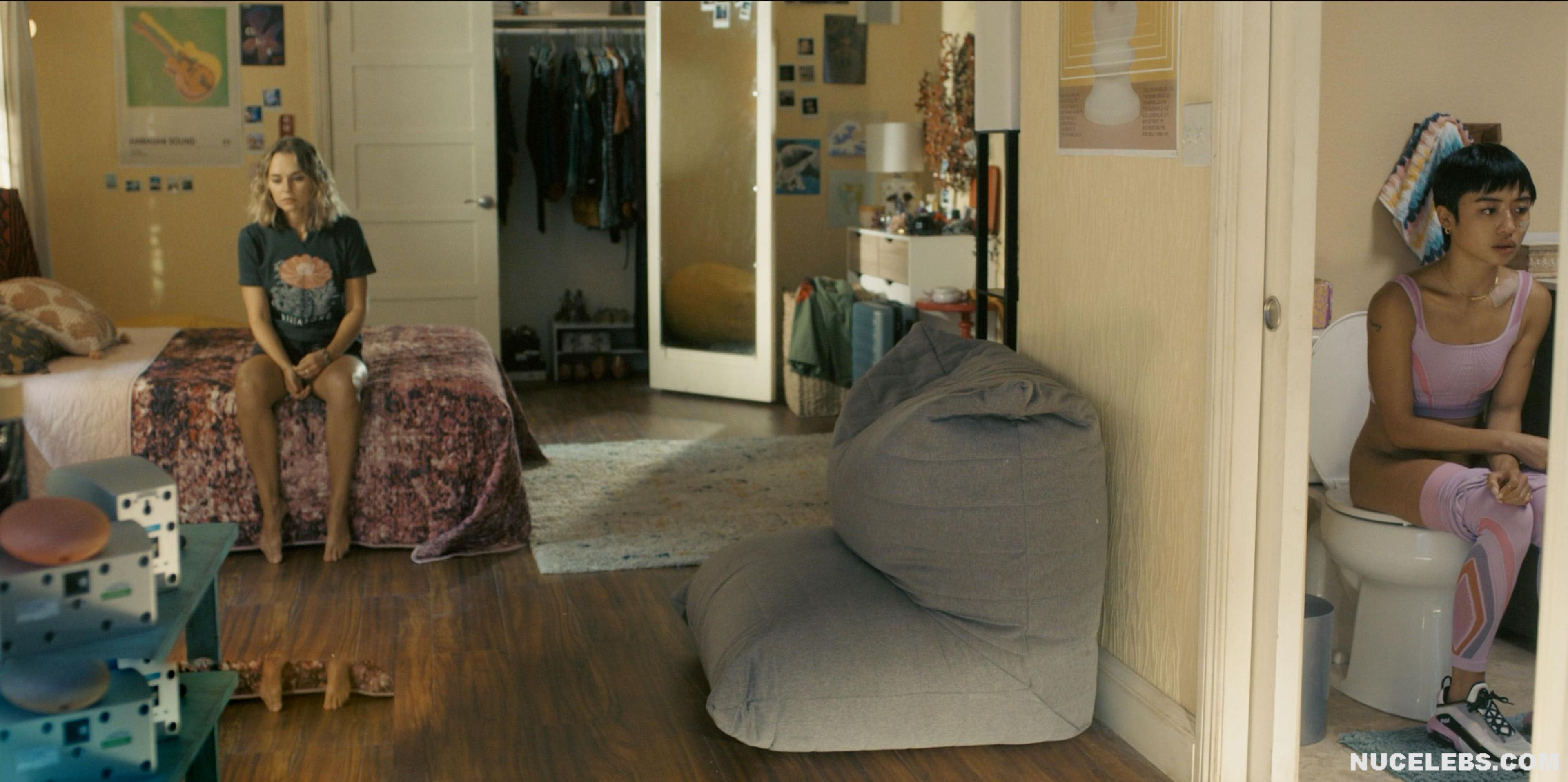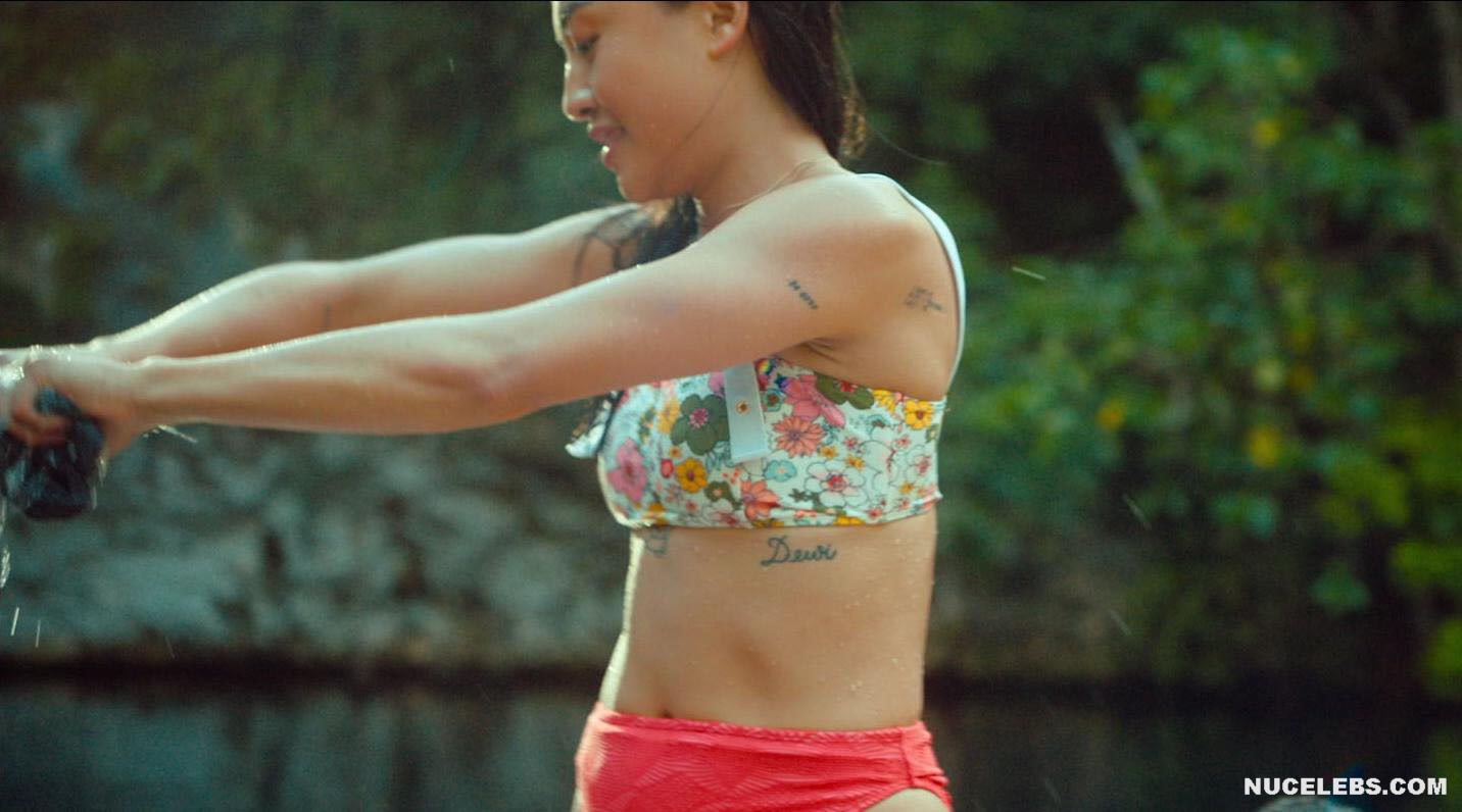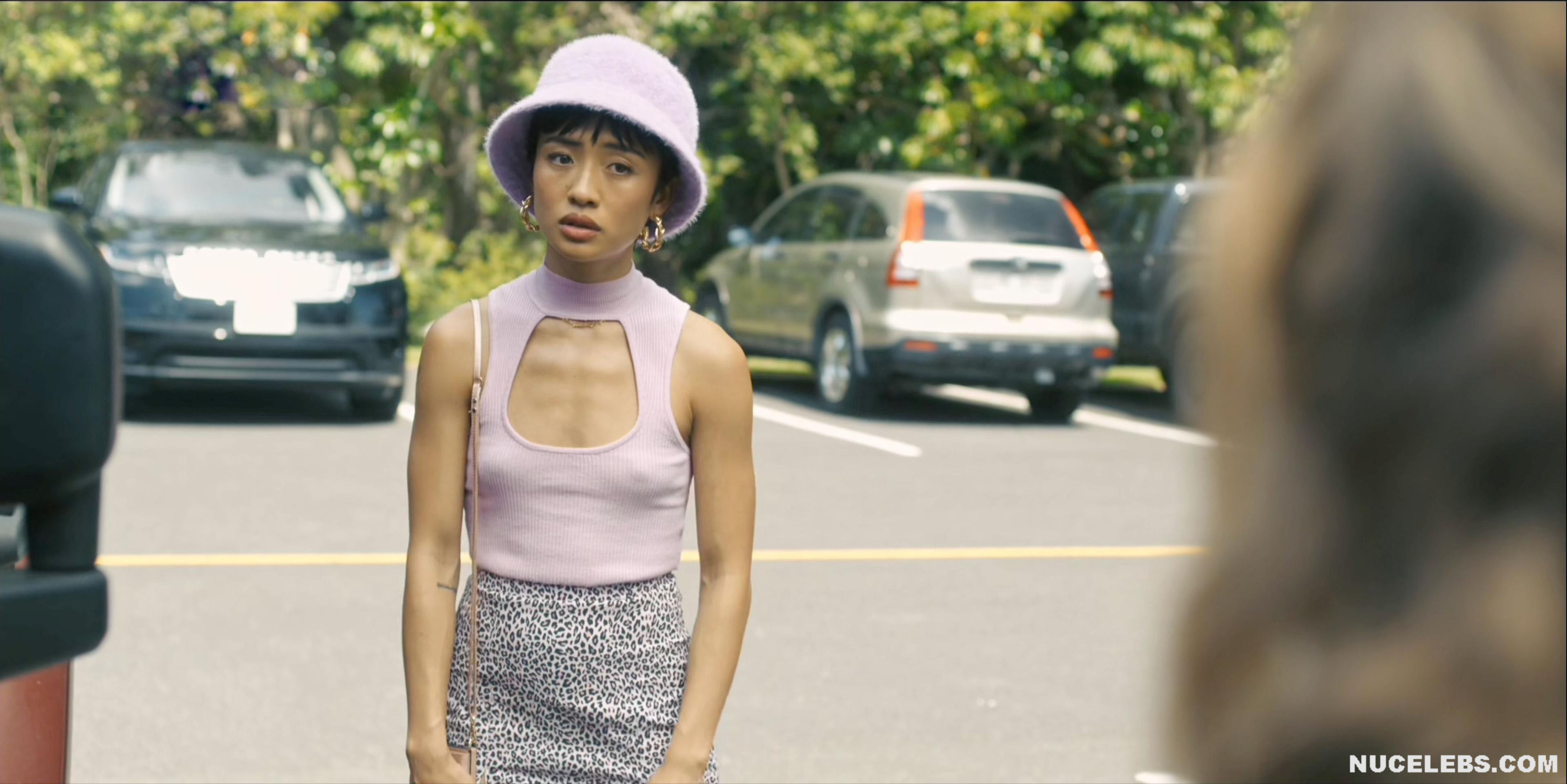 Check out her acting in I Know What You Did Last Summer (2021). The scene in which this American actress sits on the toilet with her panties down is undoubtedly unforgettable. However, you also will not be able to take your eyes off her poking nipples in a tight pink top in another scene. Her hot lesbian kisses with a blonde girl at a party, as well as in an intimate setting, will make your heart beat faster. Especially when Brianne Tju nude miniature tits with brown nipples were shown close-up when the girl caressed them!