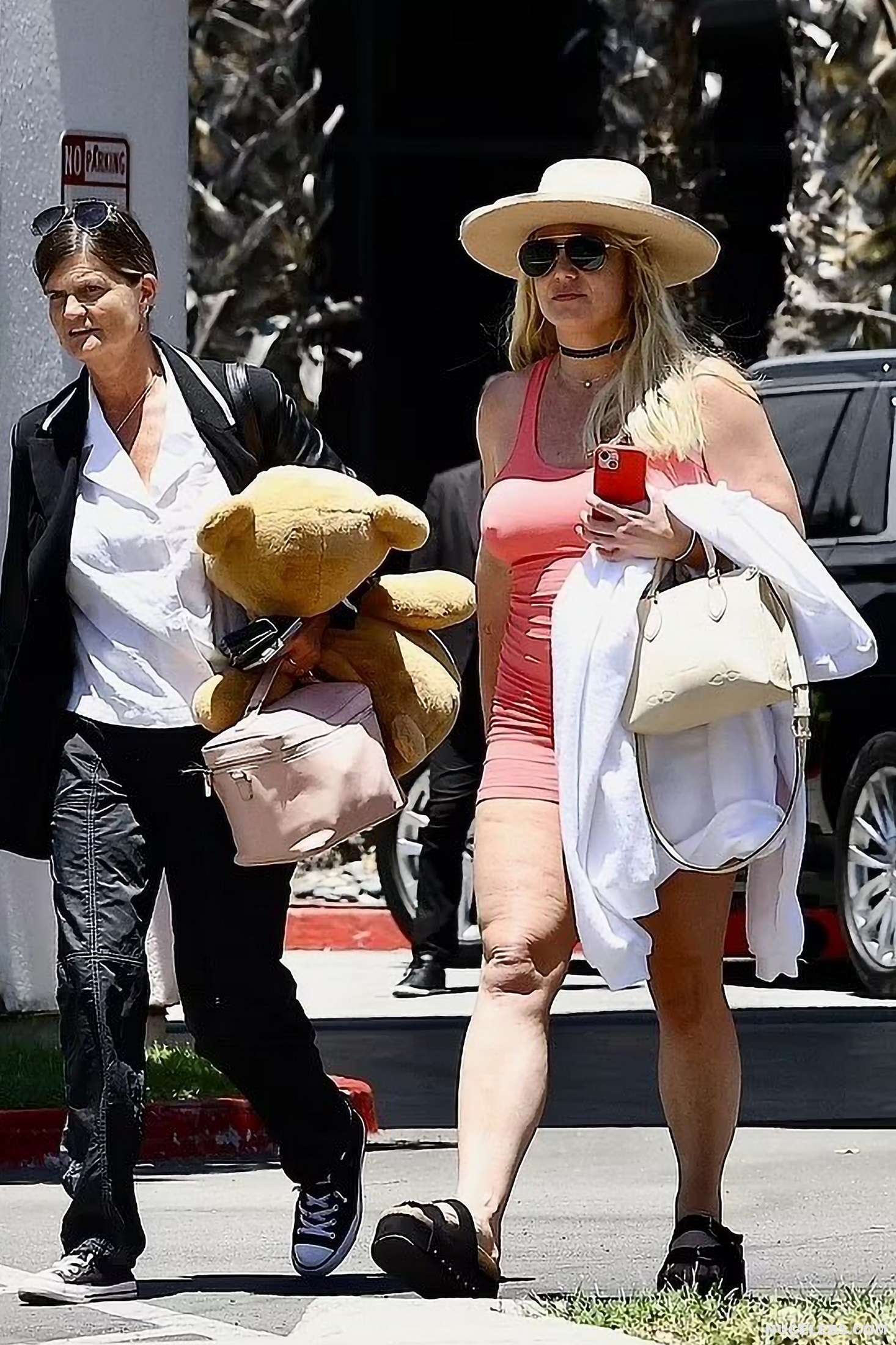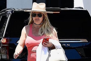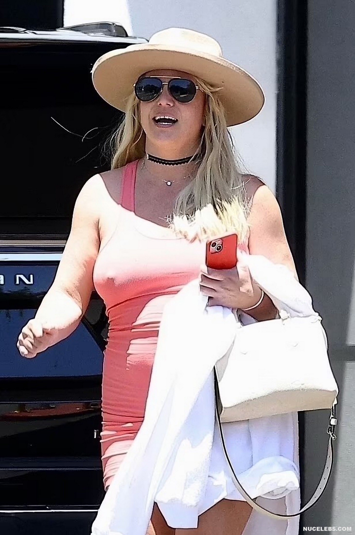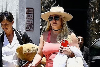 Are you already missing Britney Spears hot photos? Then the paparazzi took some photos for you! This singer was spotted in a straw hat, sunglasses and a pink tight dress. In her hands she was holding a beige handbag and a white coat. Britney Spears nipples were seductively sticking out through the thin fabric. In addition, her dress was pulled up when she walked and Britney Spears nude ass became visible.