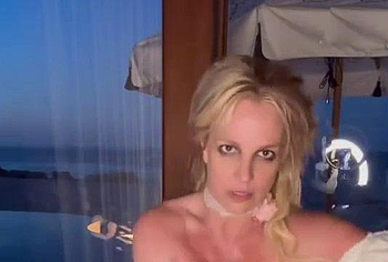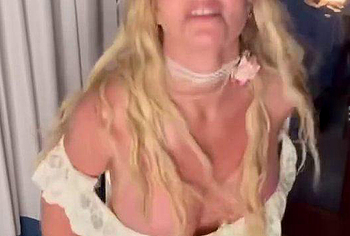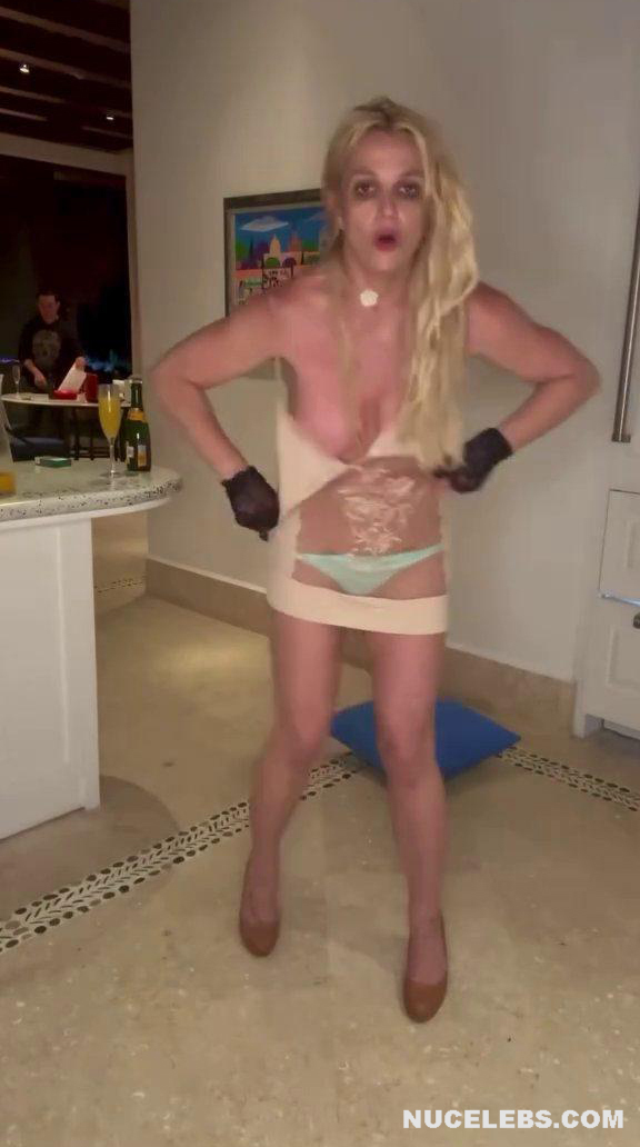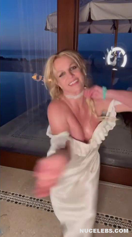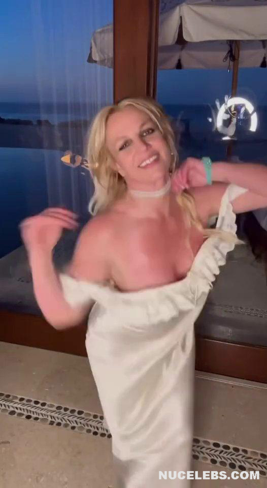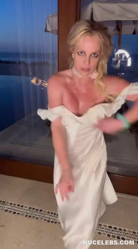 Britney Spears once again impresses with her nude boobies and hot dances. This celebrity put on a real show dancing in a transparent dress under which a skimpy bikini was visible. Her dances in a white dress were even hotter. Since the singer loves intense movements, the top of her dress slid down a little. And this was enough for Britney Spears nude titties with brown nipples to slip out for a few moments.