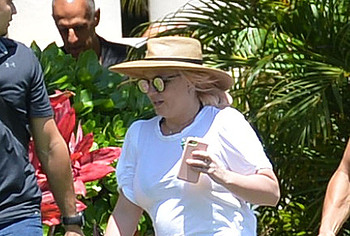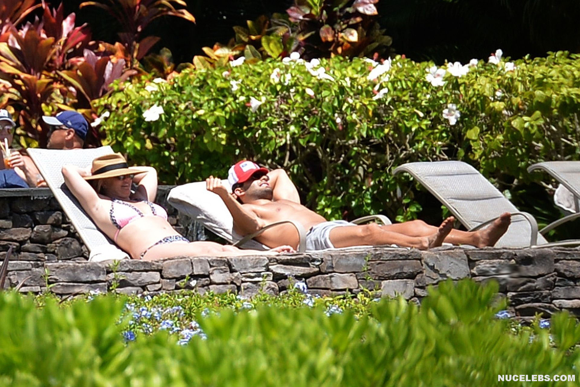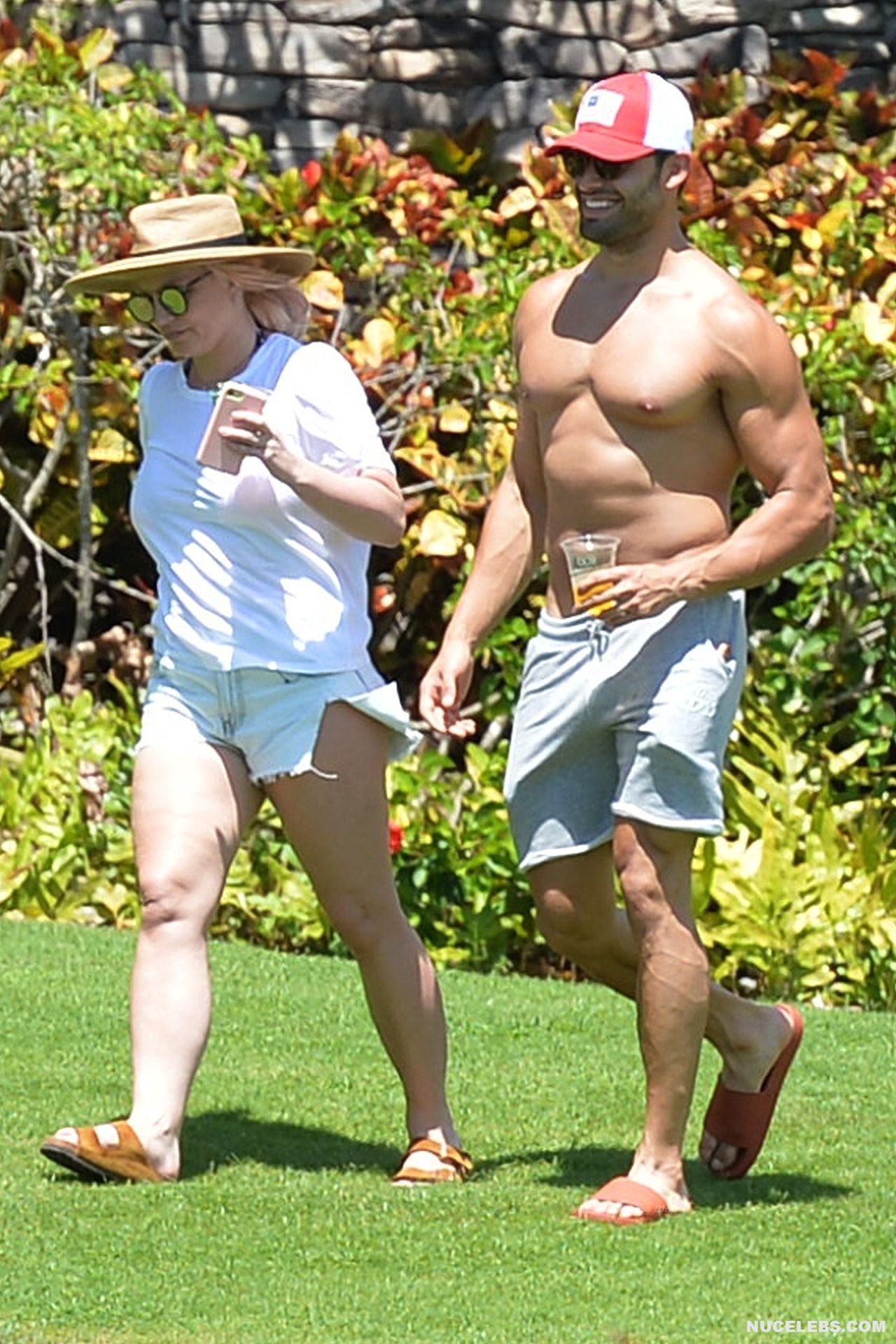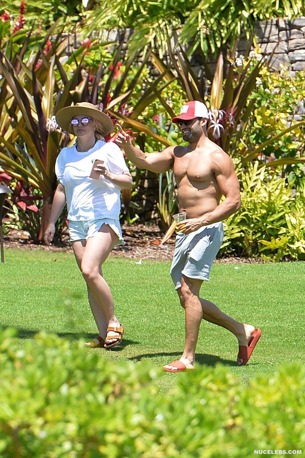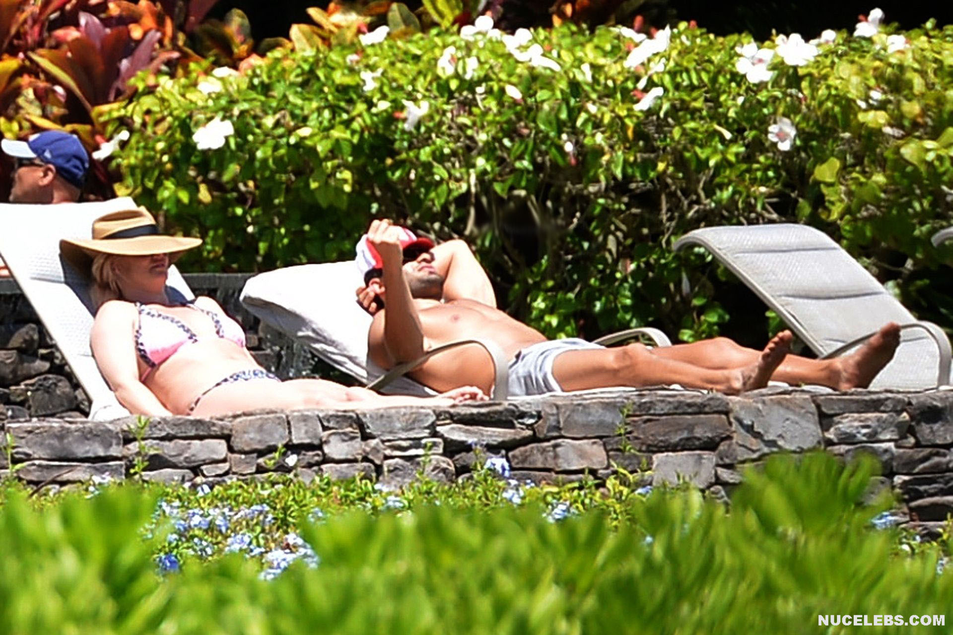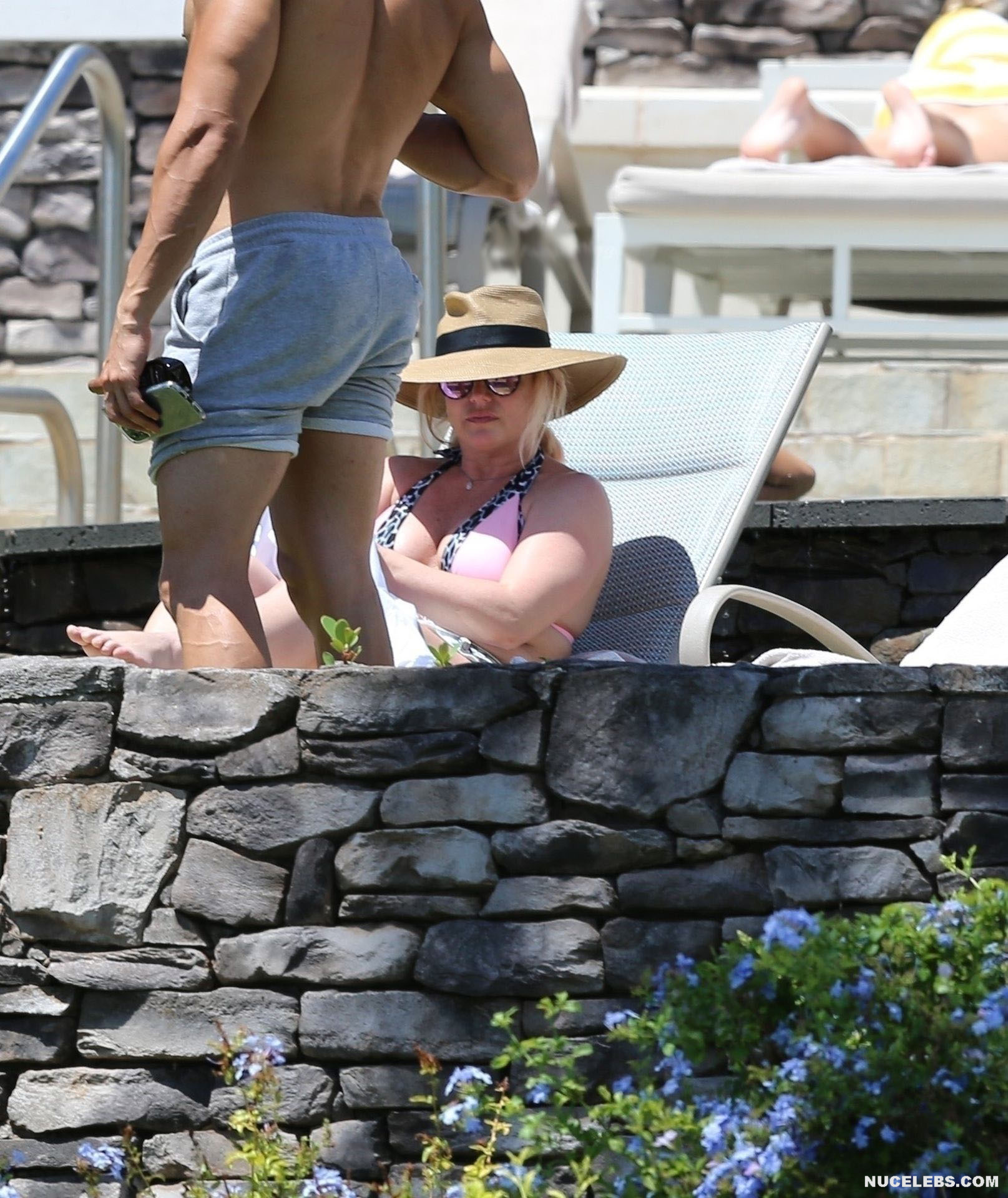 How does pop diva Britney Spears spend her free time? The paparazzi photographed this blonde on vacation with Sam Asghari. At first, the singer was dressed in a white T-shirt and shorts, but after a while she took them off. And while Britney Spears wasn’t completely nude, she looked super cute in a pink bikini she wore under her clothes. In particular, her wonderful titties in a pink small bra looked seductive when she sunbathed on a lounger.