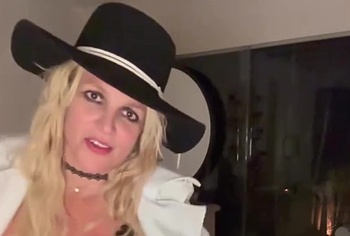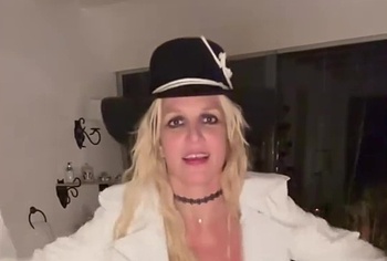 If you were wondering how Britney Spears is doing, then her striptease video will give you all the answers and even more! This hot blonde in a black hat and a white long coat put on a real show in front of the camera. During her strange dances, the singer took off her clothes, remaining in transparent black lingerie. Her titties in a lace bra looked very seductive. And Britney Spears periodically pulled her miniature thong down, hinting that her pussy could soon be visible.
