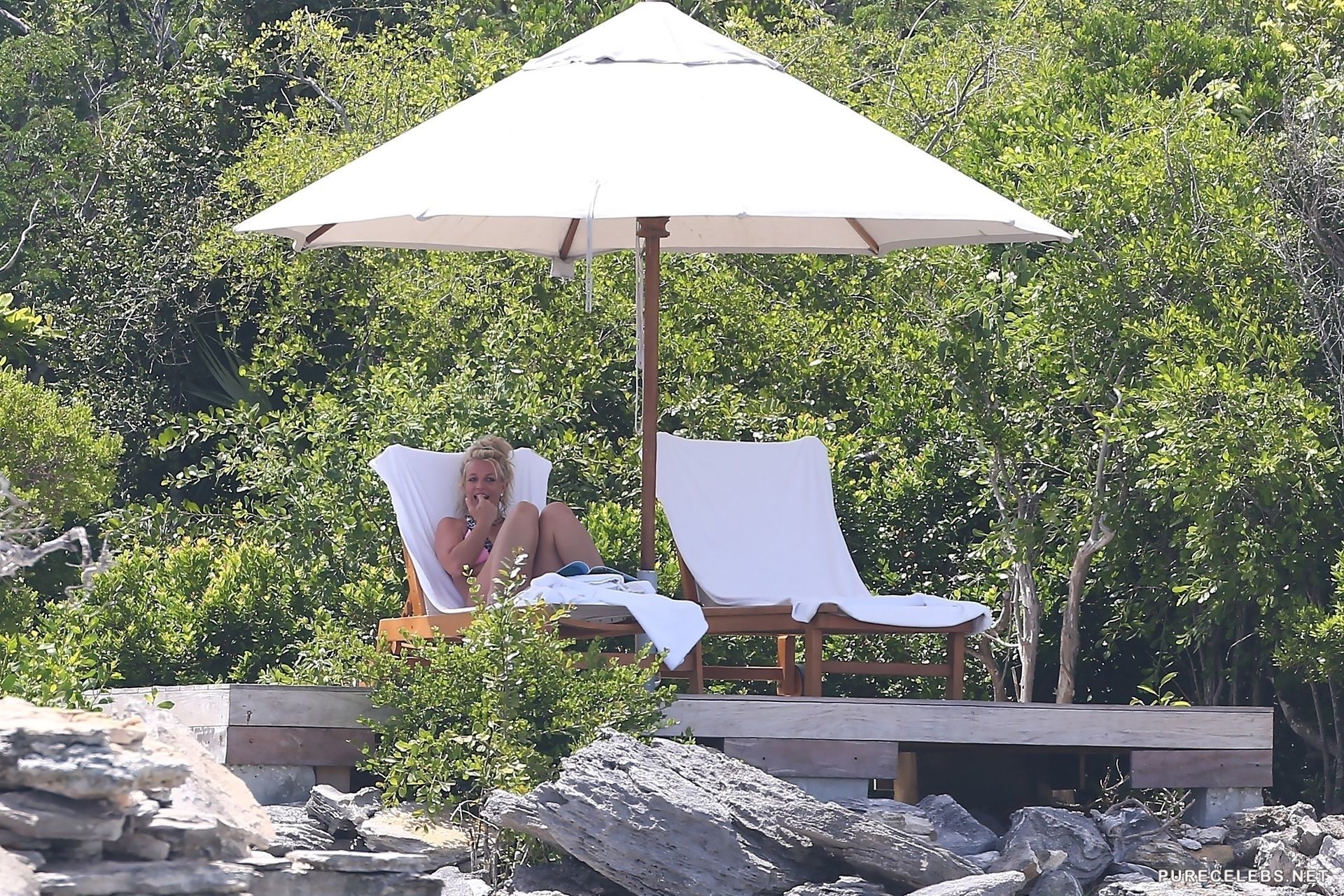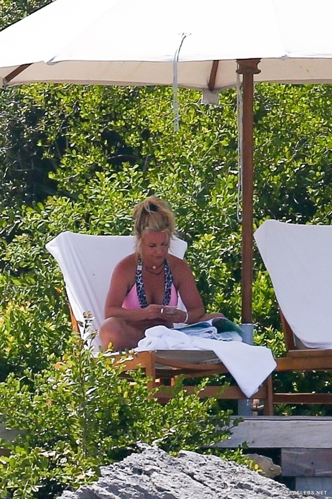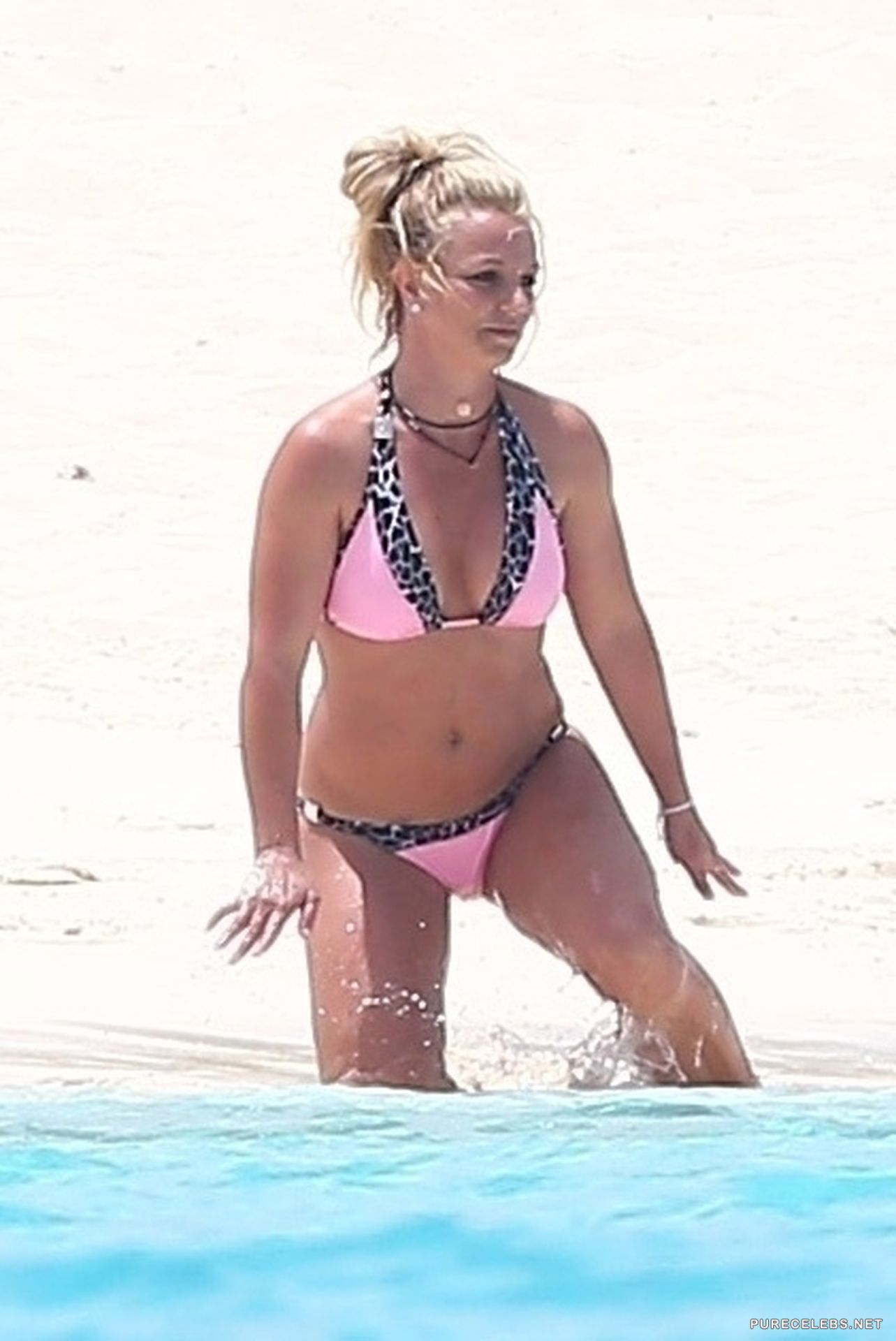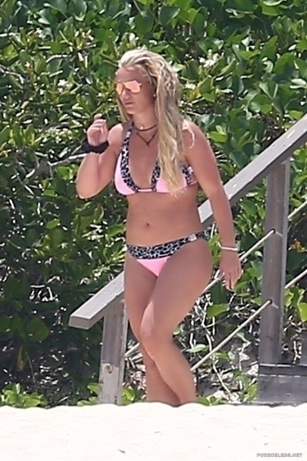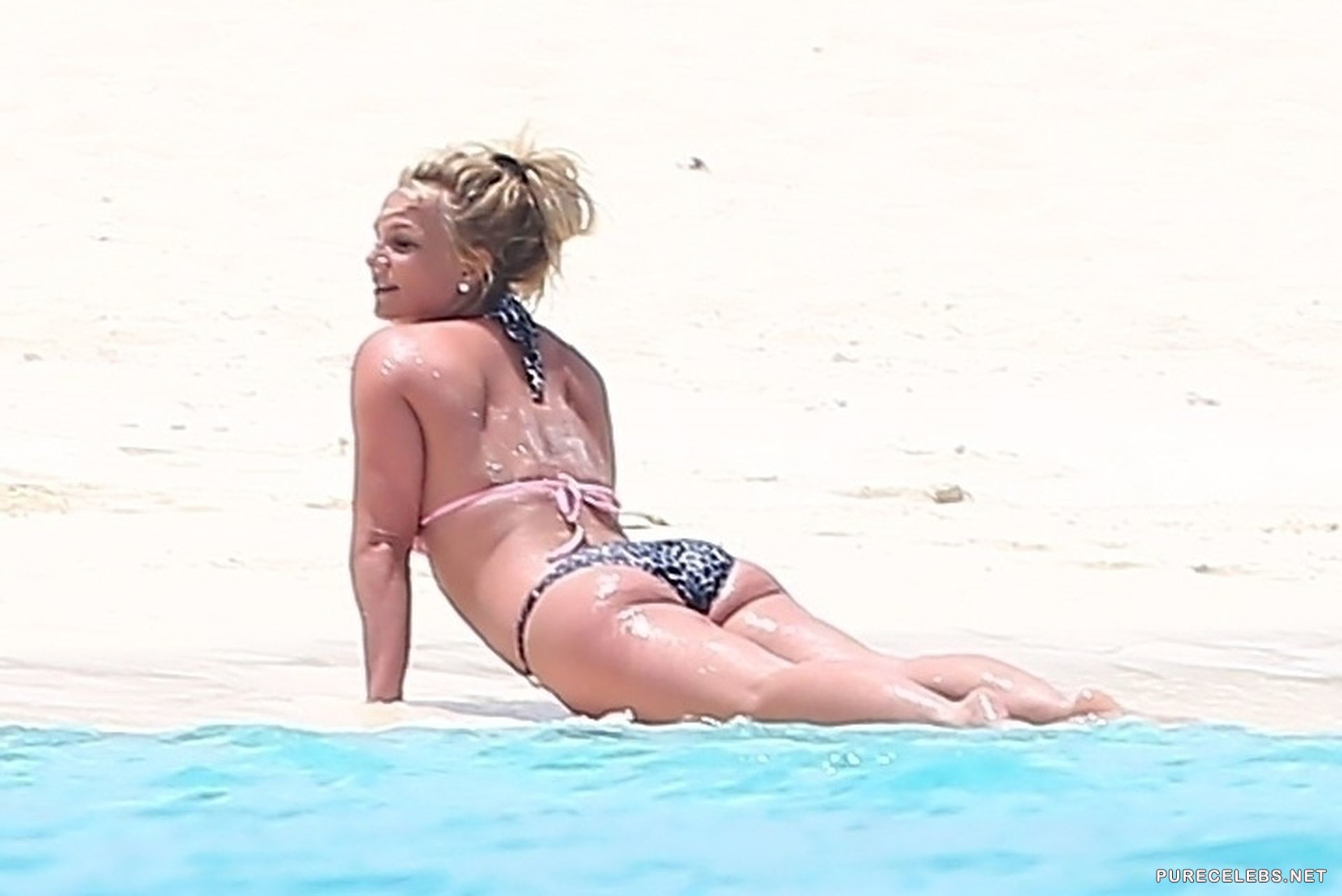 Paparazzi never leave the American singer Britney Spears alone and watch her tirelessly. Not so long ago, photos of this celebrity sunbathing on the beach were published. Hot beauty, dressed in a pink swimsuit with a black and white print, flaunted her gorgeous body. Her juicy ass looked very seductive when she ran on the beach in small panties. And her tits looked incredible, especially when she was leaning.