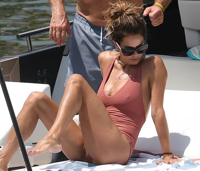 American actress Brooke Burke continues to thrill the fantasy of her fans with her non nude provocative outfits. So, the paparazzi photographed this celebrity as she walked down the street. The girl was dressed in gray sweatpants and a black bodysuit, and her face was covered by a mask. It seemed that the pants could slip off her at any moment, exposing Brooke Burke’s wonderful butt. By the way, a strip of her naked skin peeked out of her pants as she walked. Her juicy tits also looked very sexy in a tight top, right?