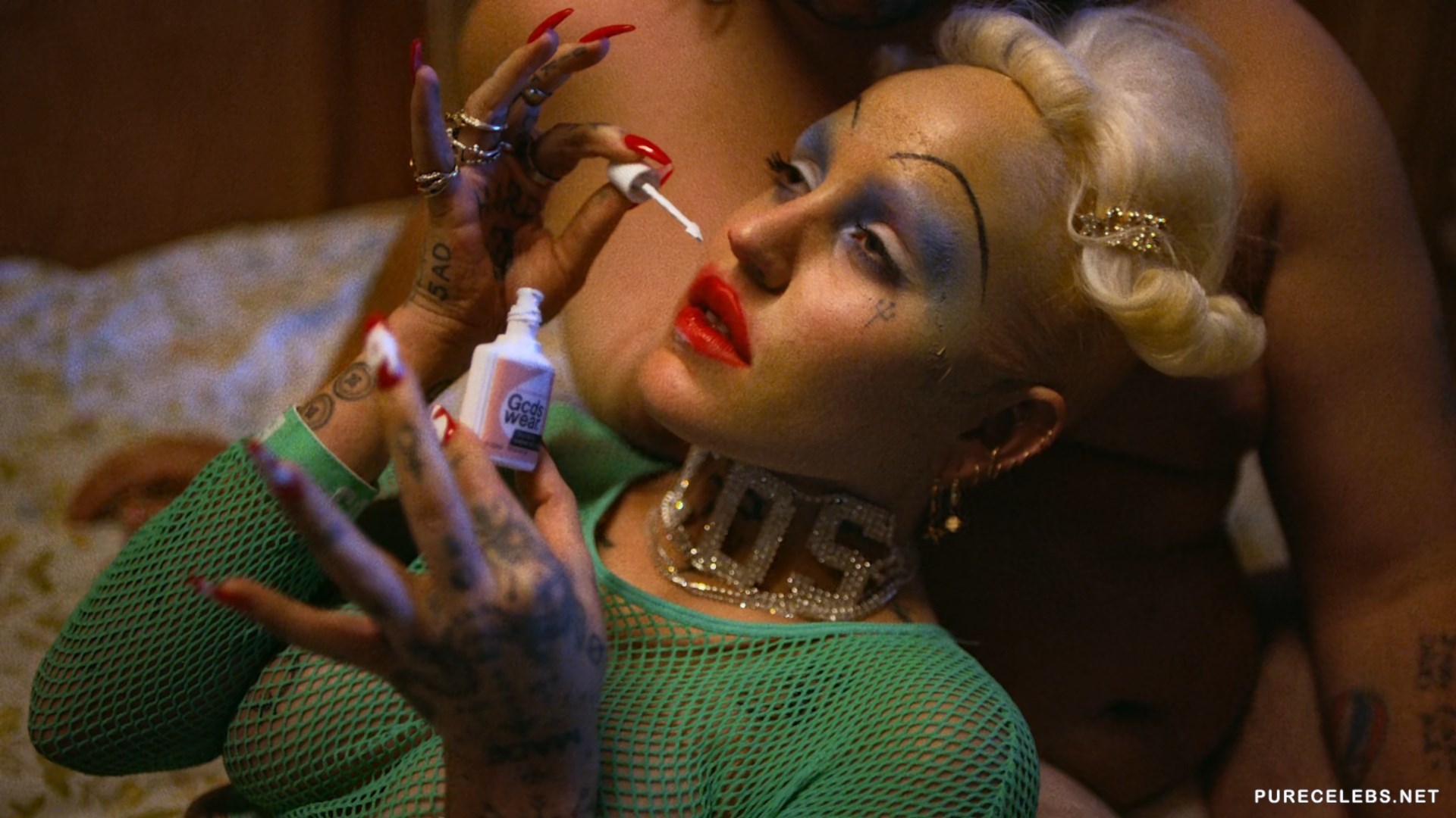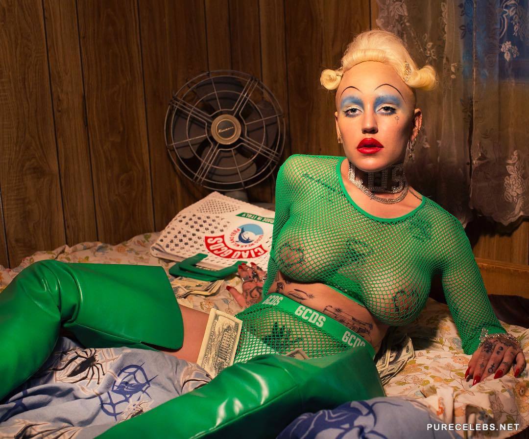 Brooke Candy is doing more and more outrageous things to increase the size of her fan base. She recently posed in a cheap hotel room lying on a bed covered with money. The setting was made to look like she and her boyfriend had robbed a bank, and now they are rolling around in their loot. She was wearing a mesh green top and underwear which allowed her massive, fake tits to take center stage during this shoot.