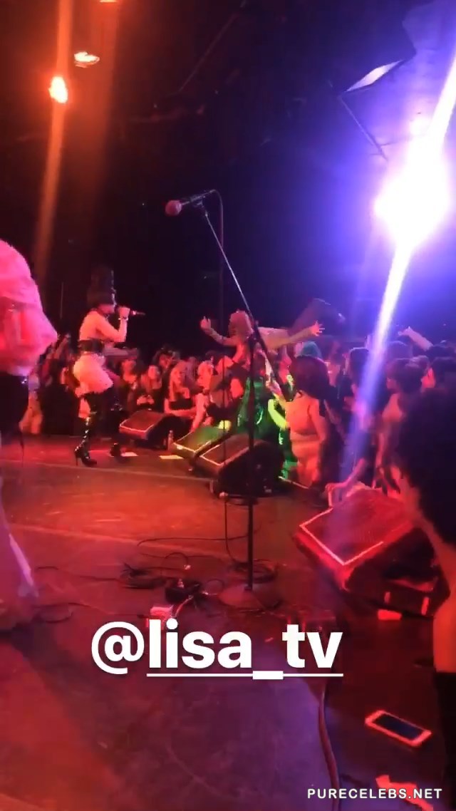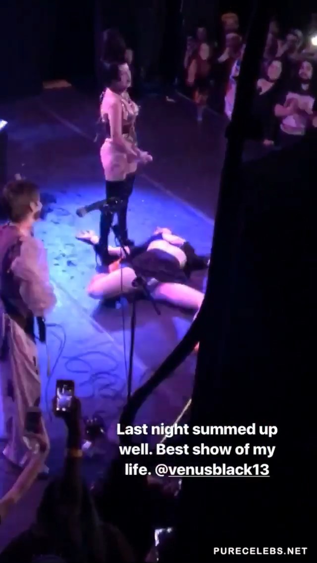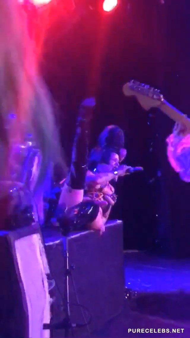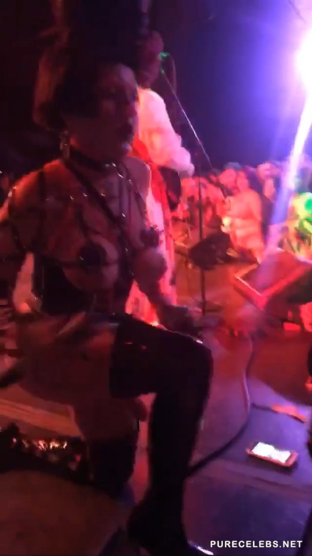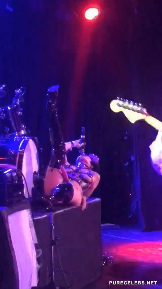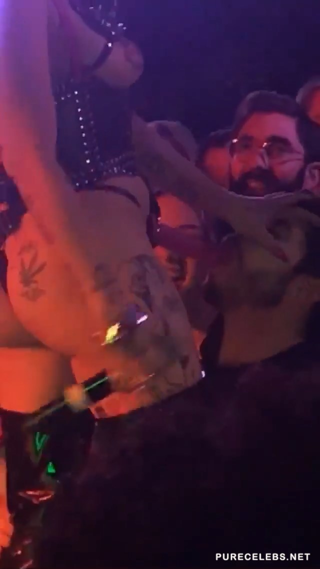 Former stripper Brooke Candy held a appeared at her concert in the Roxy Theater wearing a leather bodysuit with a strap-on dildo attached to it. She danced around on stage stroking her fake cock before shoving it down the throat of one of her fans in the front row. Rolling around on her back and playing with her pussy on stage made the show seem like a live porn shoot. Her provocative dance routine is enough to make any man hard.