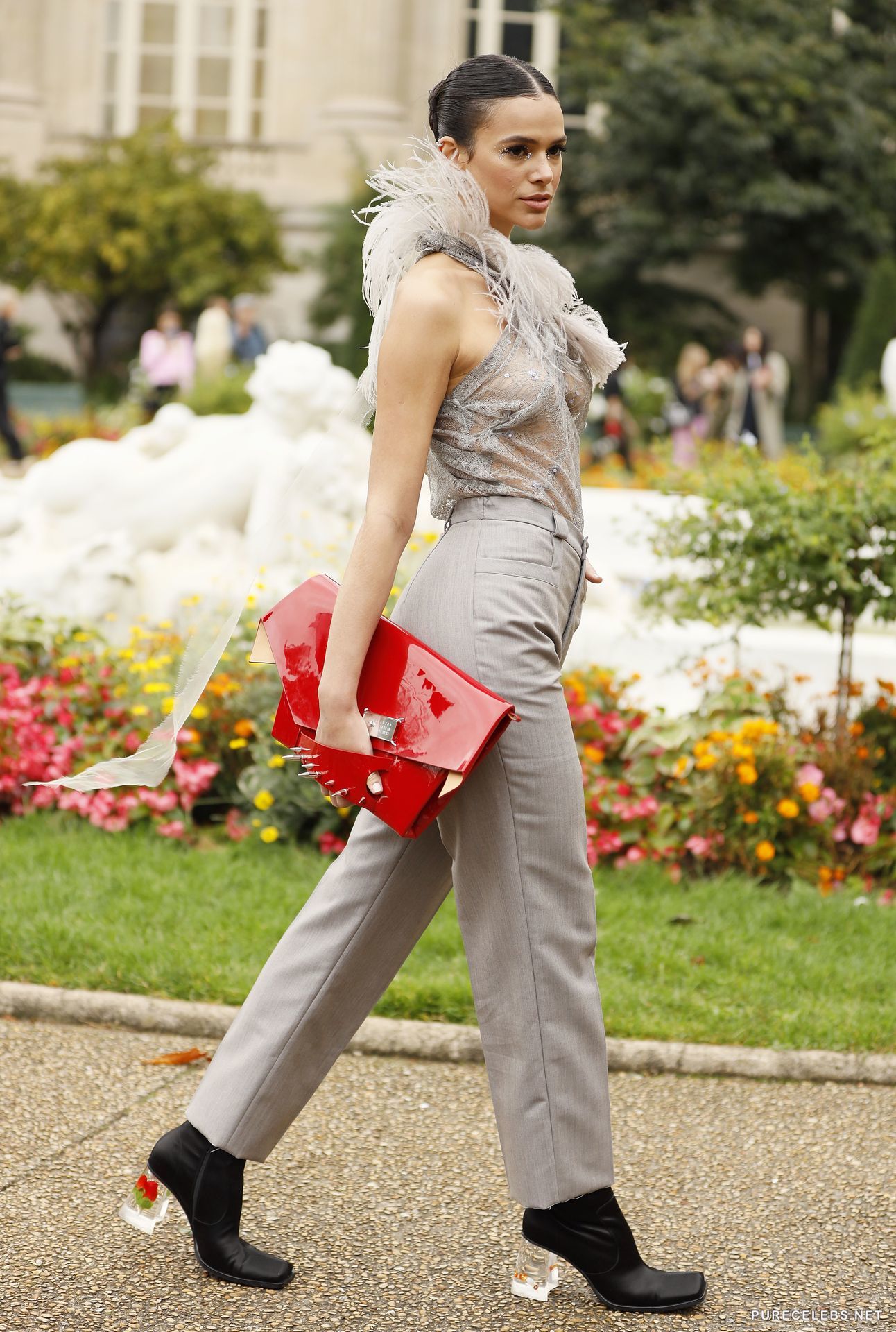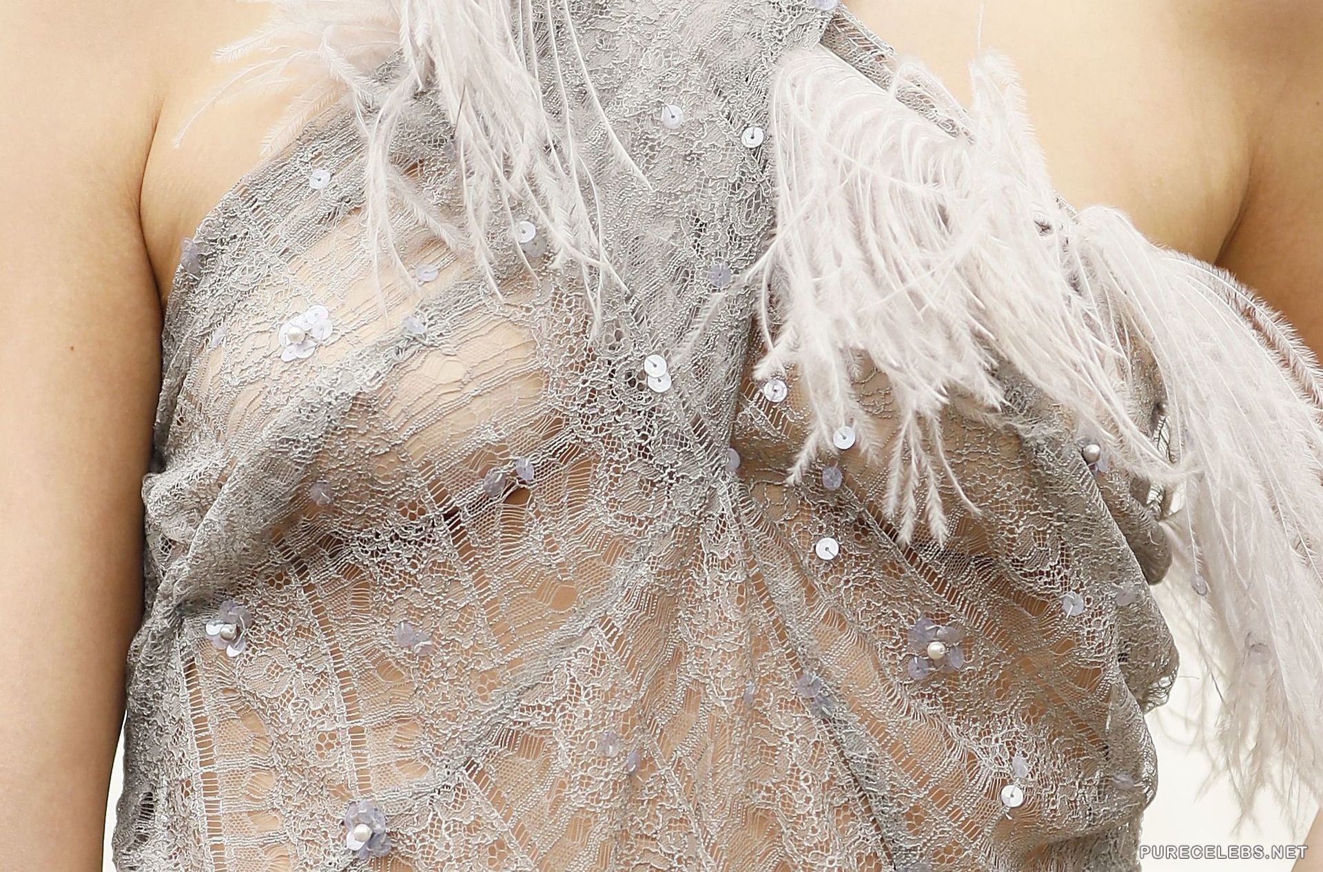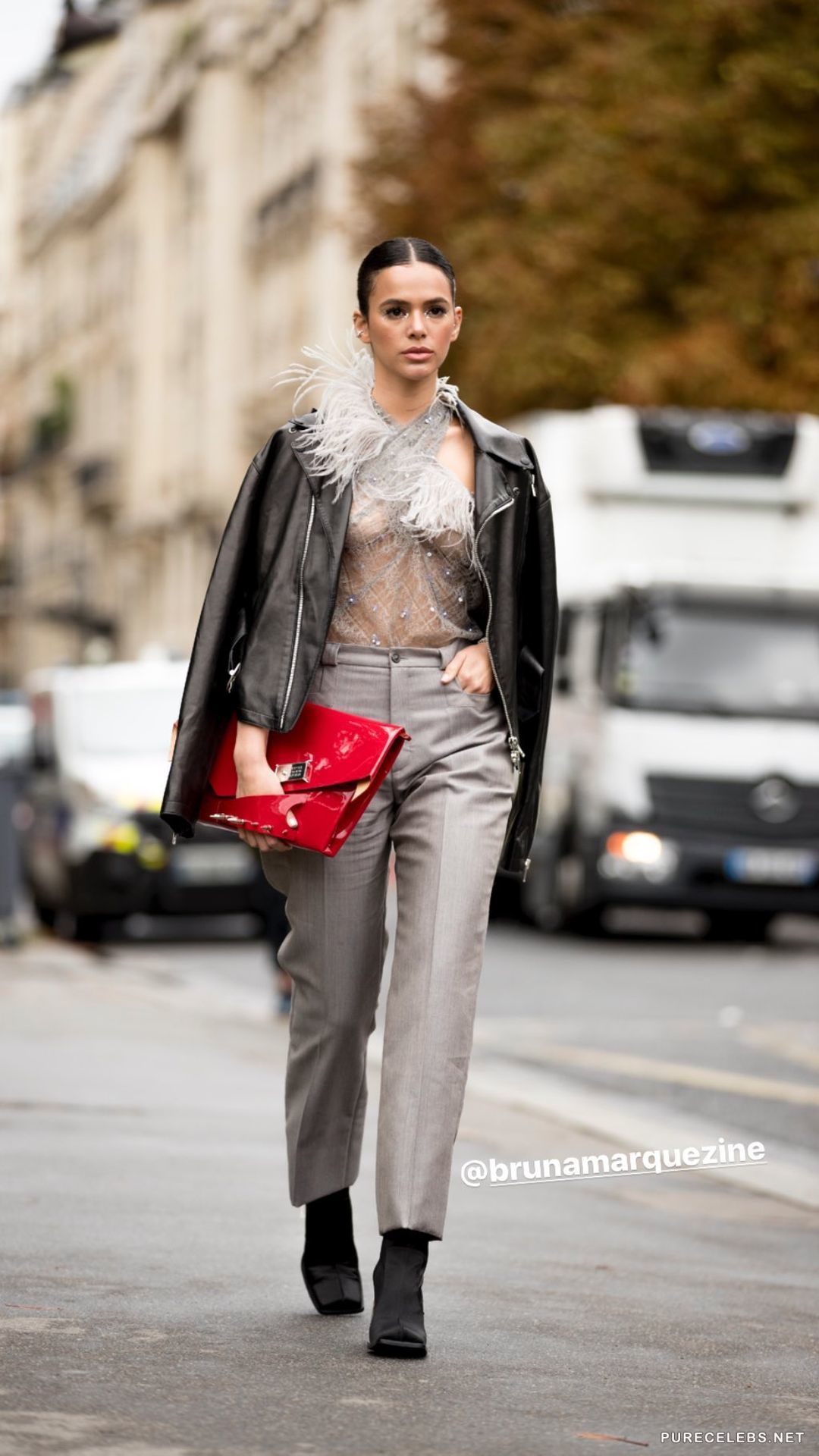 Brazilian actress Bruna Marquezine loves to be in the spotlight and feels confident when posing in front of the camera in revealing outfits. Not so long ago, this star was photographed in gray pants and a translucent gray top decorated with feathers. However, she was without a bra and from her sweet boobs with small nipples, which were clearly visible through her top, it was impossible to look away.