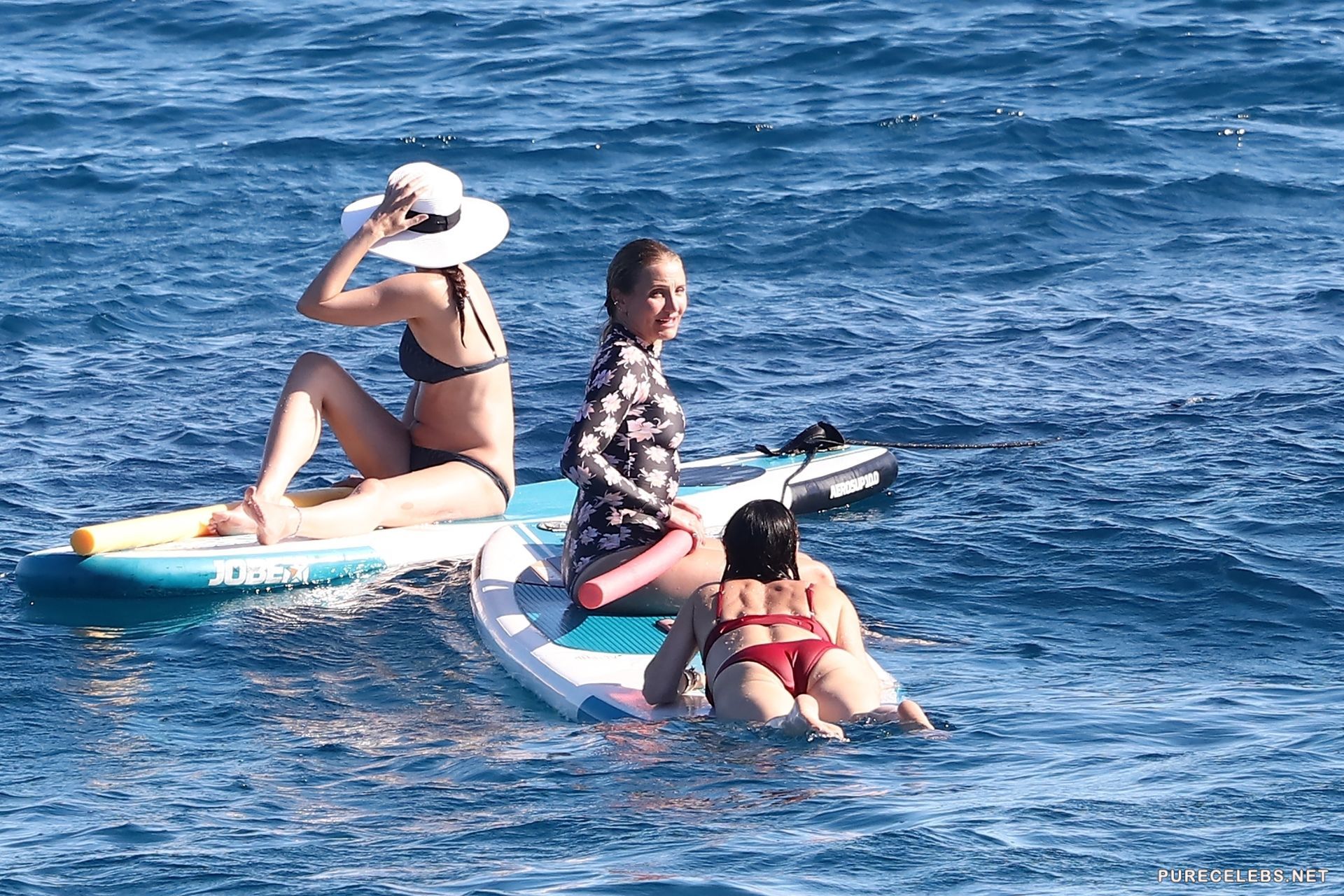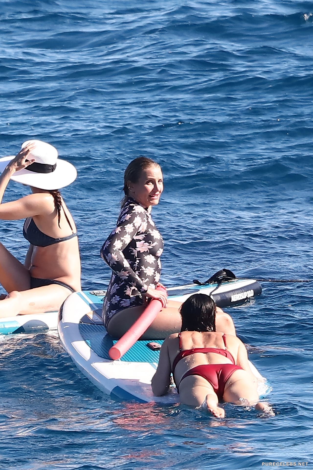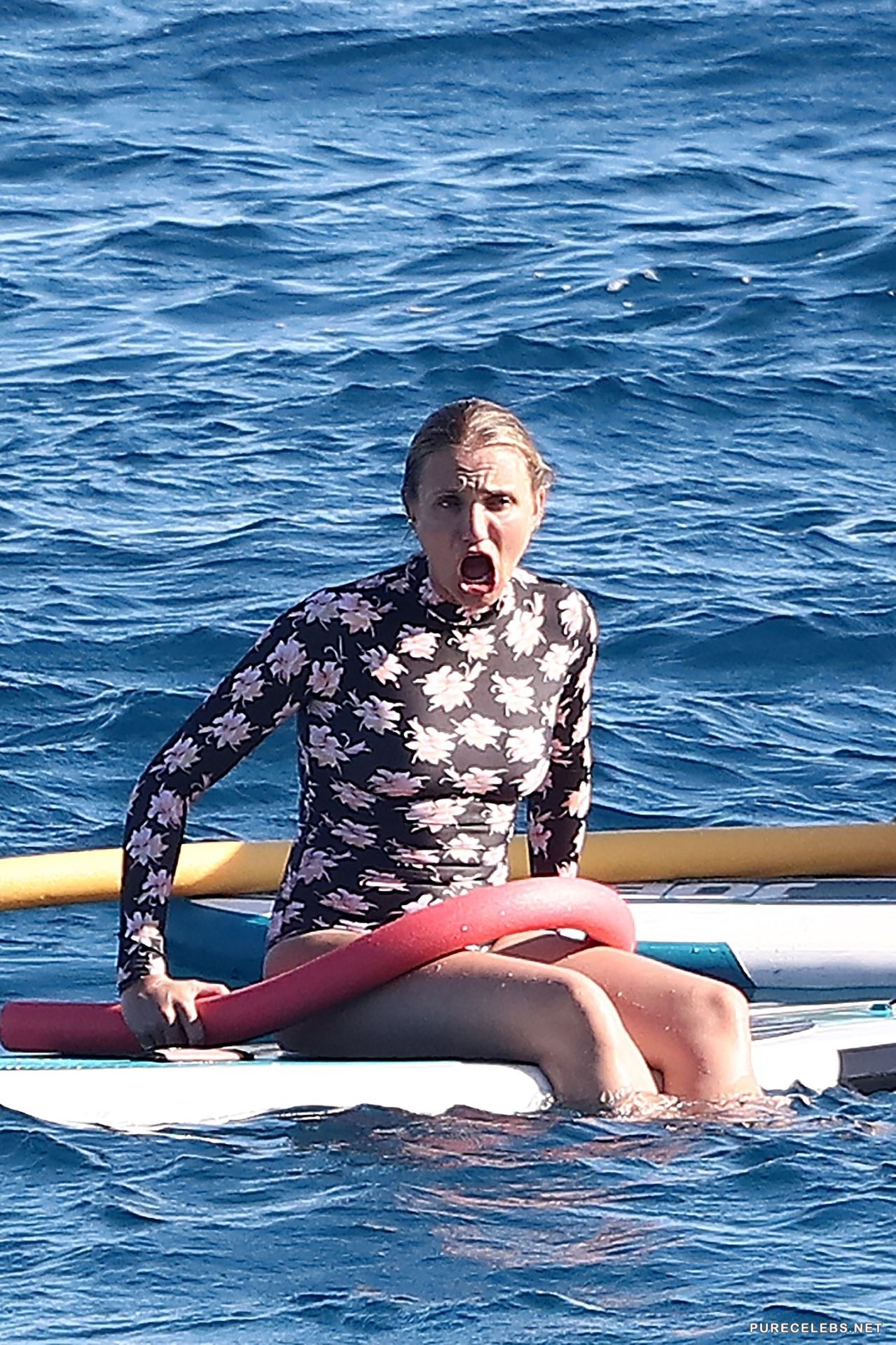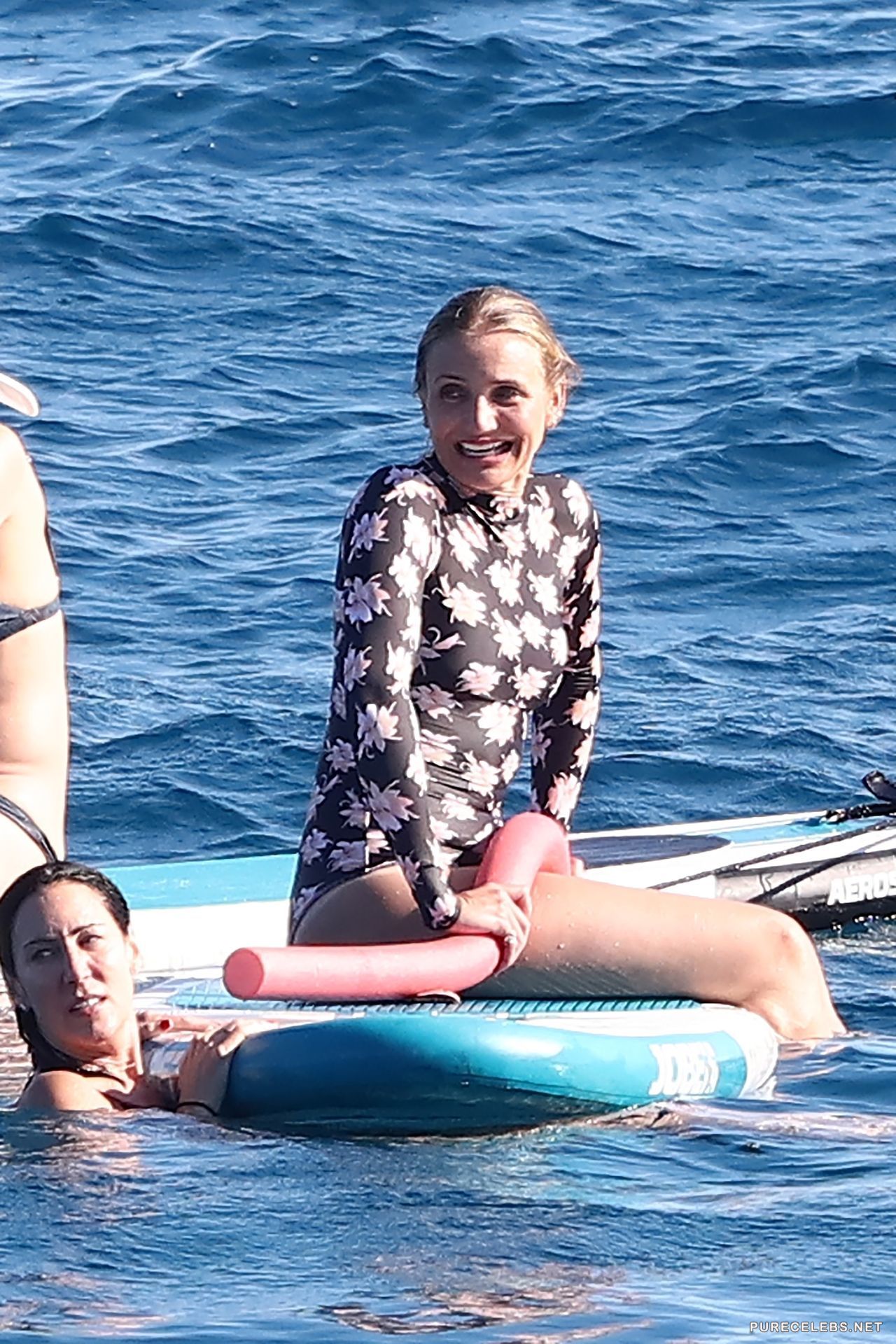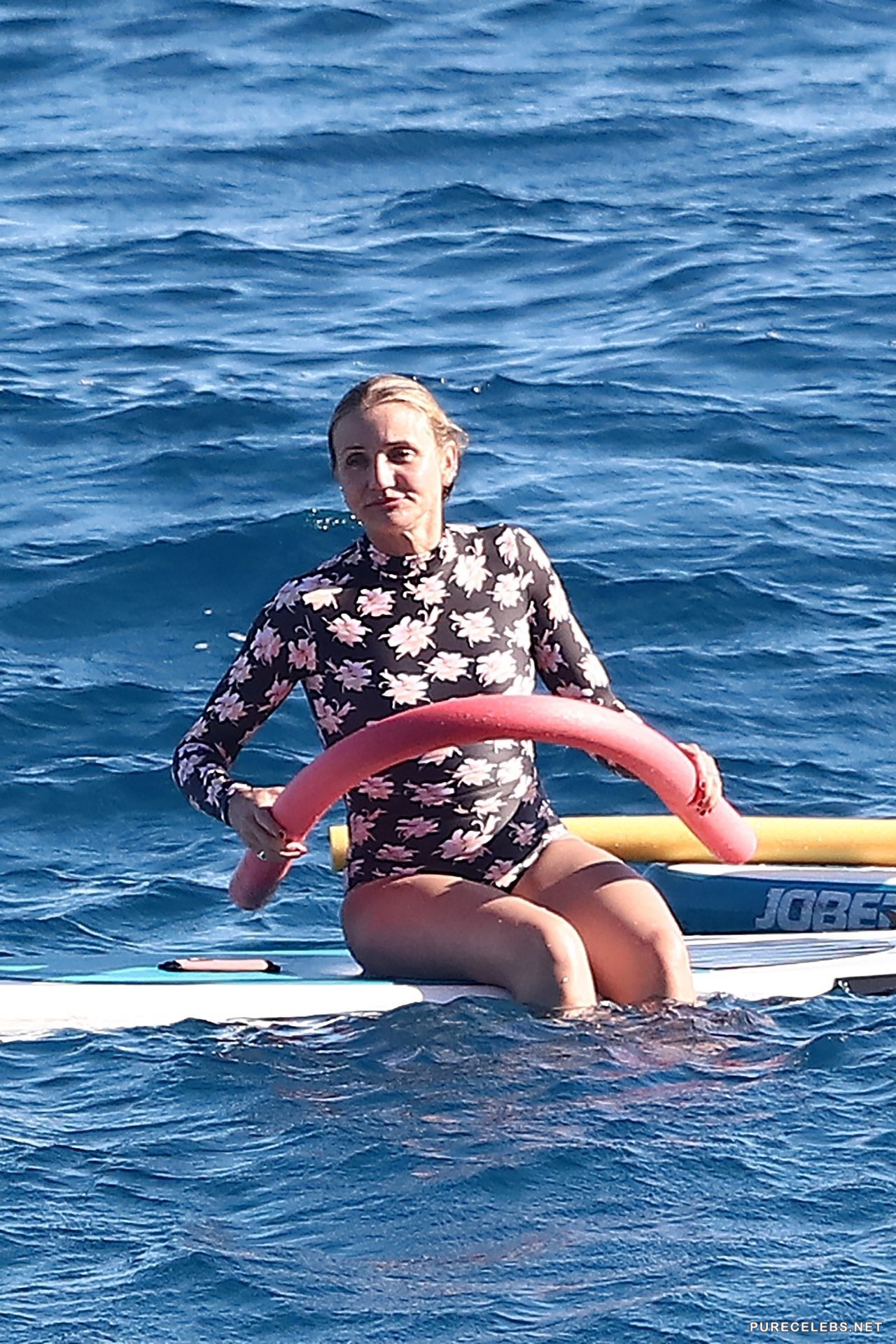 American actress Cameron Diaz, like many celebrities, prefers outdoor activities. For example, this star loves to sail. Recently, the paparazzi caught her when she swam on the board in the sea, flaunting her charming buttocks. The hot blonde was dressed in a black floral swimsuit, and her booty looked very sexy in it, especially when she came out of the water and drops flowed down her chic body.
