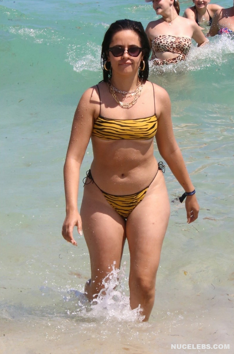 There is such a possibility that Camila Cabello may soon appear nude on the beach. At the very least, this 25-year-old singer’s bikinis are getting skimpier and skimpier every time. Recently, the paparazzi photographed this star as she emerged from the sea. The bottom of Camila Cabello’s nude tits peeked out of her petite yellow animal print bra. Also incredibly sexy was her big peach ass in a tight thong as she walked down the beach.