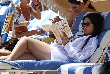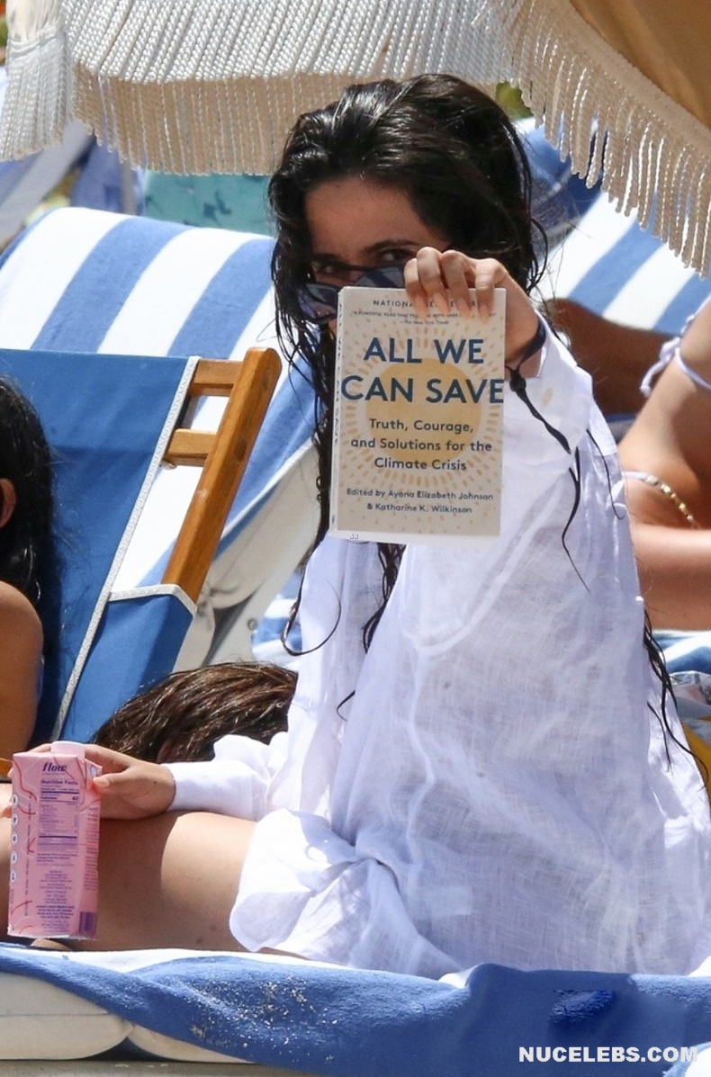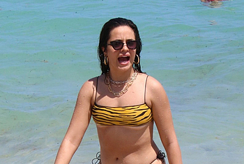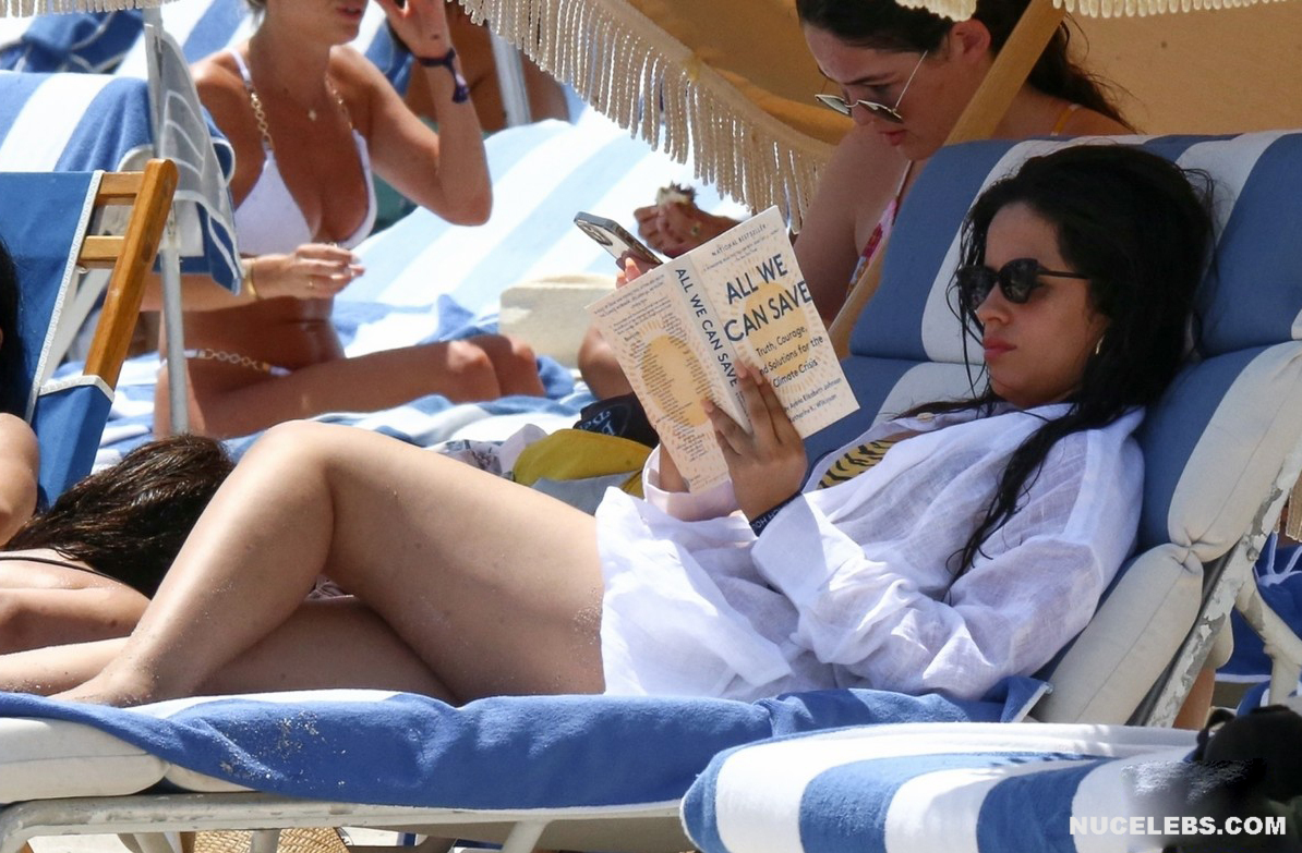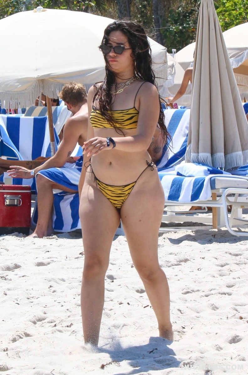 There is such a possibility that Camila Cabello may soon appear nude on the beach. At the very least, this 25-year-old singer’s bikinis are getting skimpier and skimpier every time. Recently, the paparazzi photographed this star as she emerged from the sea. The bottom of Camila Cabello’s nude tits peeked out of her petite yellow animal print bra. Also incredibly sexy was her big peach ass in a tight thong as she walked down the beach.