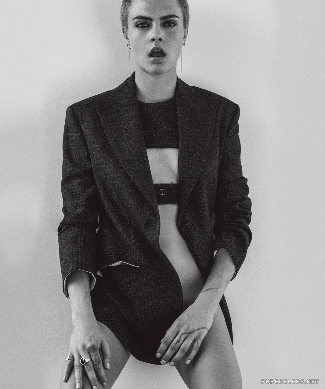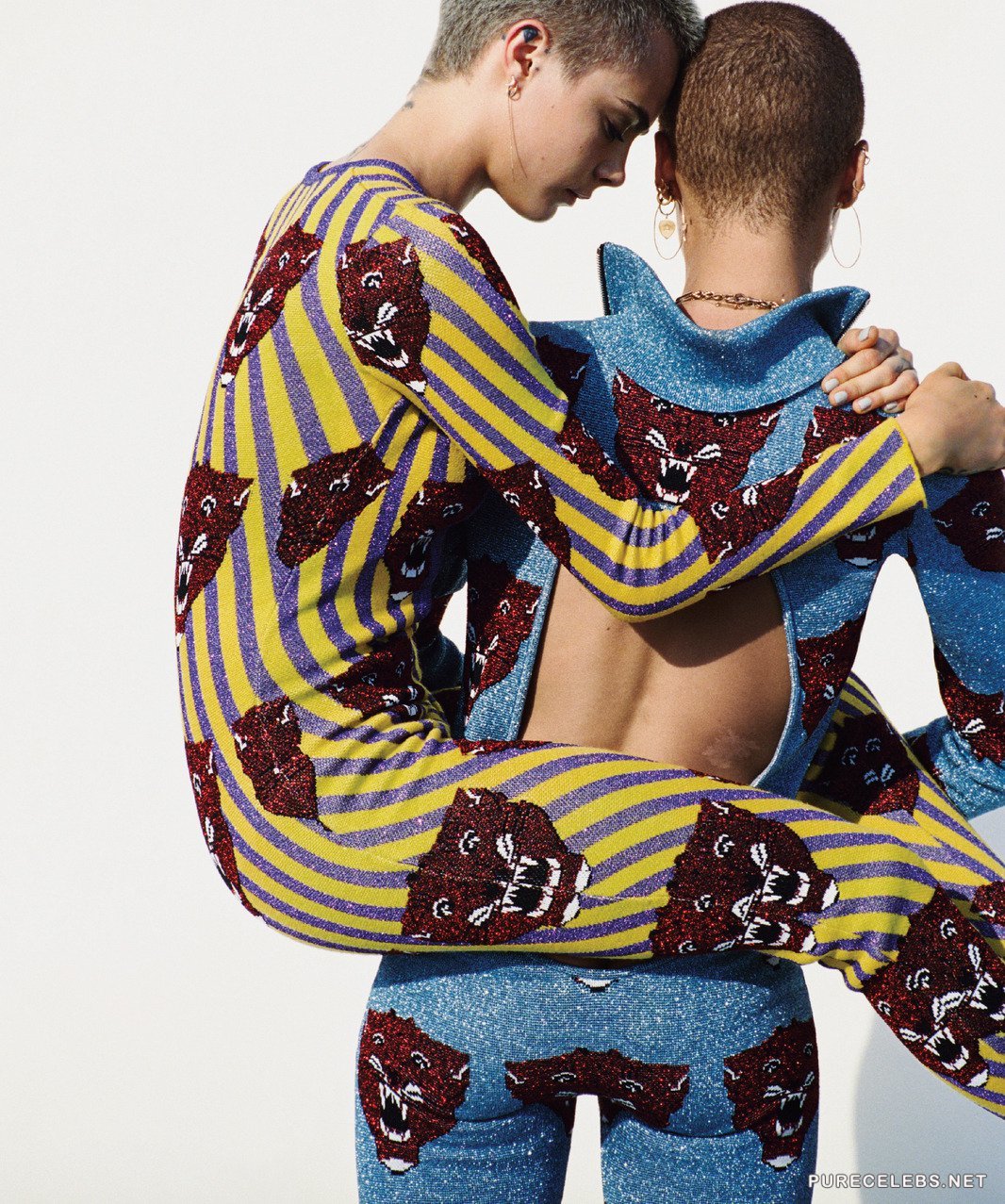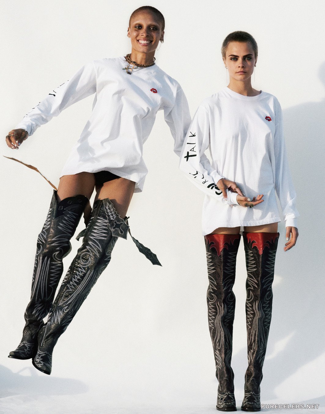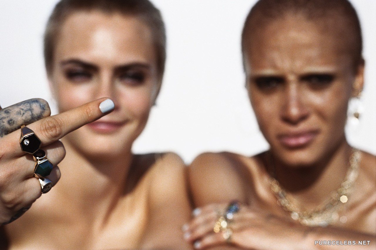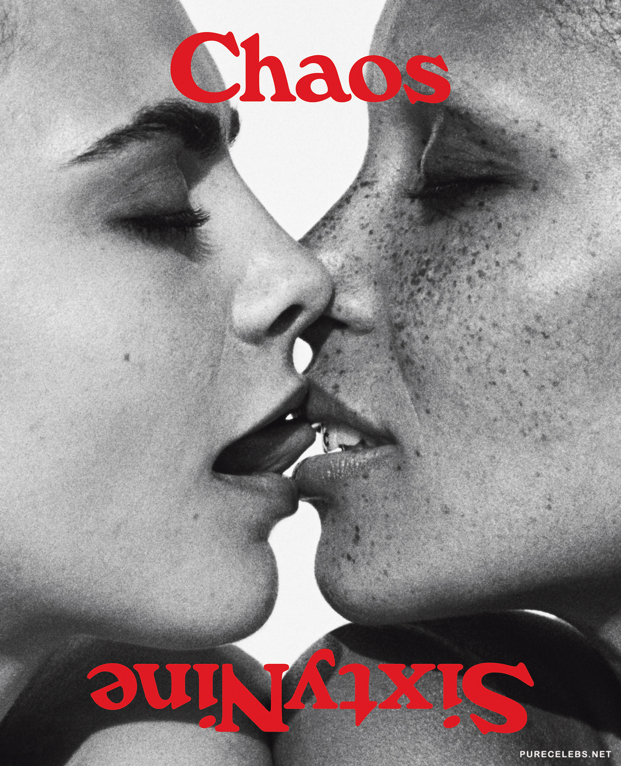 Cara Delevingne and Adwoa Aboah recently collaborated and posed topless for Chaos SixtyNine #1. The Skinny girls were photographed topless caressing each other softly, dancing and kissing passionately. The photos reveal what seems to be a true lesbian romance as the two girls spit water into each other’s mouth and exchange spit. We only regret not seeing the couple play with their private parts even more.