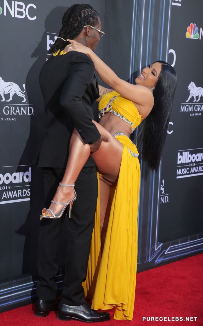 Recently, an American rap singer Cardi B found herself in uncomfortable situation when her upskirt moment was photographed. The star was dressed in the amazing bright yellow dress with a large slit. When her boyfriend kissed her, she lifted her leg sexually and her little yellow thong under her dress became visible and paparazzi, of course, managed to photograph this hot moment.