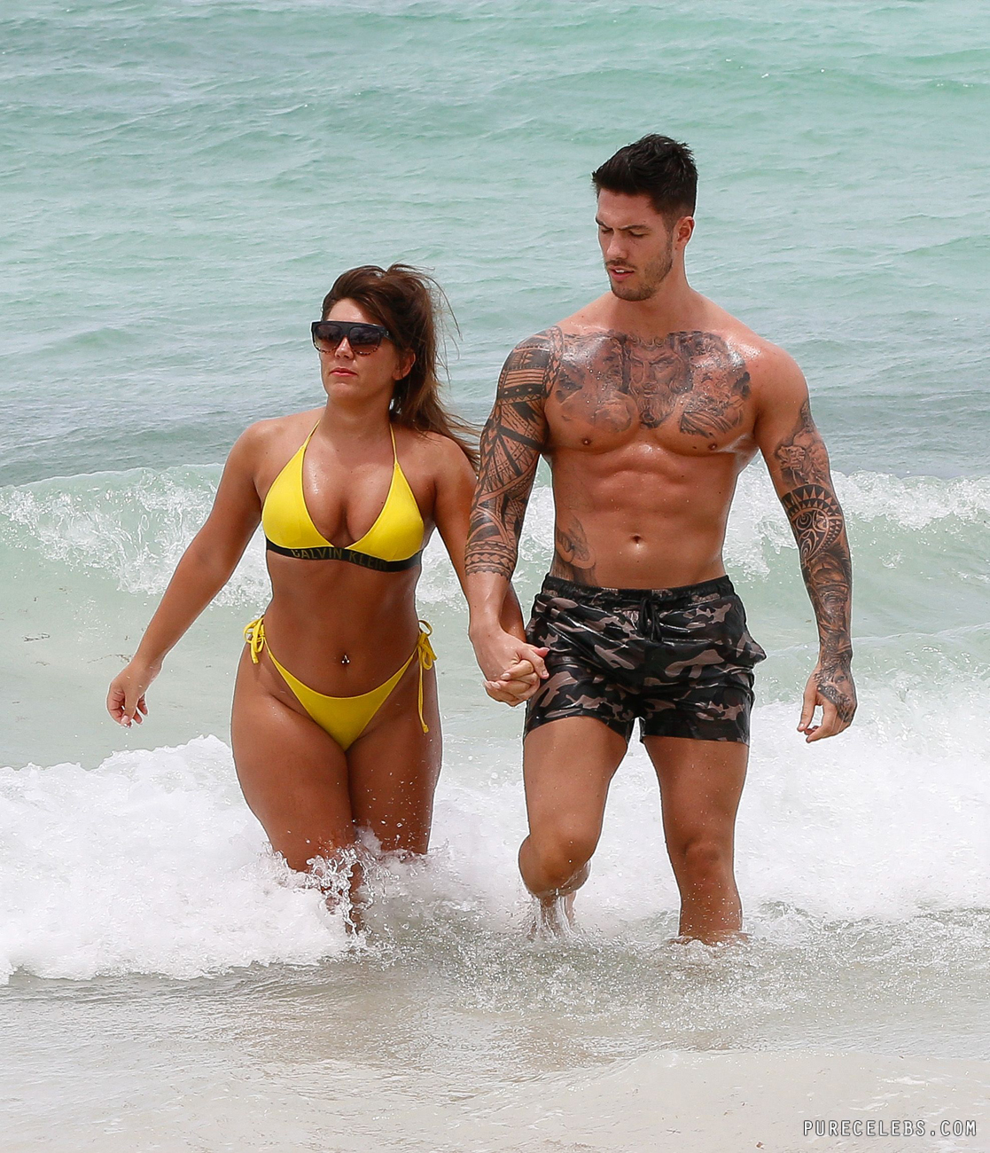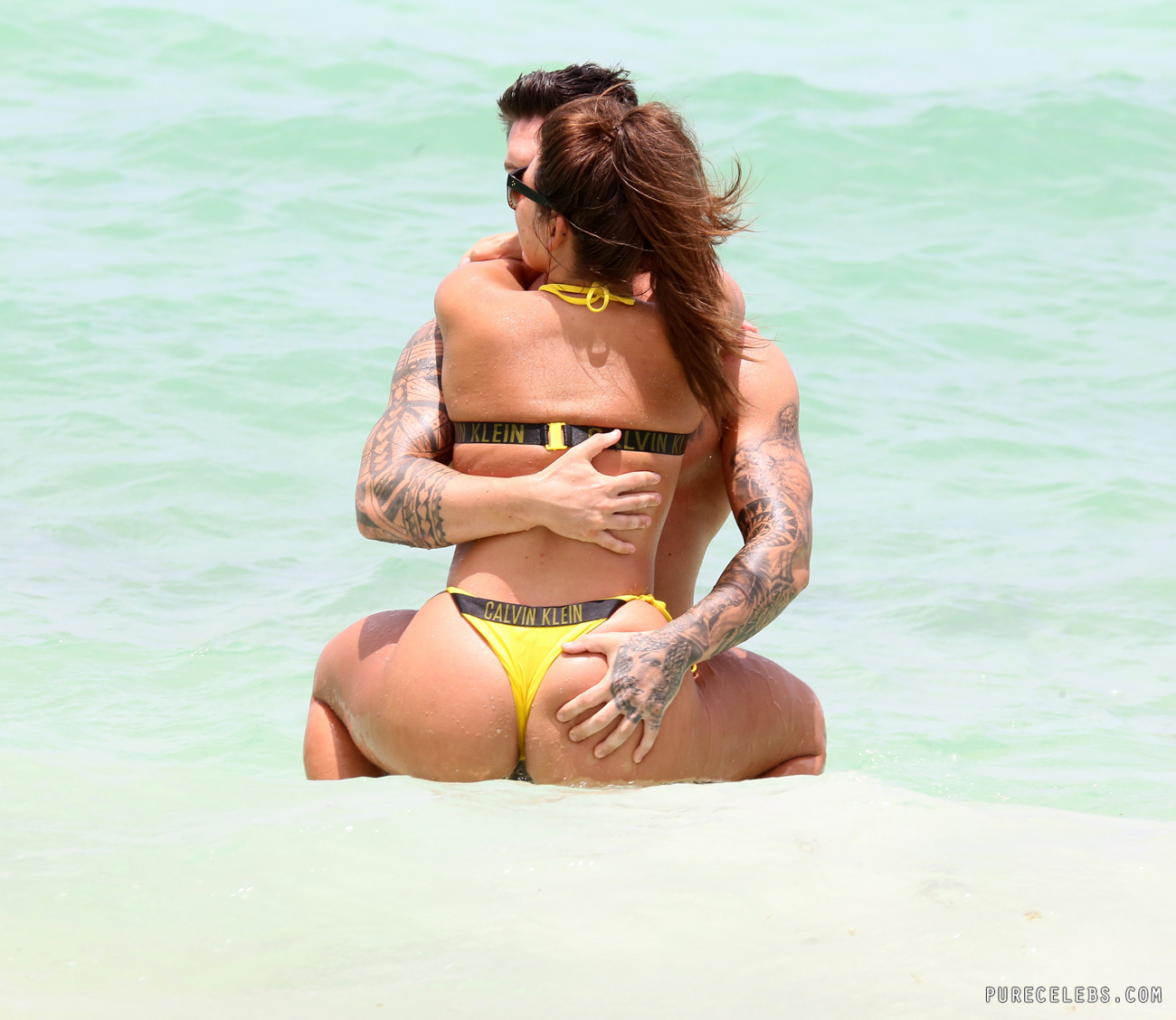 Hot beauty Carly Taylor was seen non-nude during her beach vacation. The girl was wearing a yellow bikini from Calvin Klein, which perfectly emphasized the curves of her stunning body. Her huge breasts looked chic in a tight-fitting bra. She also decided to ride on her boyfriend’s back. She jumped on him, showing everyone her gorgeous huge ass in yellow thongs.