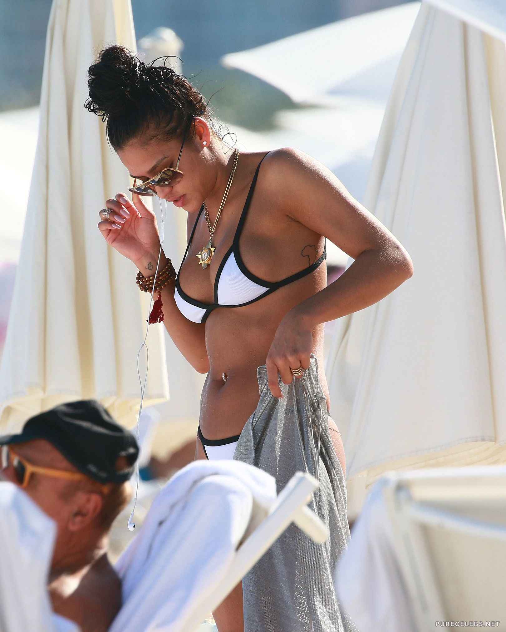 Singer and dancer Cassie Ventura was unaware that she was being careful watched by the paparazzi while soaking up the sun at a popular beach resort. The irresistible babe was photographed in a tiny white bikini which let all her best assets hang out. Cassie’s large breasts and plump round ass are the center of attention in these candid photos. We can’t help at admire her luscious curves.