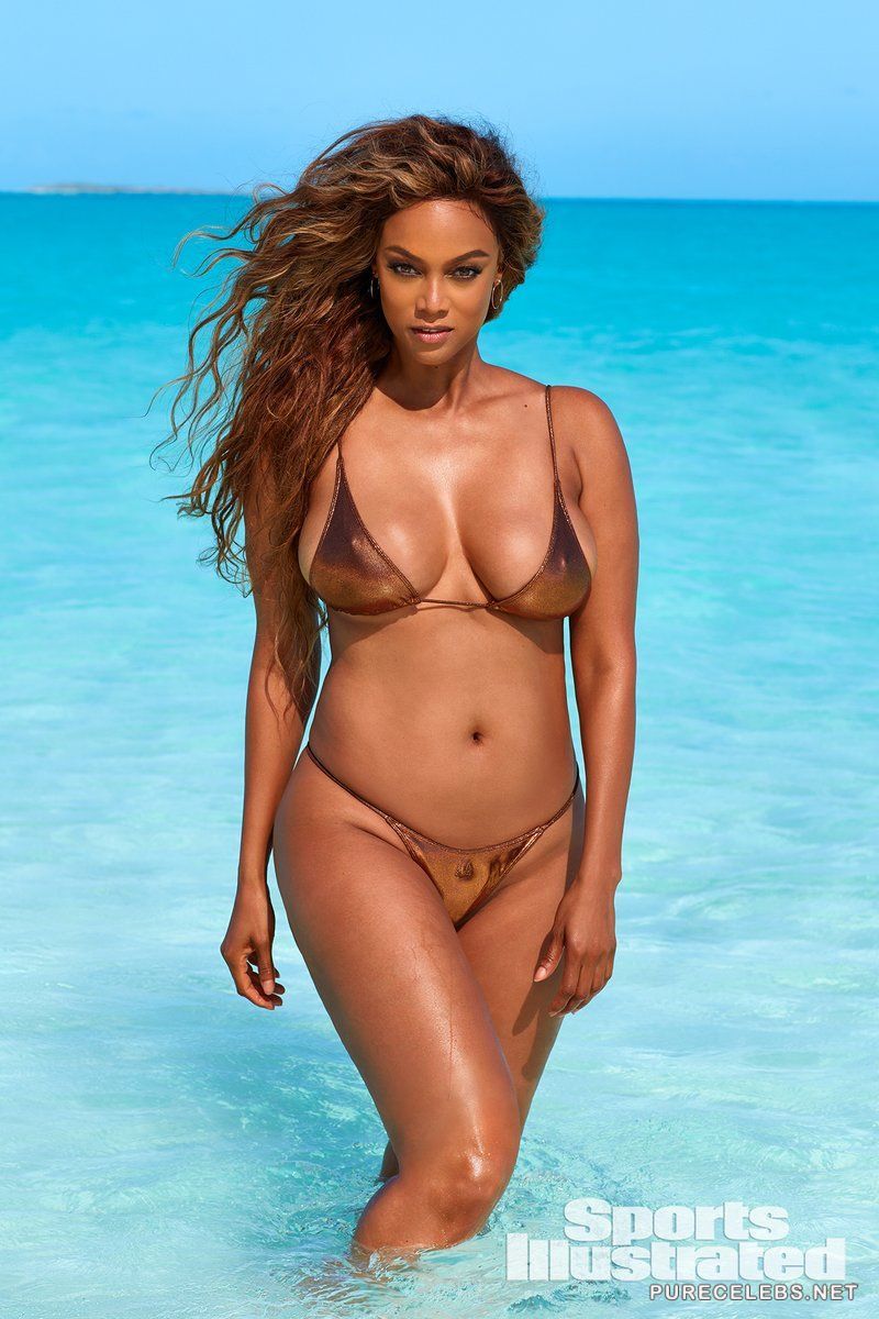 American supermodel Tyra Banks decided to keep up with the rest of celebrities and take a part in a candid beach photo shoot demonstrating her amazing body. The star posed in very provocative swimsuits, which almost didn’t cover her breasts, and some even left her breasts naked. For example, a celebrity had to cover her awesome boobs with her hands when she was photographed in a blue bathing suit.