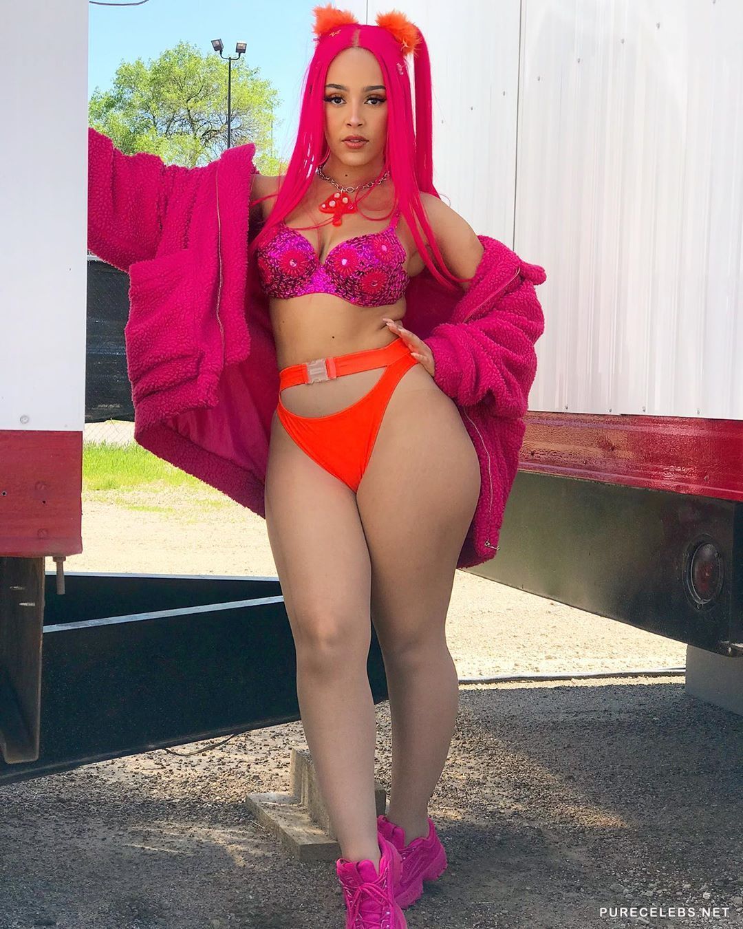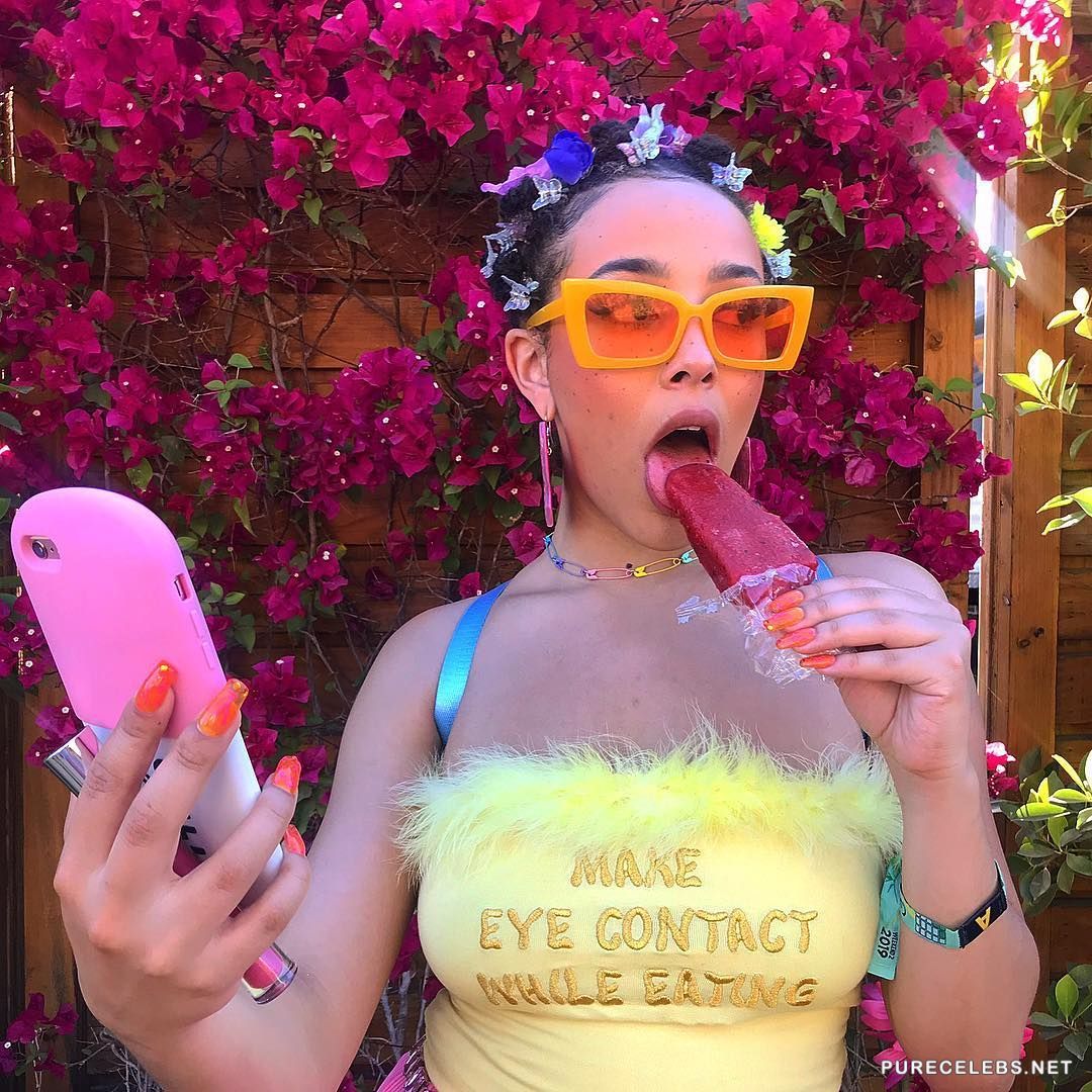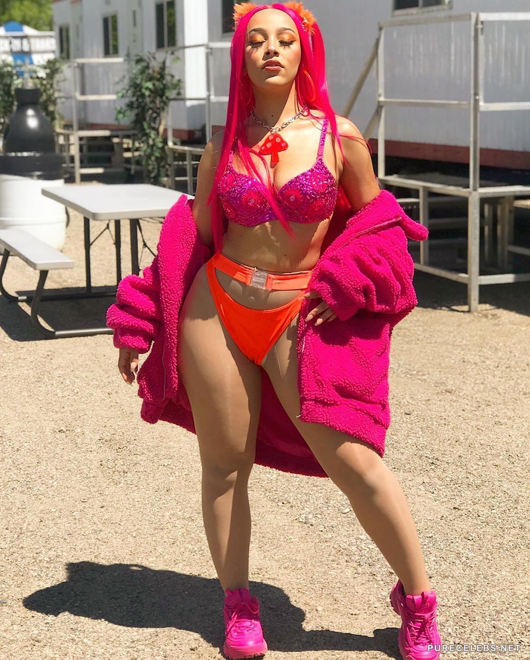 American rapper Doja Cat loves everyone around talk only about her. Therefore, she often indulges her fans by appearing in public in small bikinis that barely cover her awesome body. This charming brunette also felt confident enough to pose completely naked in front of the camera, holding a red rose in her mouth. You will be delighted with her gorgeous booty and her wonderful boobies, which she covered with her hand.