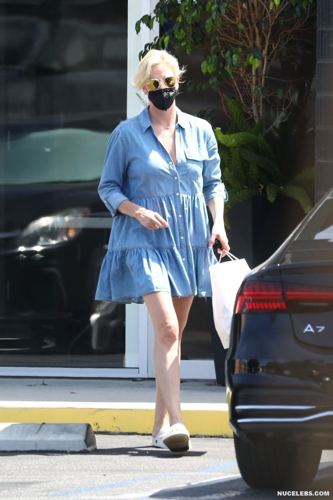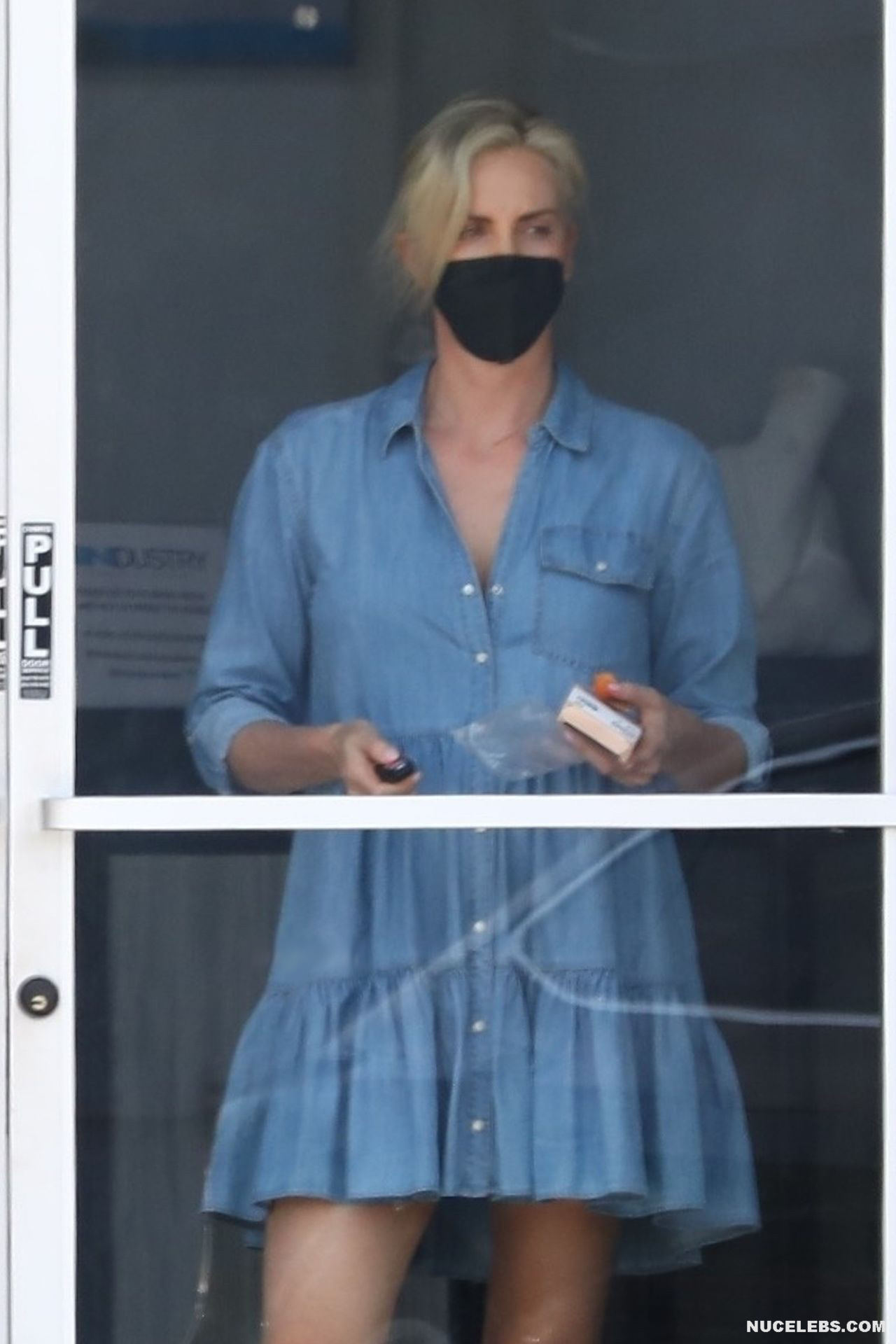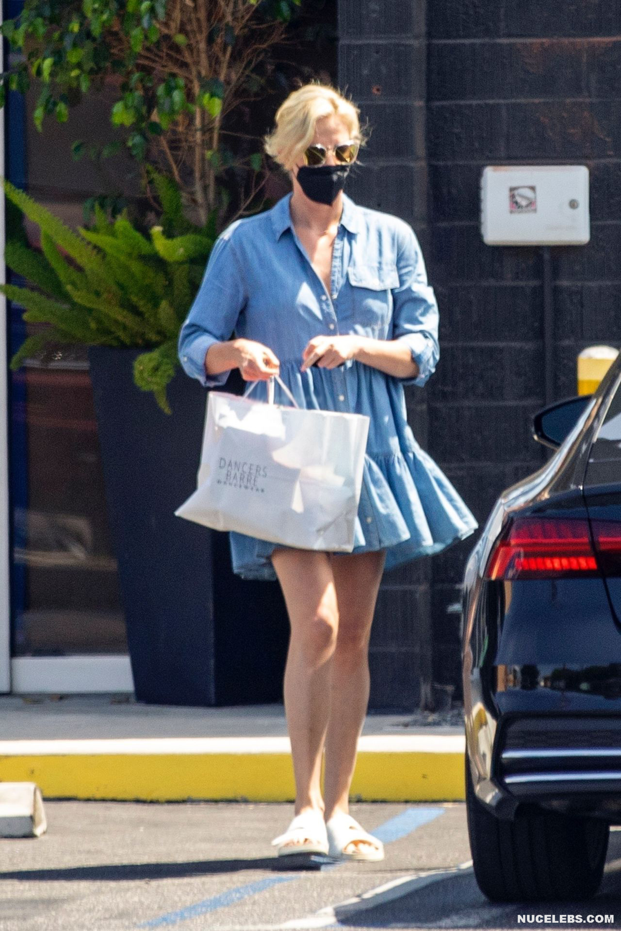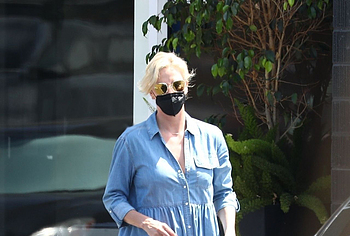 The paparazzi took great upskirt pictures of Charlize Theron near the car. It seems that the actress did not foresee the fact that there is a strong wind outside when she was choosing an outfit for herself. Her blue loose dress went up and everyone could see her cool ass in black panties. Well, of course, we would like to see Charlize Theron nude pussy or ass, but we agree to admire this view this time.