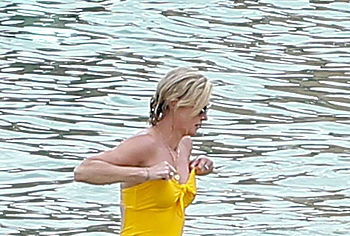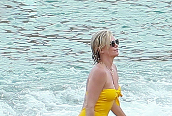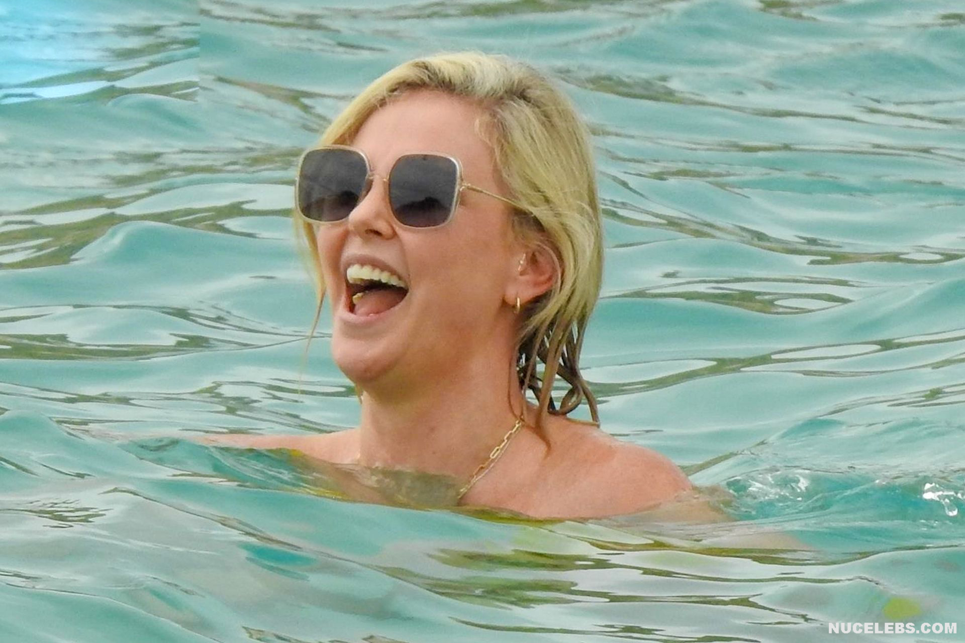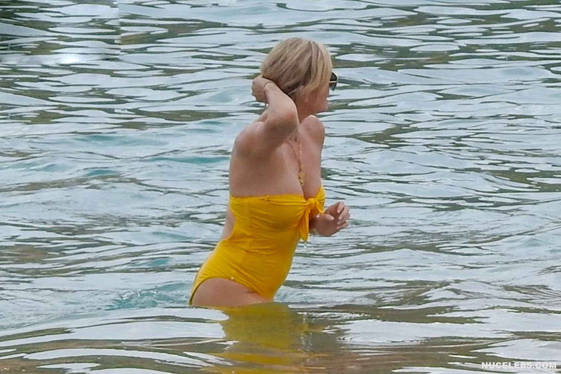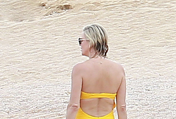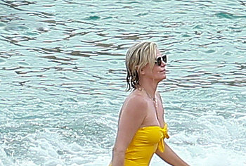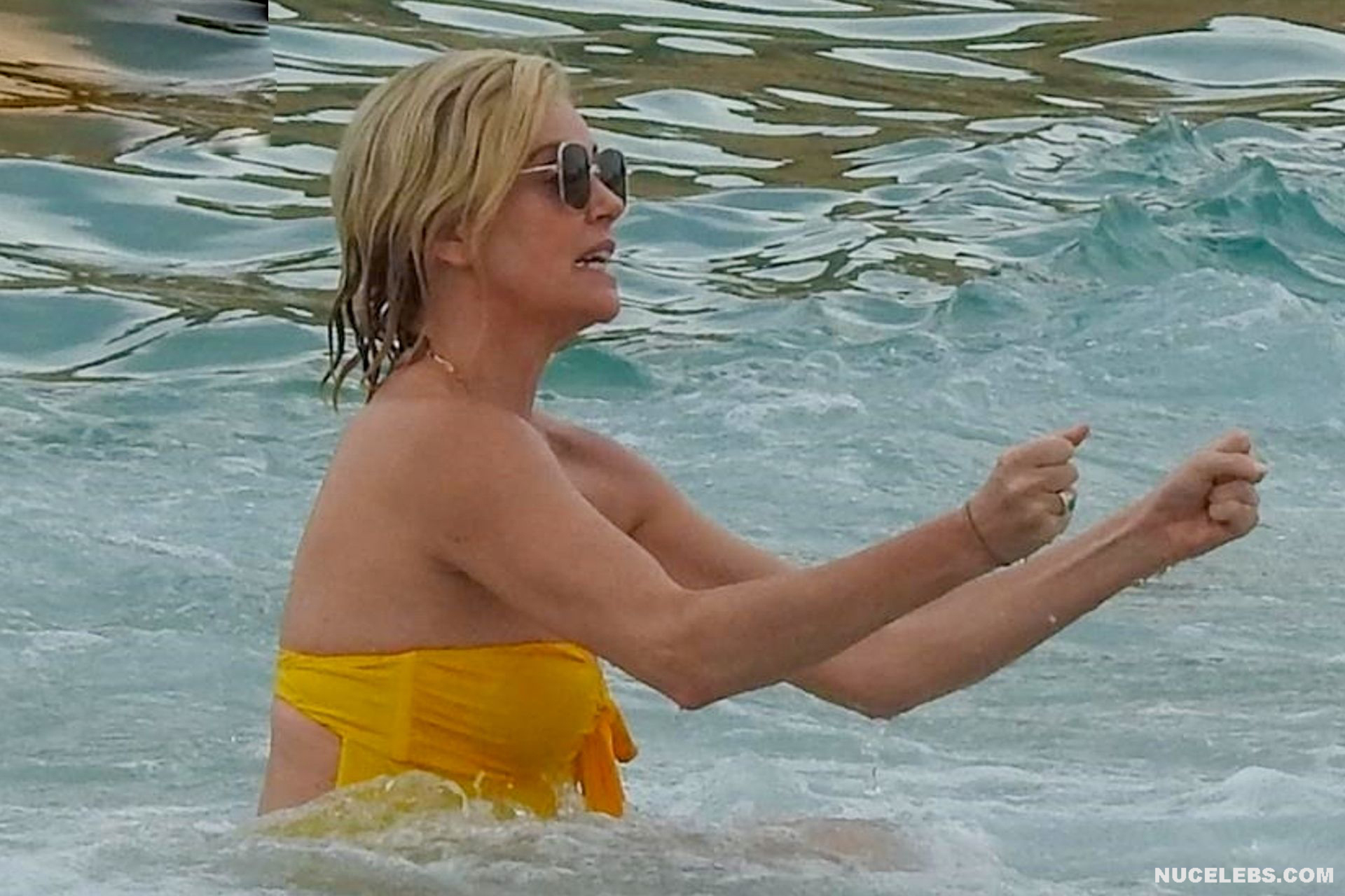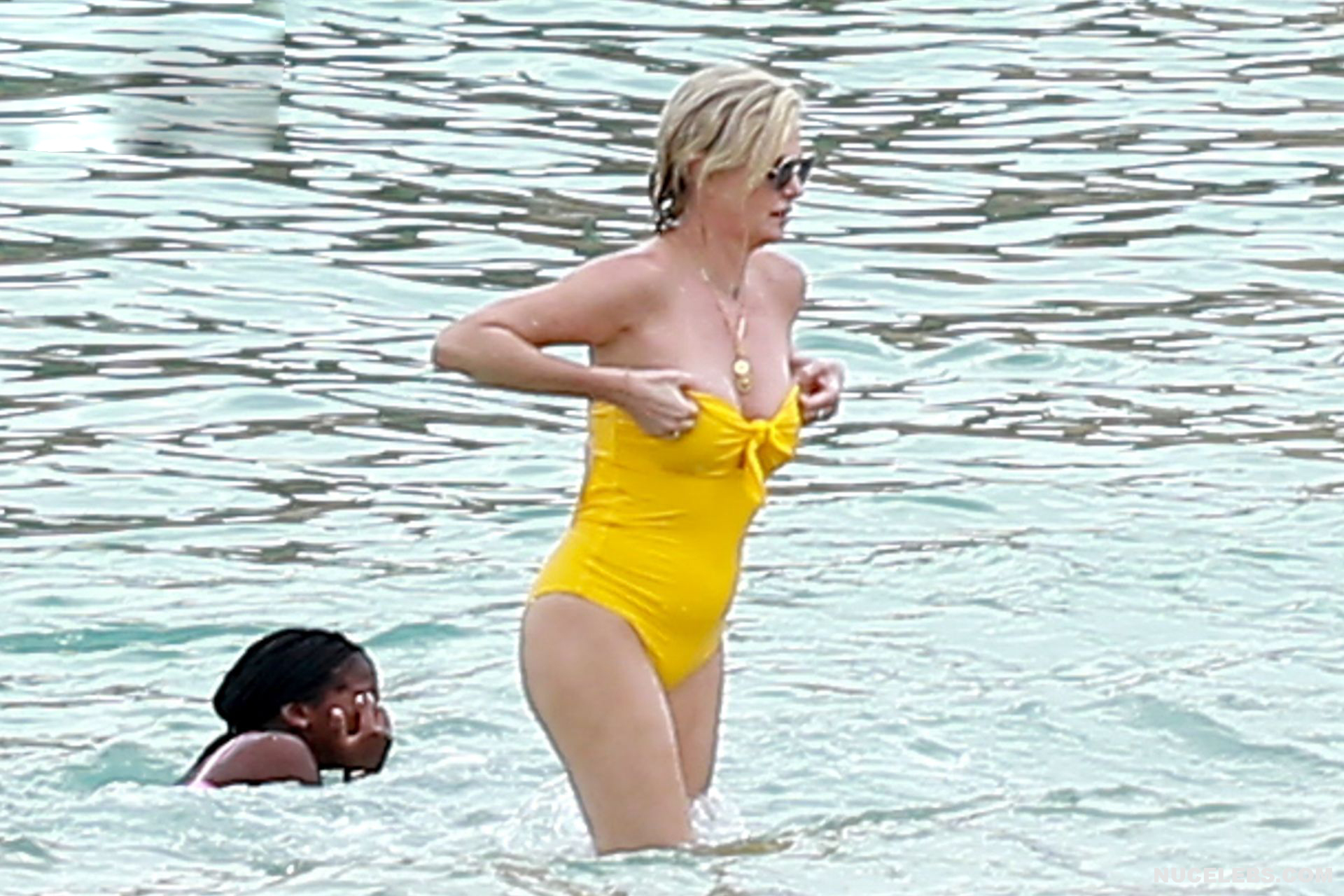 Charlize Theron, despite her age, continues to look damn hot. At least Charlize Theron almost nude booty in a wet swimsuit looks like a teen girl ass! The paparazzi just managed to photograph this 46-year-old actress during her beach vacation. The celebrity was wearing a yellow swimsuit that perfectly accentuated the curves of her body. And the top of the swimsuit strove to slip off the Charlize Theron nude juicy tits!