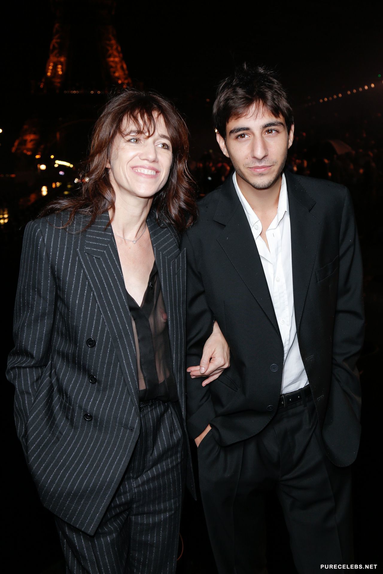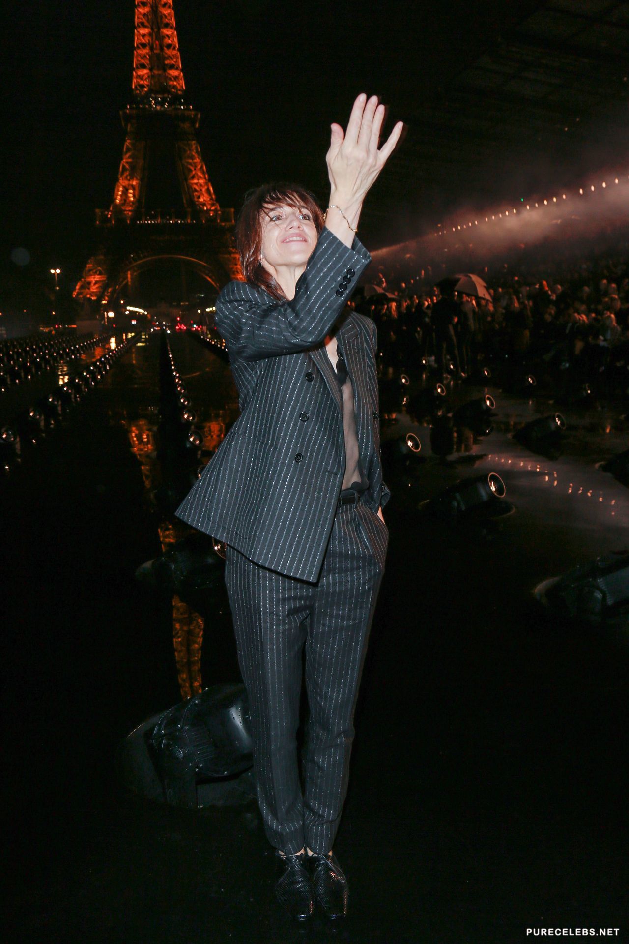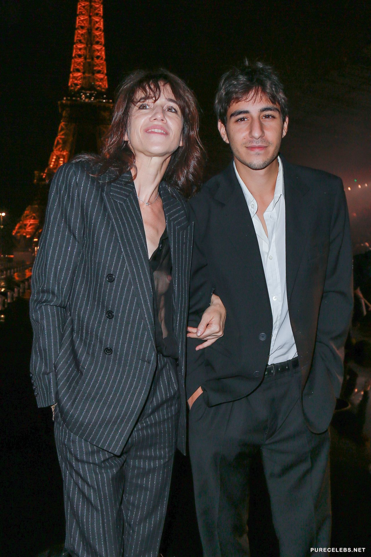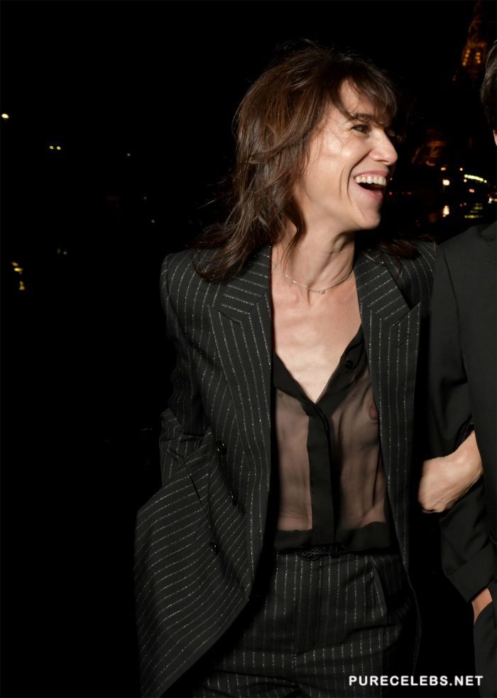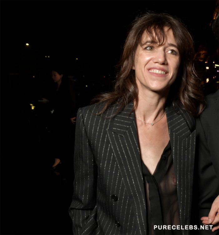 Charlotte Gainsbourg was photographed against the backdrop of the Eiffel Tower, and she looked very extravagant. The celebrity wore a black striped trouser suit, which added an unusual charm to her look. Also, paparazzi managed to photograph this beauty at the moment when her jacket was unbuttoned and through her black transparent top you could clearly see her wonderful boob with a small brown nipple.