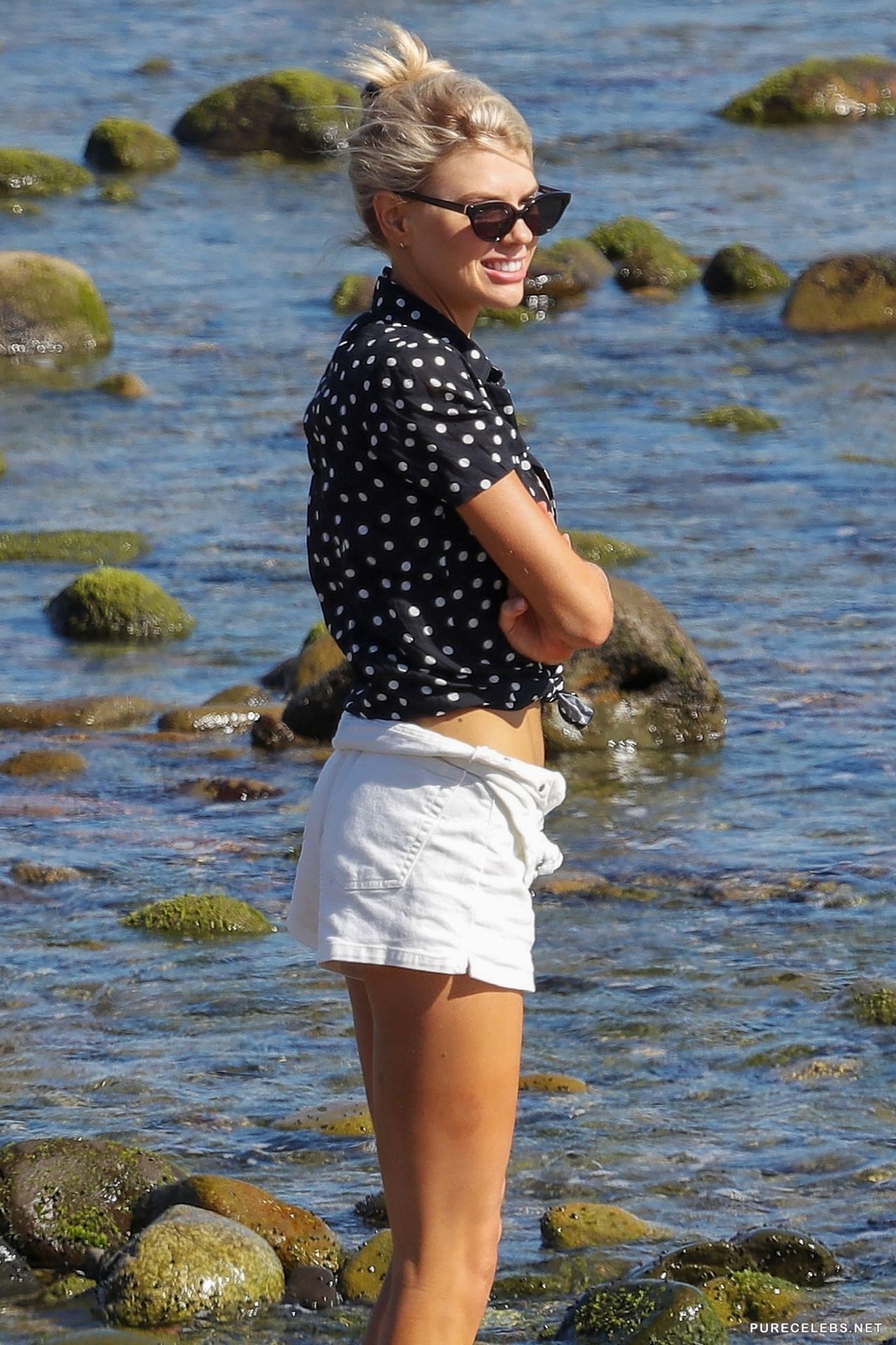 American model Charlotte McKinney continues to drive her fans crazy, appearing in public places in very provocative outfits. Recently, this charming blonde in black sunglasses was caught on the beach. The celebrity was dressed in short white shorts and a black polka dot blouse with a great cleavage. Without a doubt, her awesome boobs were the focus of public attention because they looked so sweet and sexy!