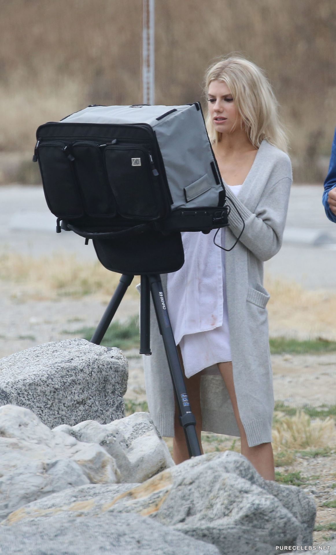 American model Charlotte McKinney recently took part in a beach photo shoot and flashed her naked boobs. Hot blonde posed in a white sweater with black edging and a white hat, covering her gorgeous ass with a white towel. During the photo shoot, the girl decided to make a cut on her sweatshirt deeper, but overdone and her brown nipple jumped out of her clothes, and paparazzi, of course, managed to capture this moment.