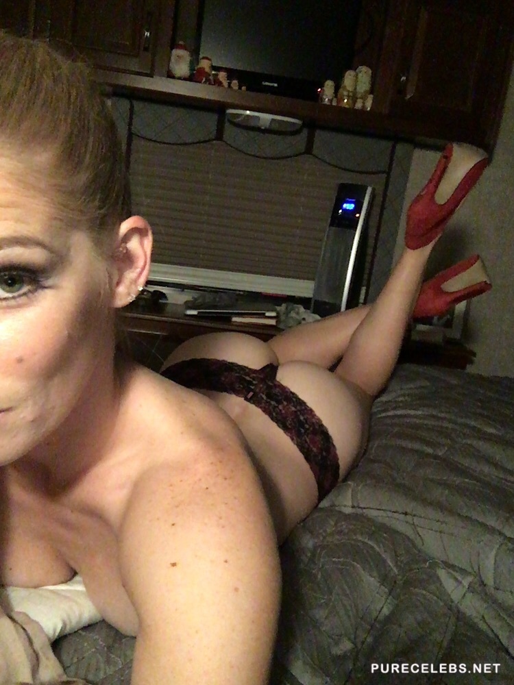 American actress Chelsea Teel didn’t do her acting career any favors when she lost track of her private photos. Those who aren’t so concerned for her future roles can enjoy seeing this blonde beauty in lingerie and high heels posing in bed and in front of a mirror. What’s more, there’s a juicy close up of her cramming a big red dildo up her hairy little pussy.