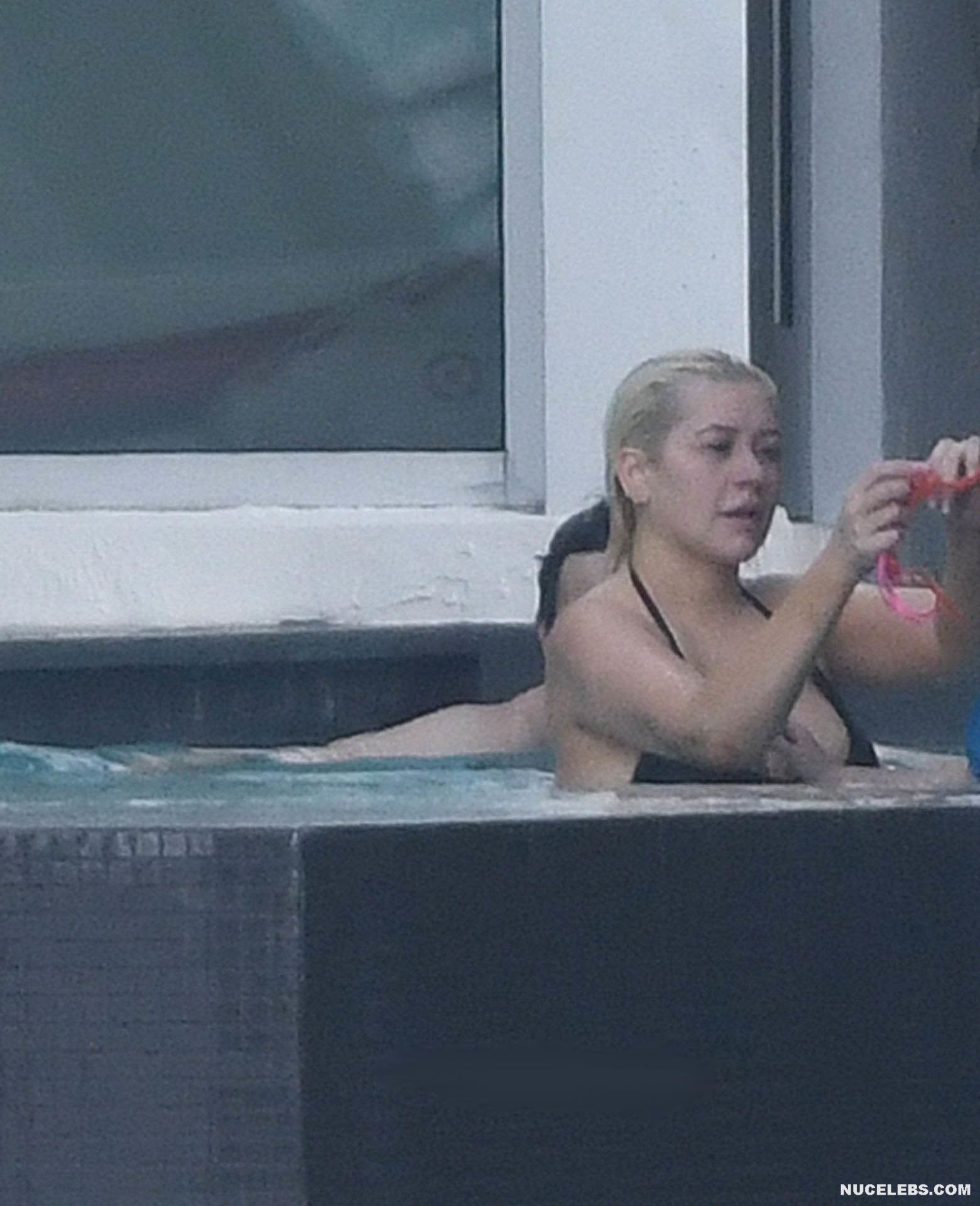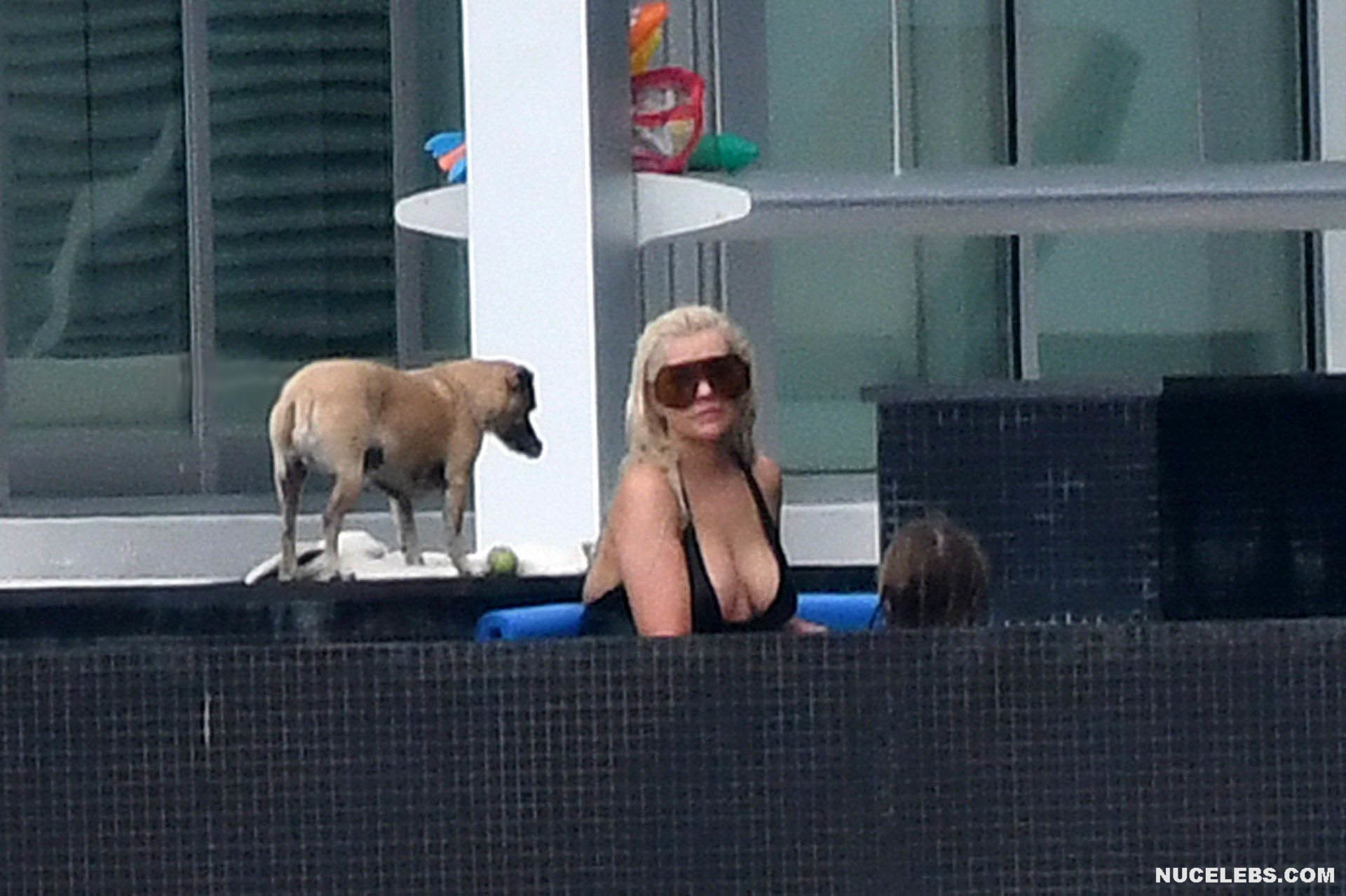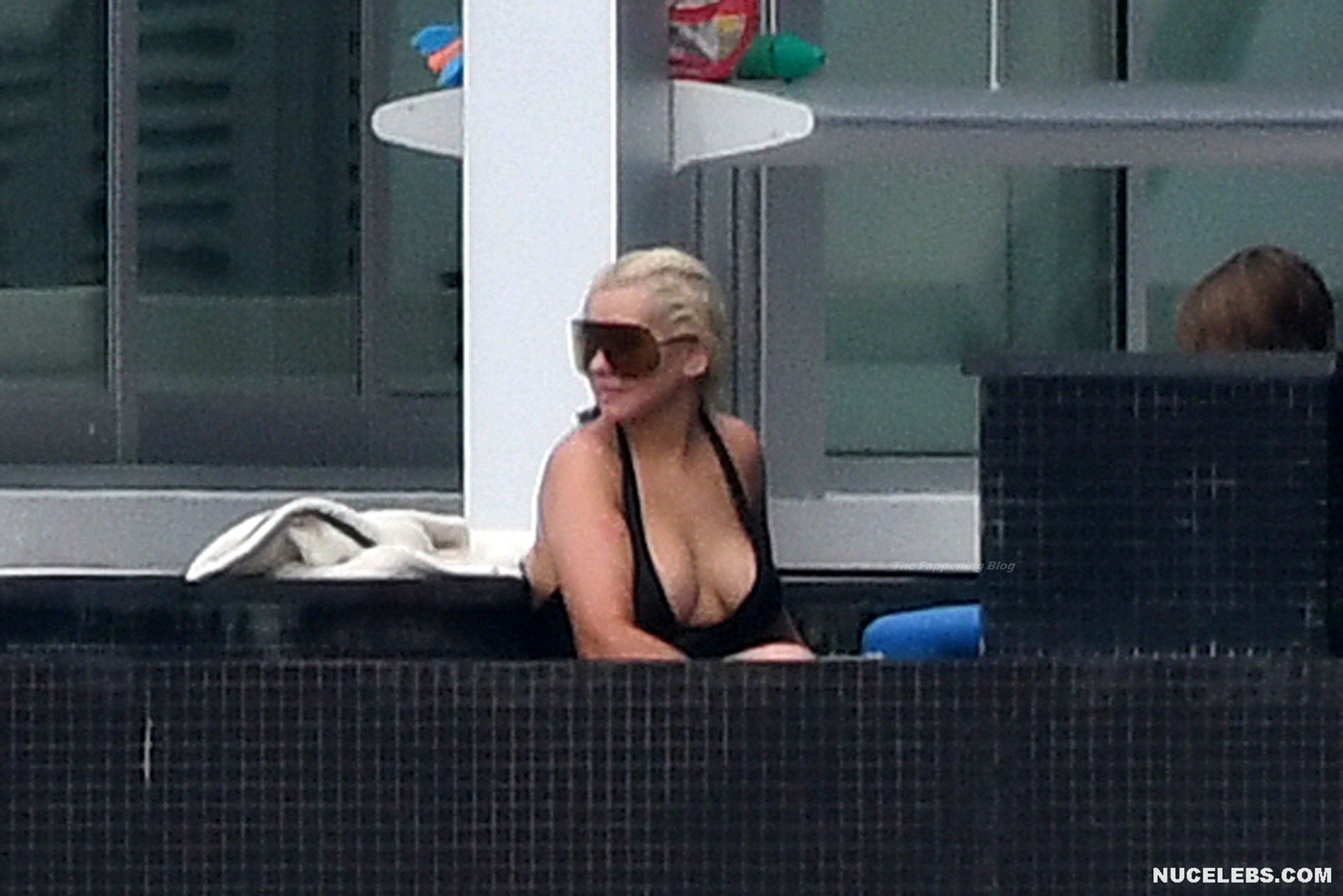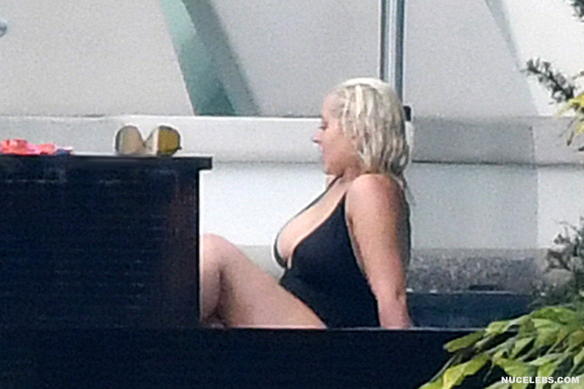 Check out the awesome pics of Christina Aguilera in the pool by the paparazzi! Of course, the paparazzi still hoped to catch Christina Aguilera nude, but her huge tits never slipped out of her tight black swimsuit. Although every time this blonde bent over, her big melons were very close to jumping out. The singer’s big peach ass in a wet swimsuit also looked incredibly sexy, what do you think?