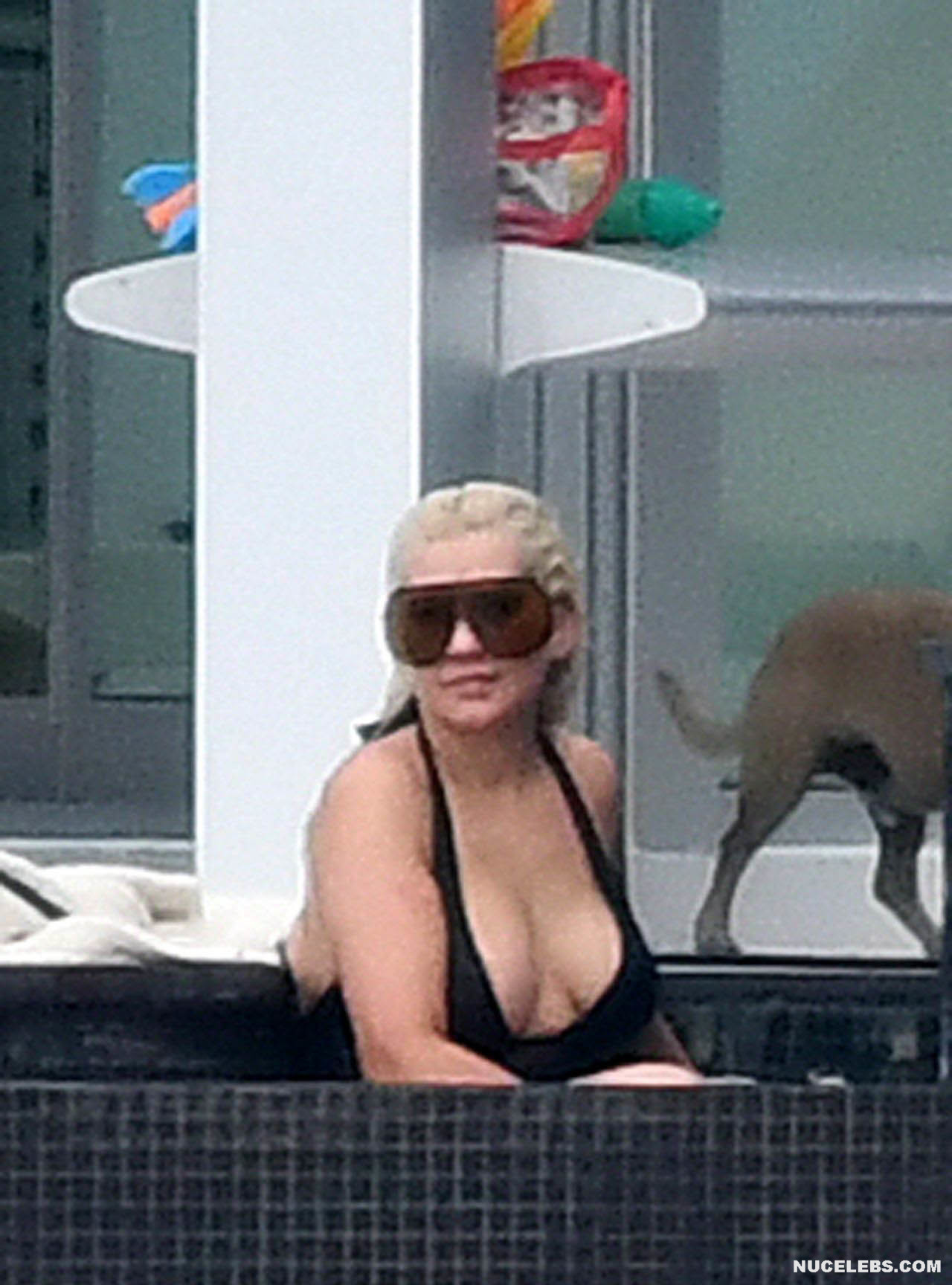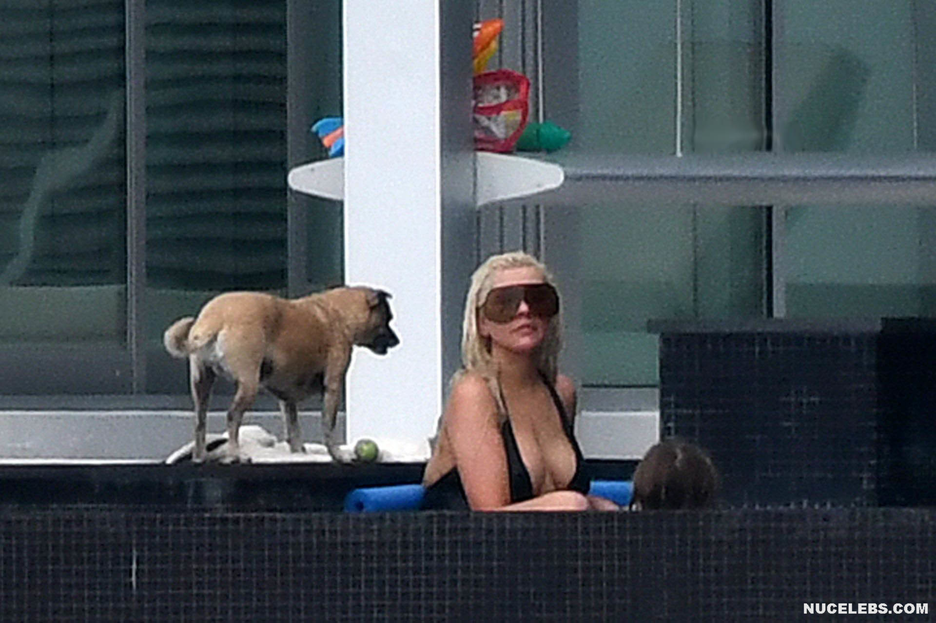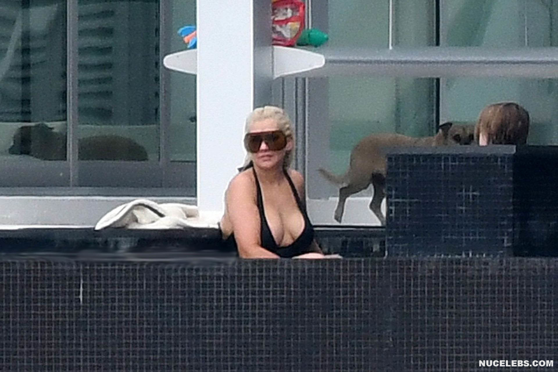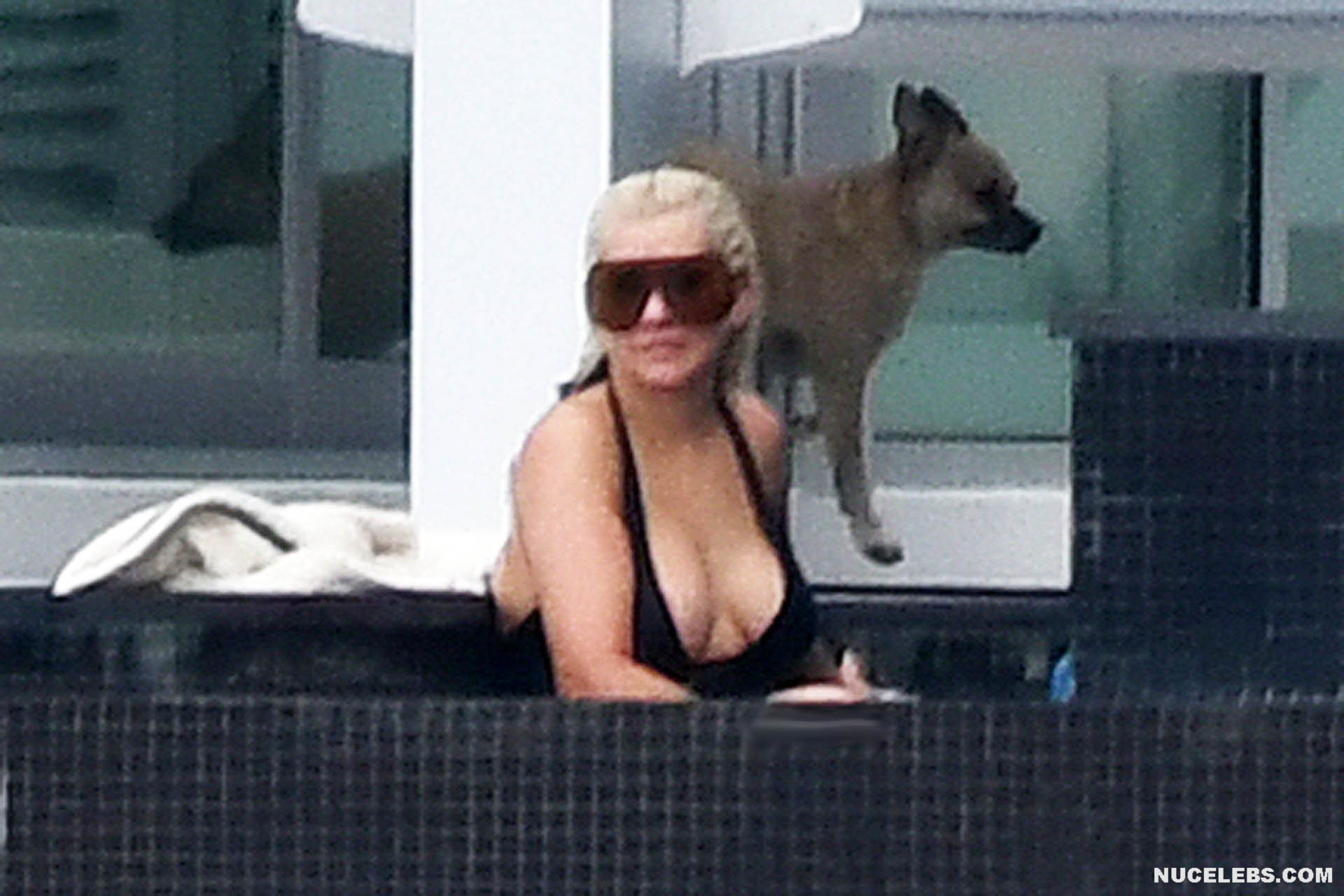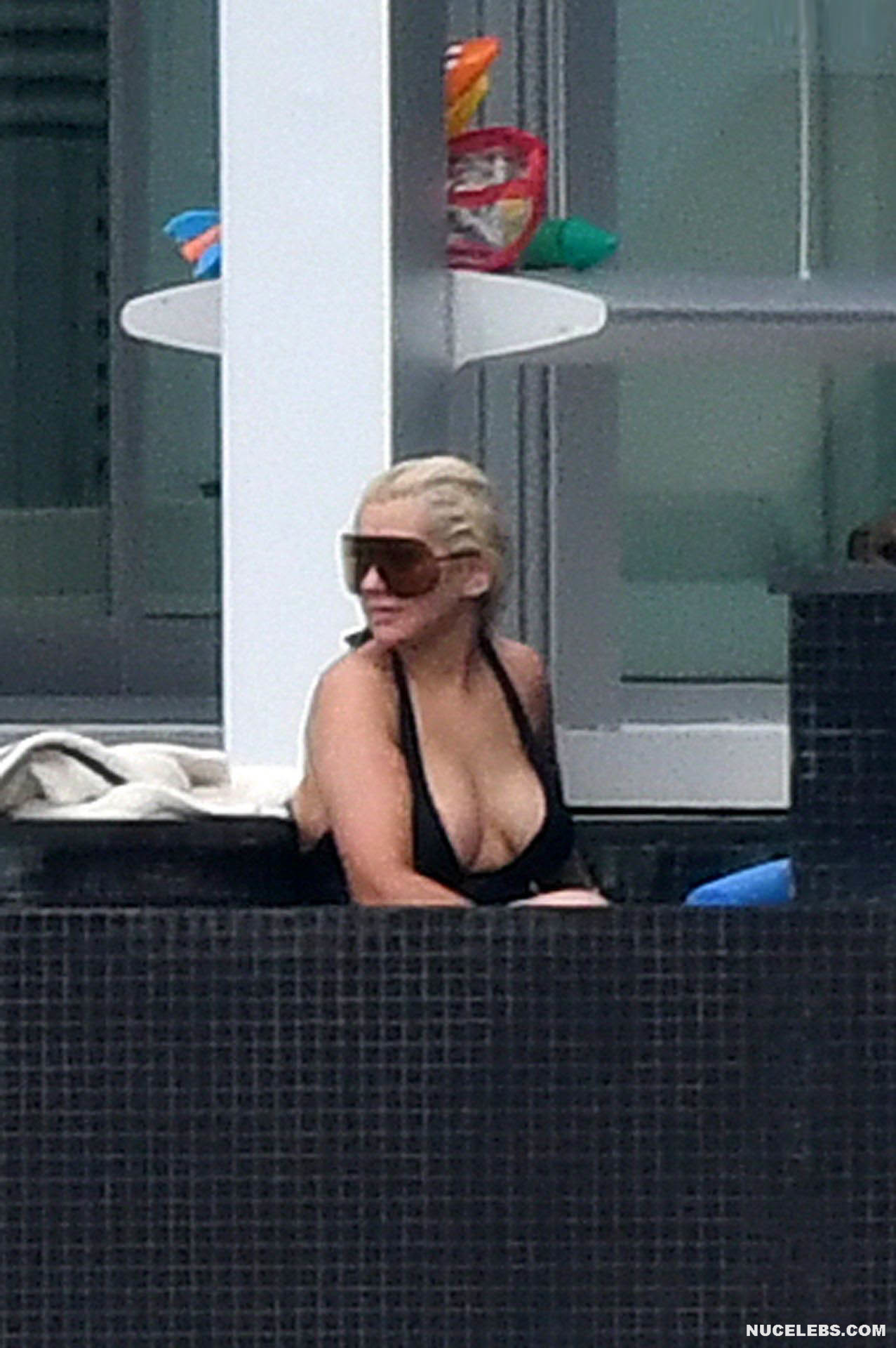 Check out the awesome pics of Christina Aguilera in the pool by the paparazzi! Of course, the paparazzi still hoped to catch Christina Aguilera nude, but her huge tits never slipped out of her tight black swimsuit. Although every time this blonde bent over, her big melons were very close to jumping out. The singer’s big peach ass in a wet swimsuit also looked incredibly sexy, what do you think?