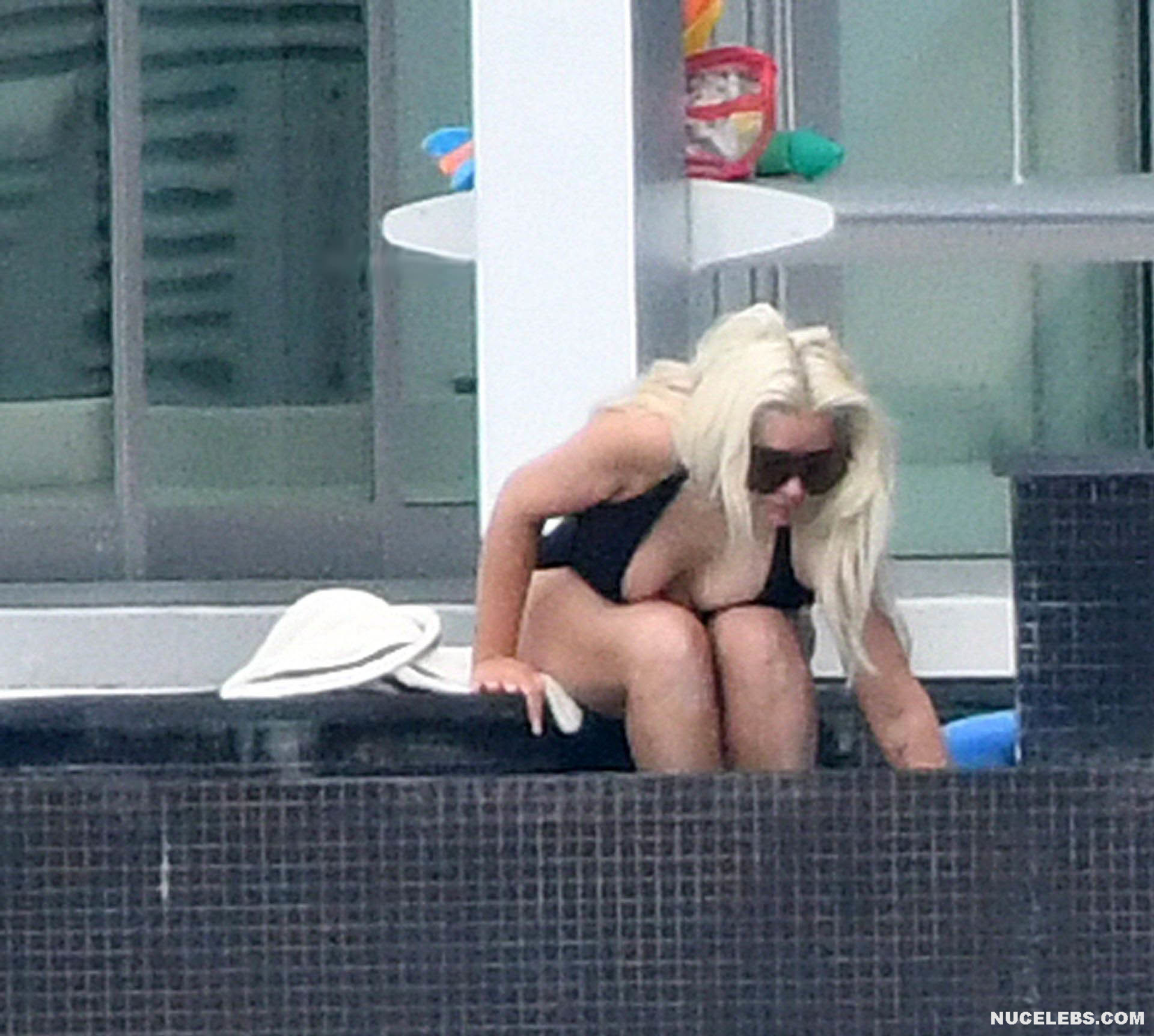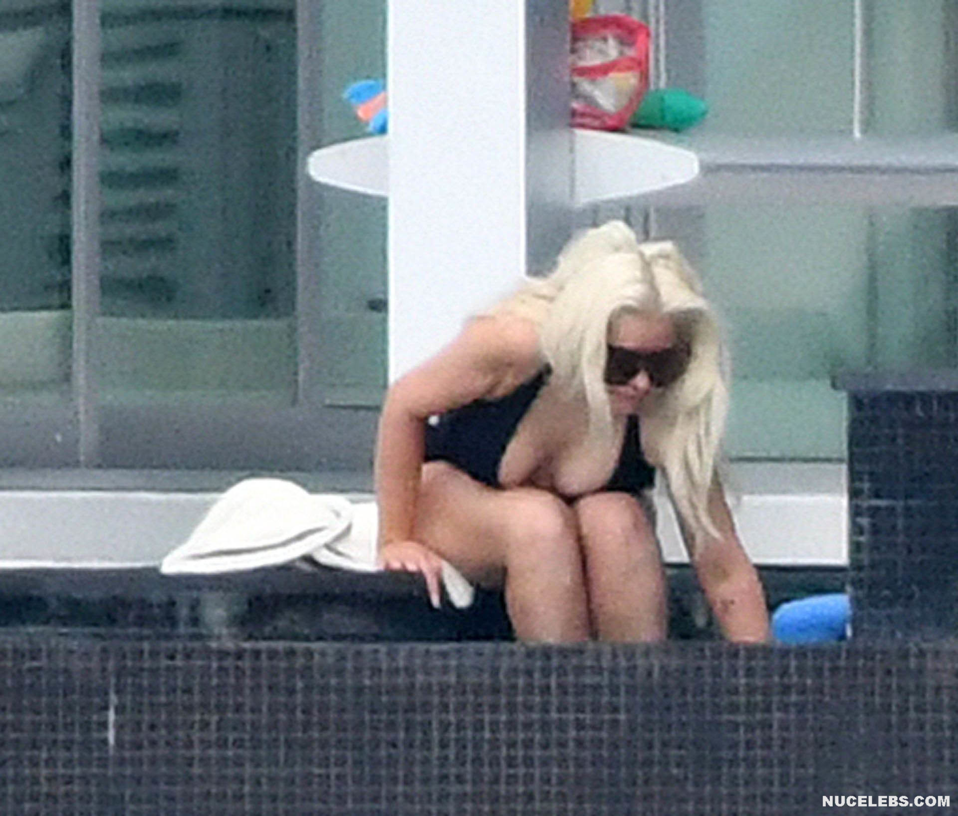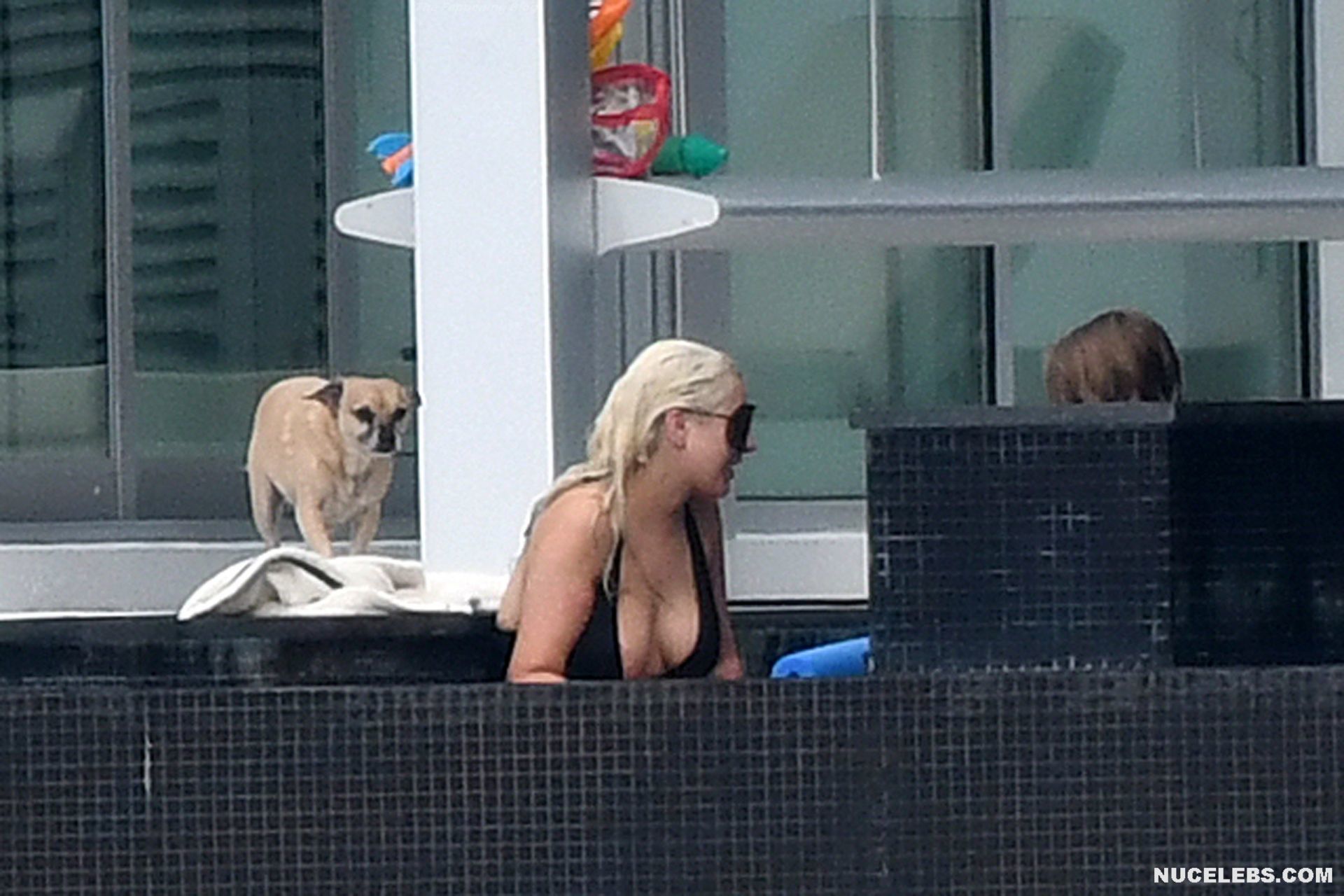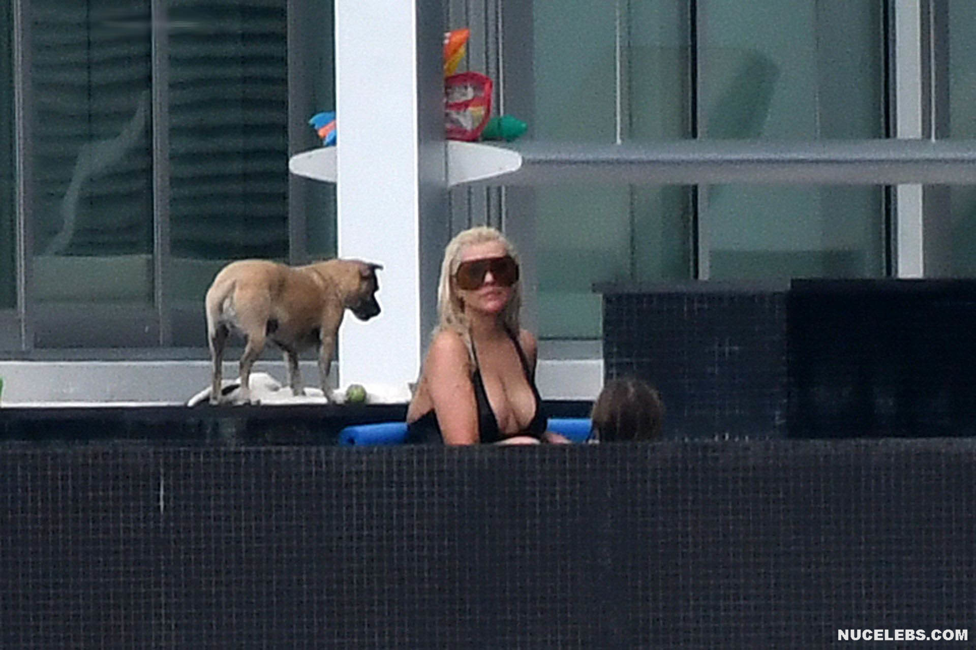 Check out the awesome pics of Christina Aguilera in the pool by the paparazzi! Of course, the paparazzi still hoped to catch Christina Aguilera nude, but her huge tits never slipped out of her tight black swimsuit. Although every time this blonde bent over, her big melons were very close to jumping out. The singer’s big peach ass in a wet swimsuit also looked incredibly sexy, what do you think?