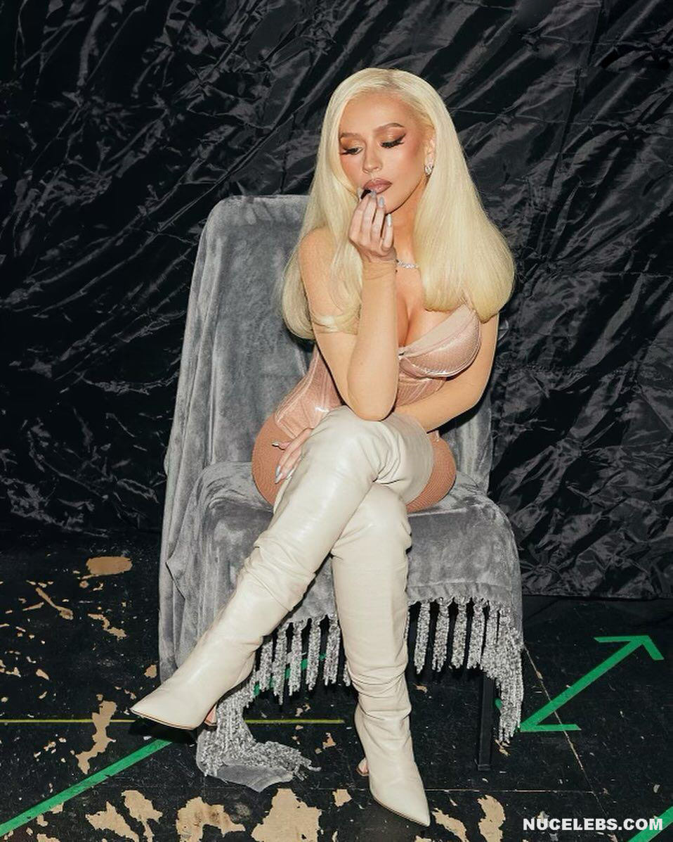 Enjoy Christina Aguilera’s photos in which she poses in a cream seductive corset. The celebrity stuck out her tongue and winked slyly. Christina Aguilera also posed frontally nude, covering her pubic area with a hand in a long mesh glove. The second hand hide her juicy tits. This is not the only nude photo of this singer. In addition, she posed in black mesh gloves and over the knee boots. And as you can see, all other parts of Christina Aguilera’s body were nude.