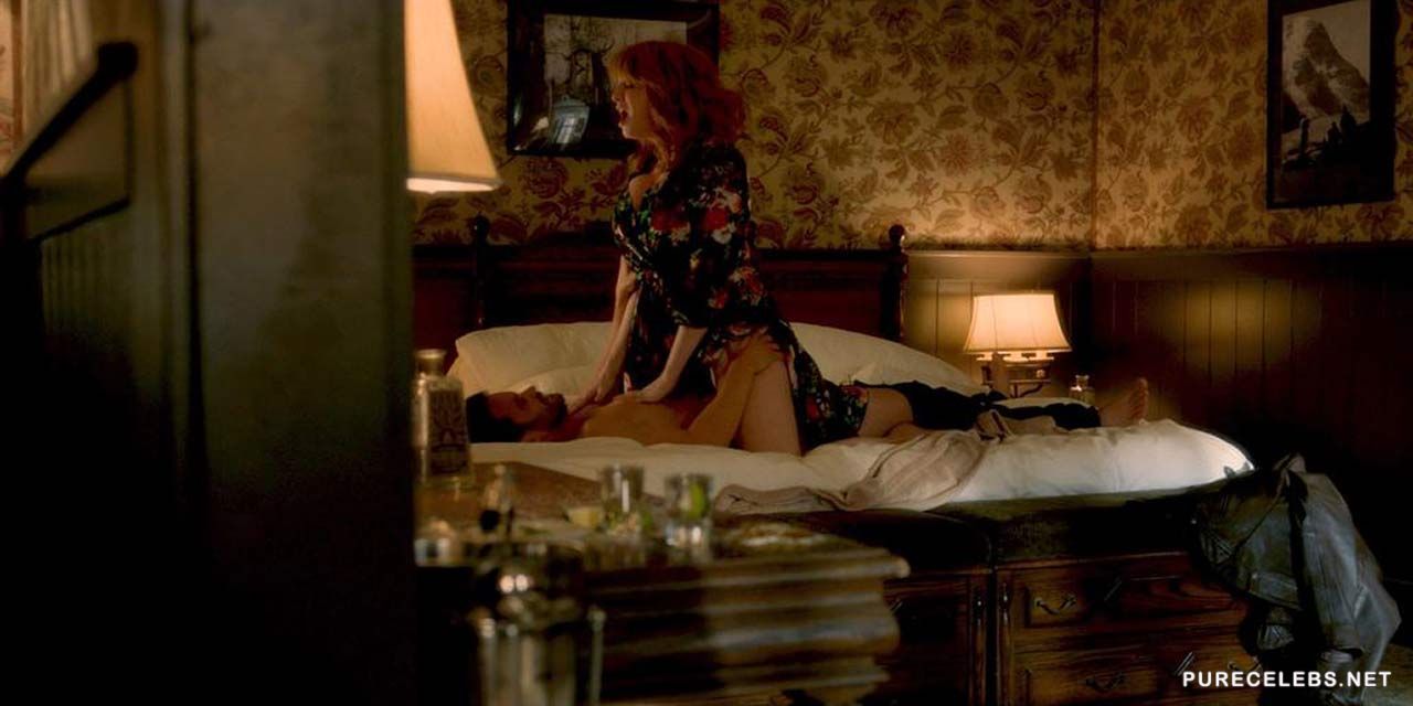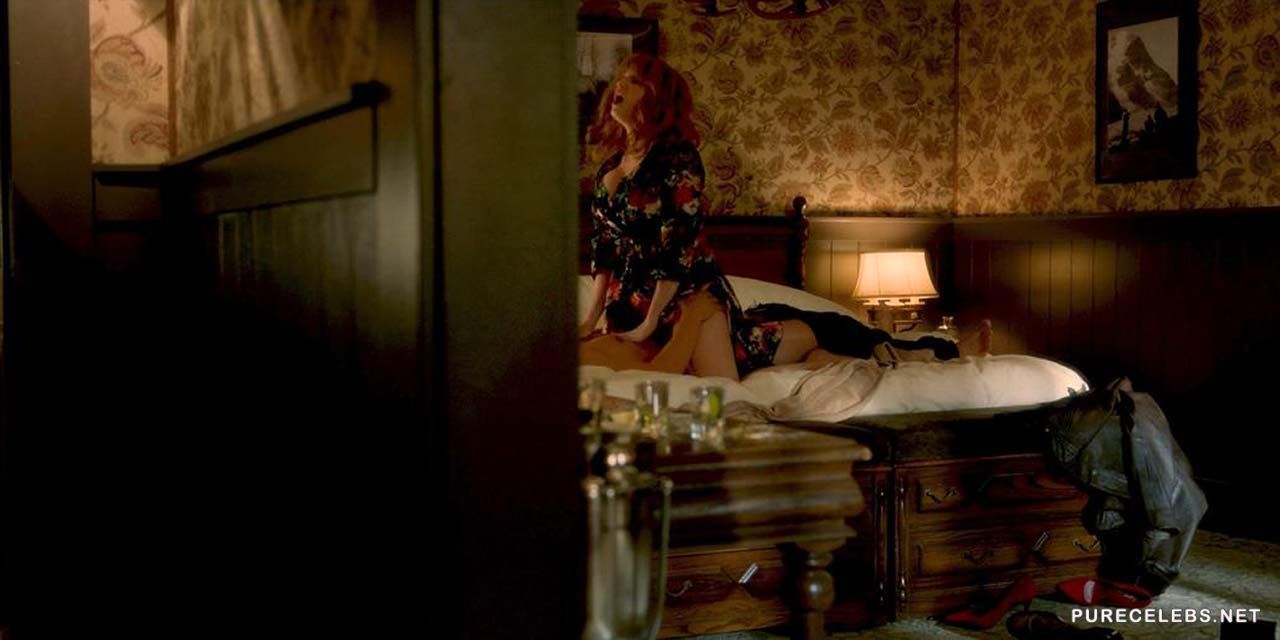 Christina Hendricks, this hot mature ass, demonstrates us her hot sexual skills in Tin Star 2019. A famous actress, dressed in a black dress with a color print, is sexually jumping on the dick of her partner and moans loudly. Her huge stunning tits jumped out of a dress and her partner squeezed them with a wild pleasure. Oh, Chris can be so dirty girl in the bedroom!
