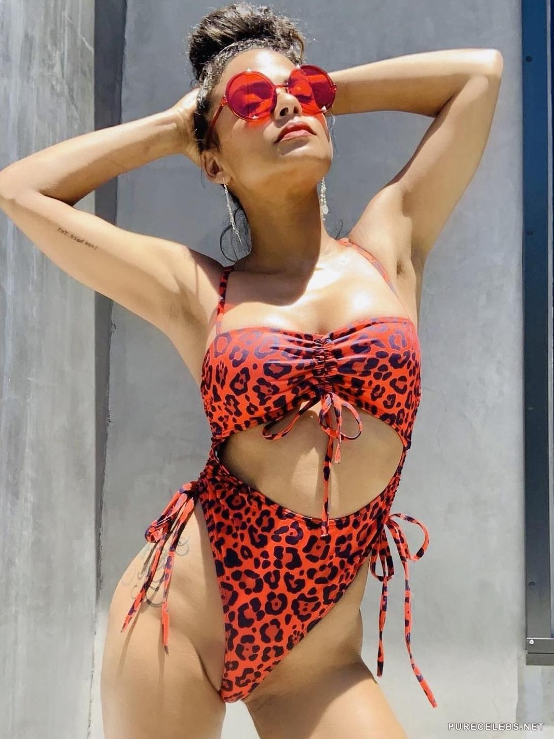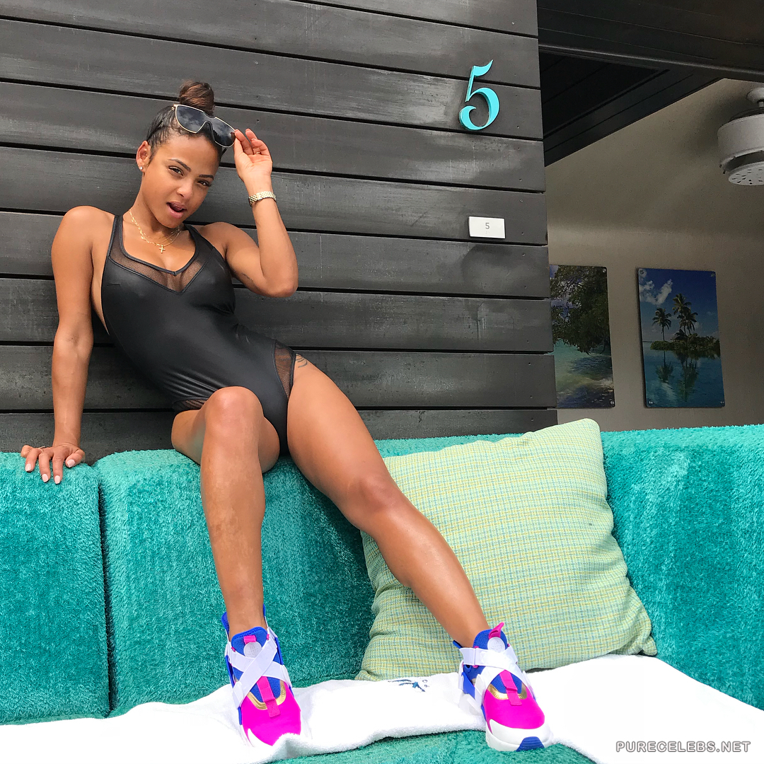 American actress Christina Milian loves being photographed while pregnant. After all, her body during pregnancy has become even more seductive! So, Christina Milian happily posed in purple lingerie, from which part of her nude boobs peeped out. Needless to say, her tits just got huge! By the way, her buttocks also became more appetizing and it was quite difficult for her small panties to cover them. The photo in which the girl poses in a black translucent bodysuit also turned out to be very hot. It seems that if you take a closer look, the Christina Milian nude pussy will be visible through the transparent fabric.