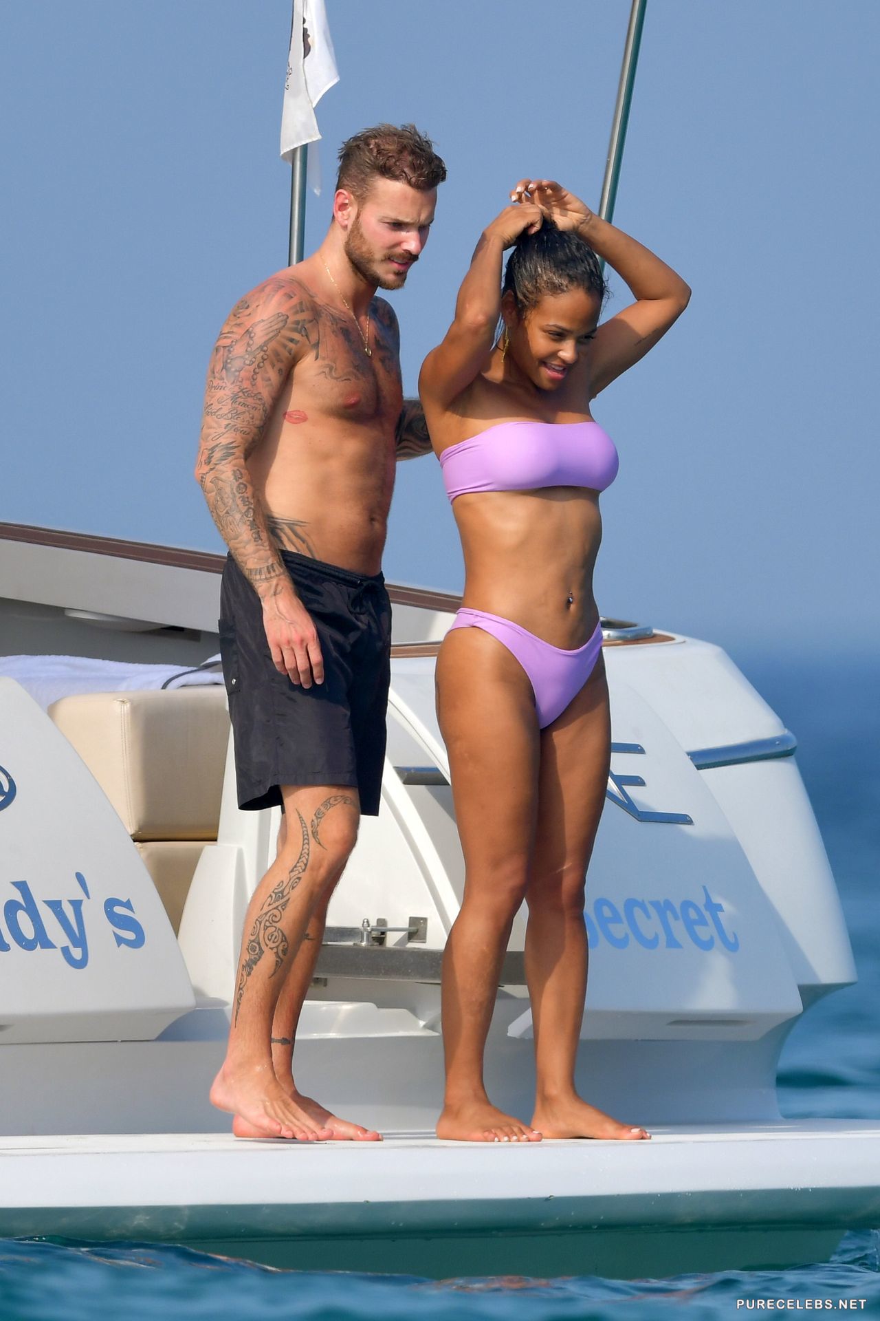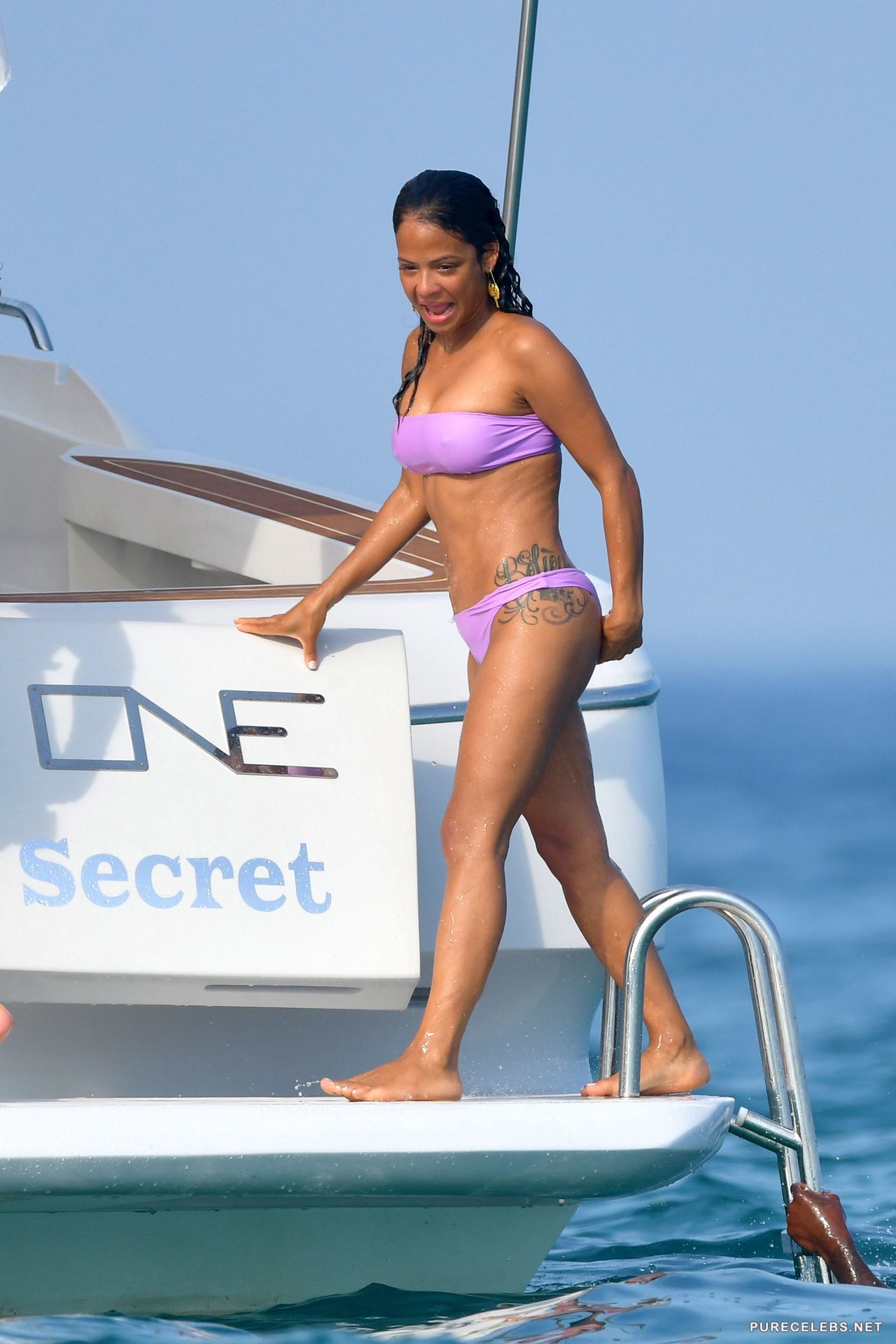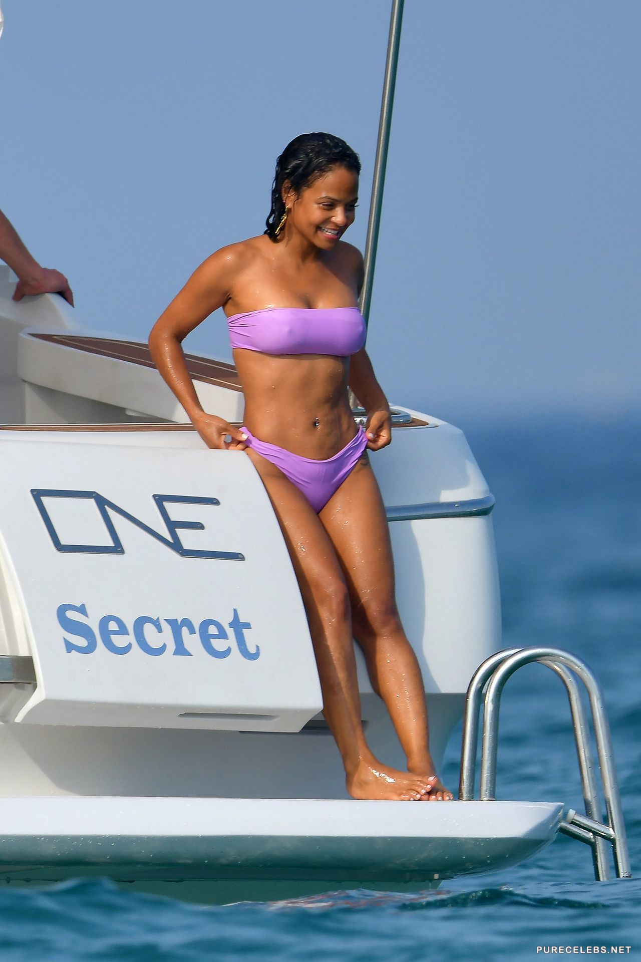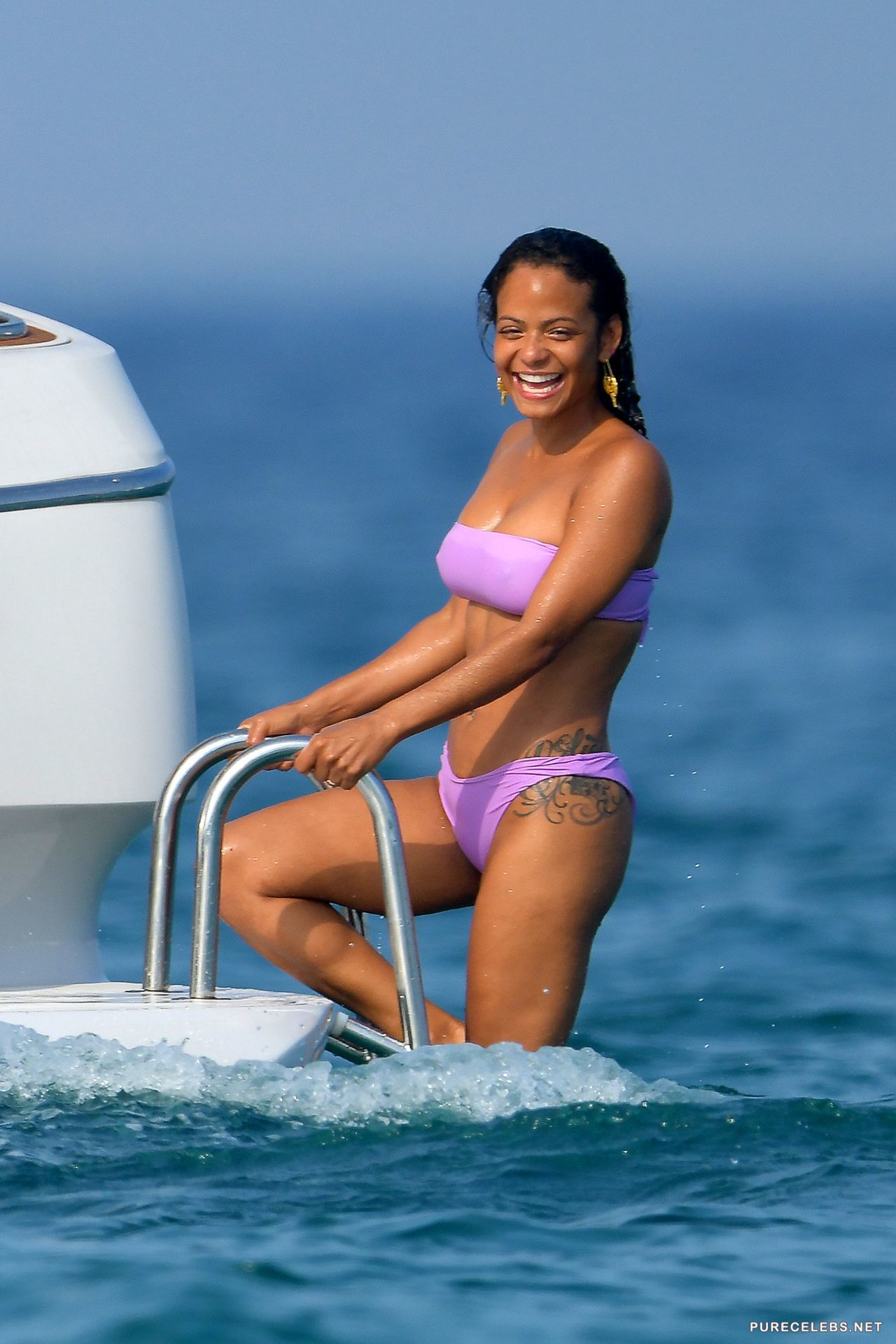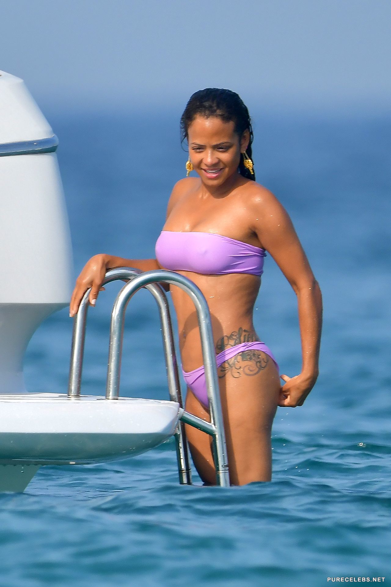 American actress Christina Milian had a great time relaxing on a yacht, where she was caught by the paparazzi. The charming brunette was wearing a purple bikini, which contrasted remarkably with her body. The fabric of her bikini was thin enough, and when the hot beauty came out of the water, her wonderful titties with hard nipples and her great cameltoe were clearly visible through the wet fabric.