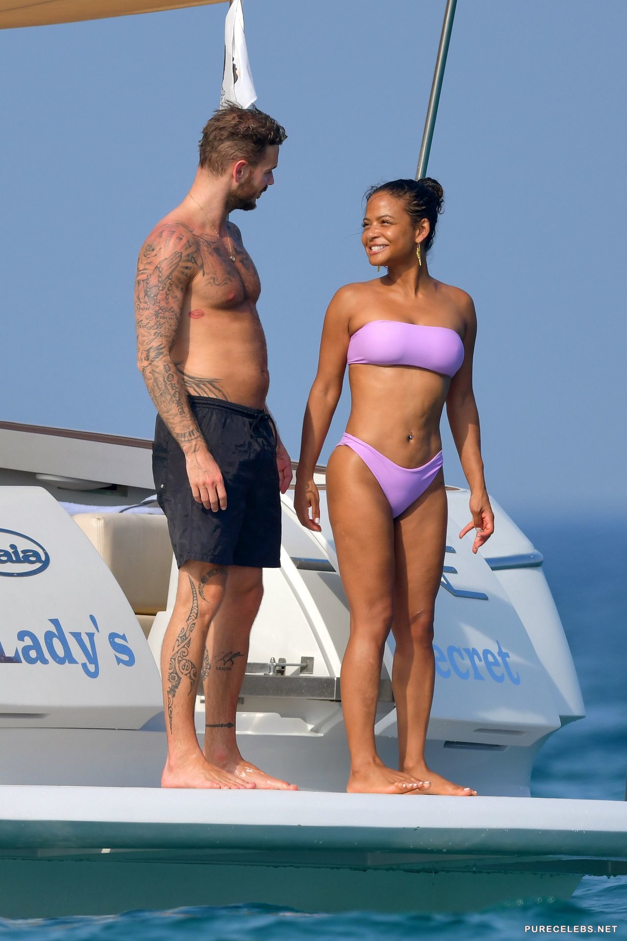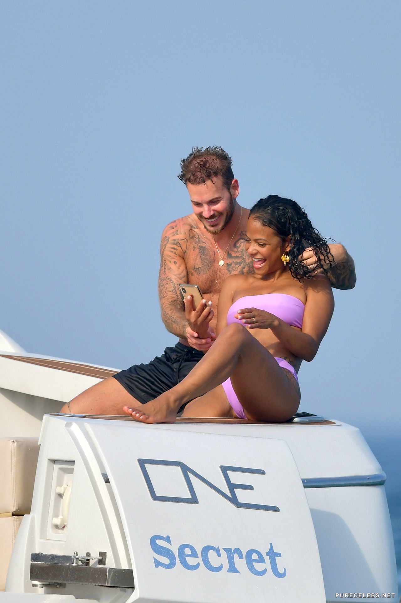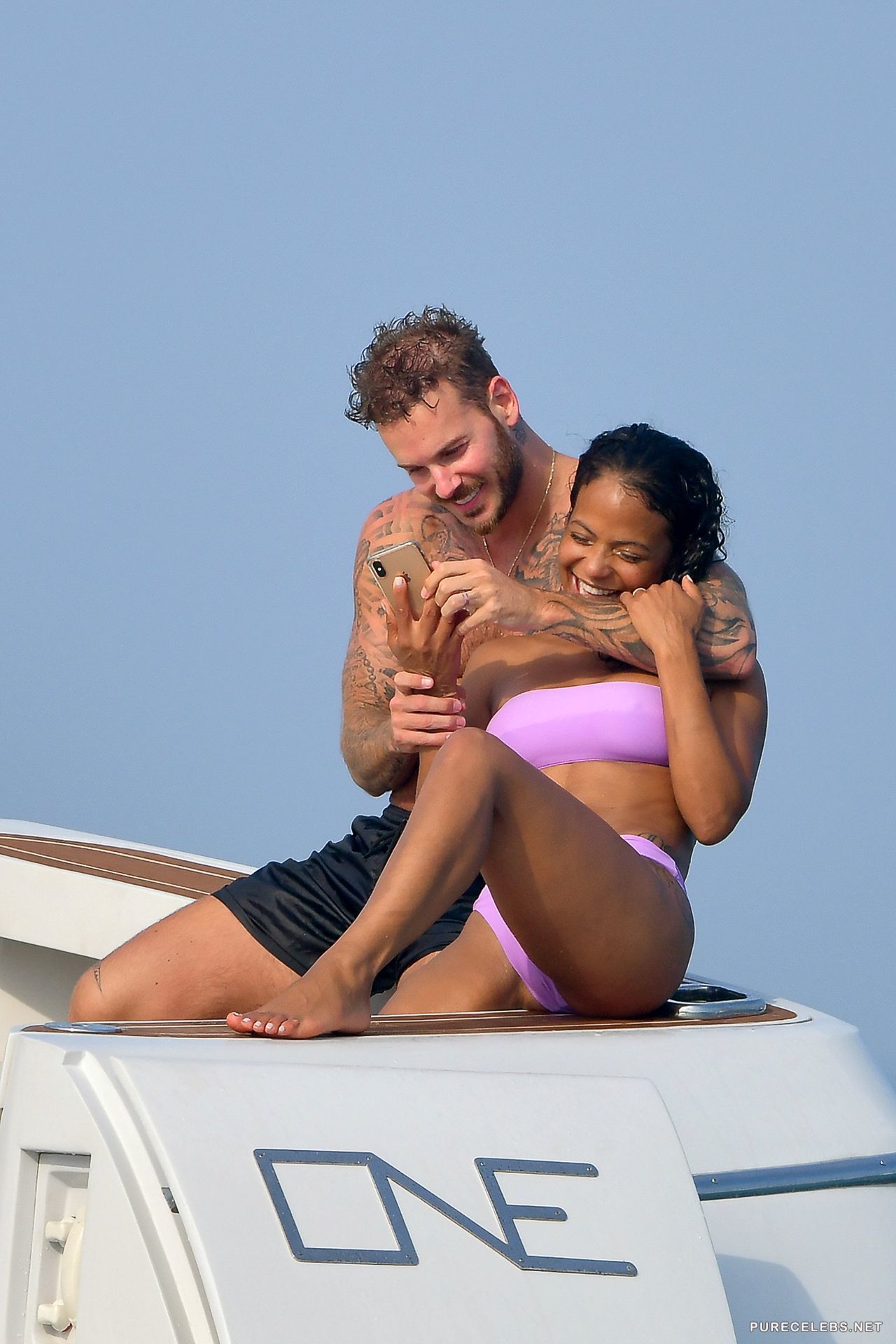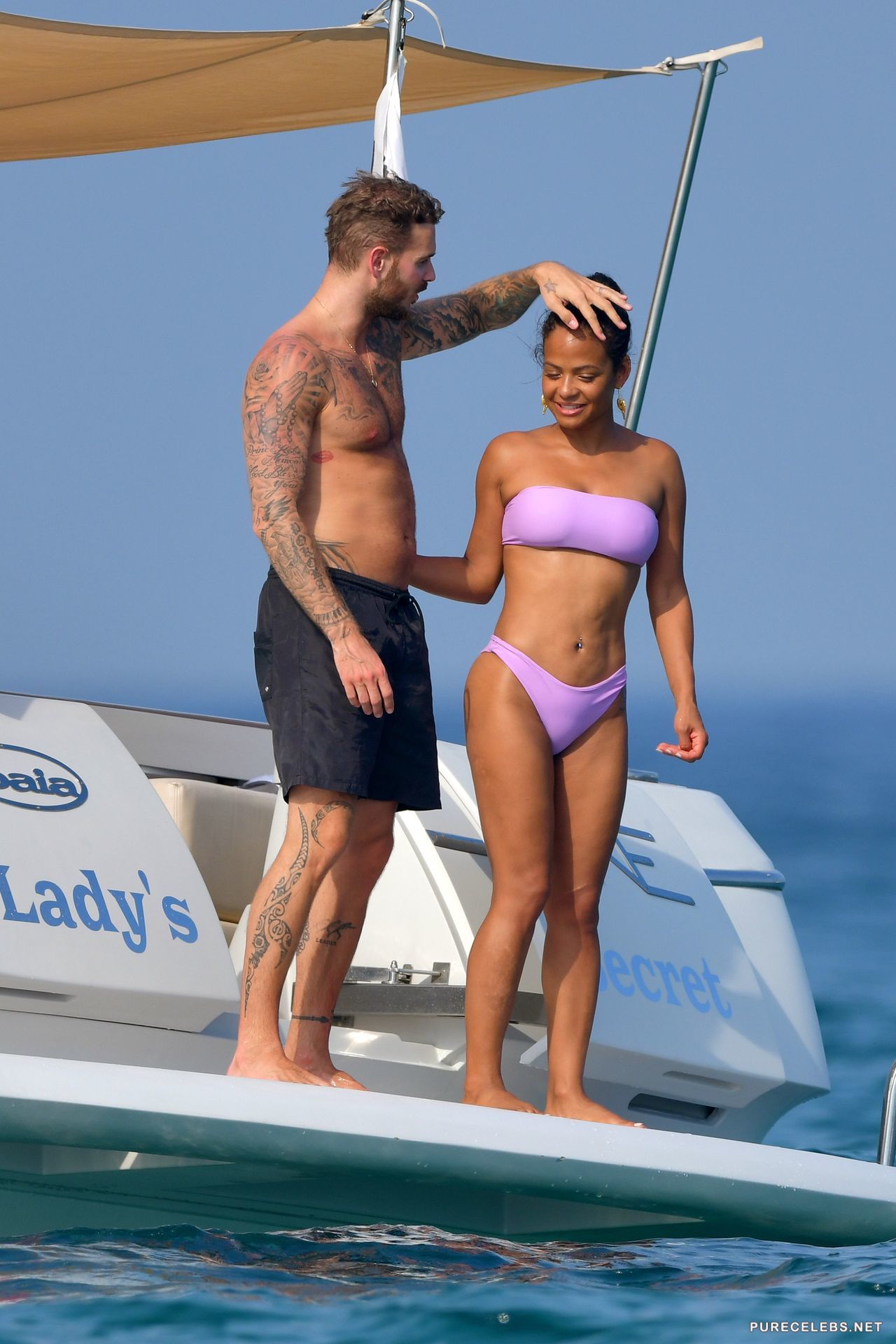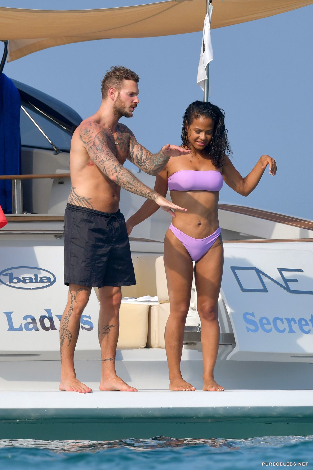 American actress Christina Milian had a great time relaxing on a yacht, where she was caught by the paparazzi. The charming brunette was wearing a purple bikini, which contrasted remarkably with her body. The fabric of her bikini was thin enough, and when the hot beauty came out of the water, her wonderful titties with hard nipples and her great cameltoe were clearly visible through the wet fabric.