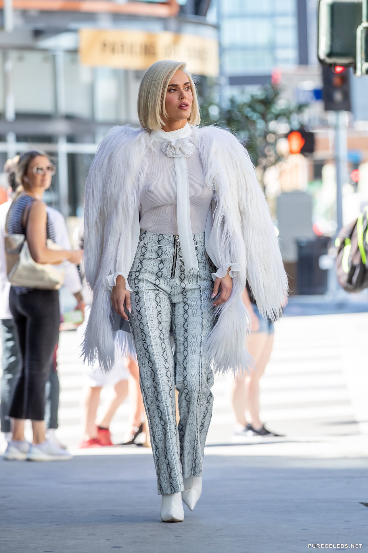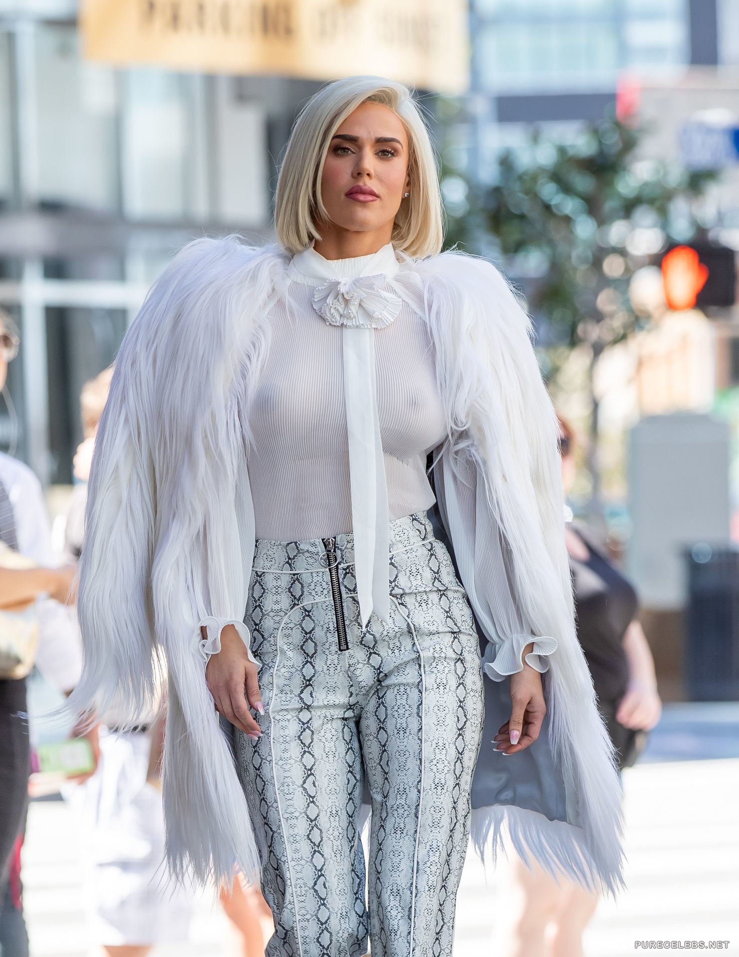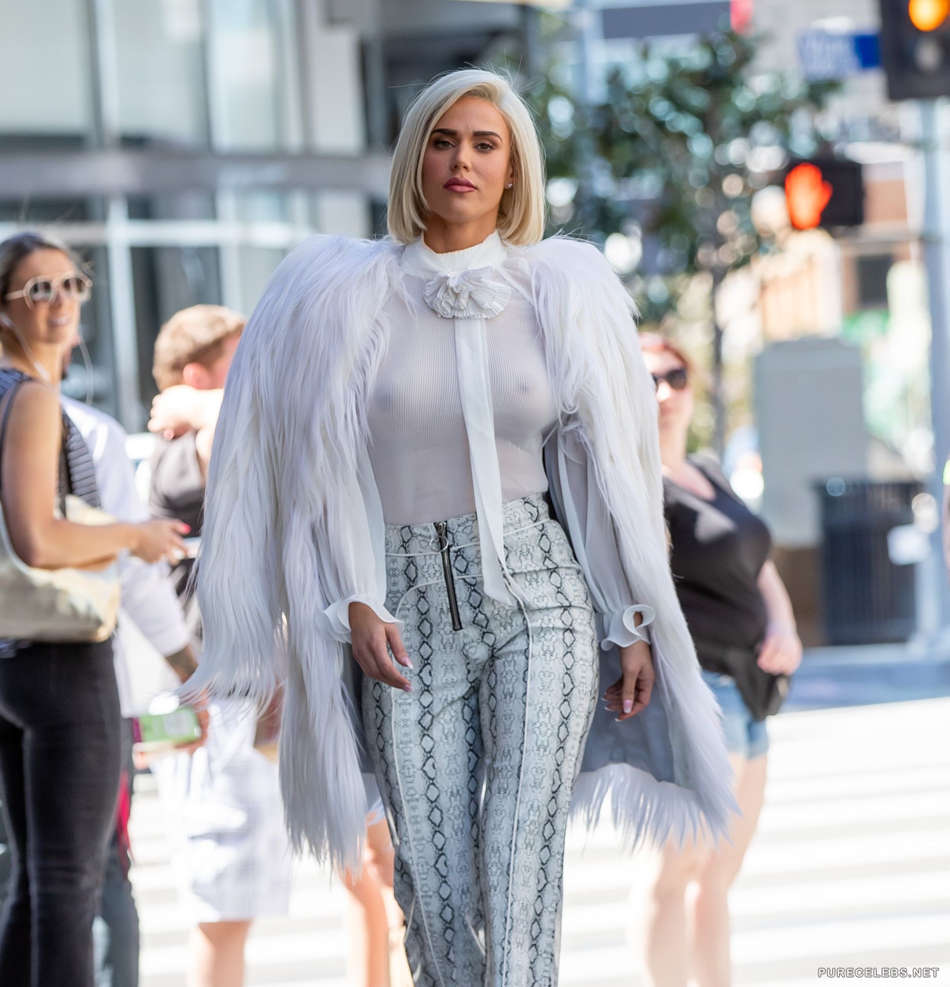 Sexy wrestler CJ Perry decided to fight for places in our hearts not only in the ring but in everyday life. Photos on which a star in a translucent sweater walks down the street. Her gorgeous breasts were clearly visible through her jacket and we can see her naughty brown hard nipples. The celebrity looked amazing and all eyes of passers-by were fixed on this hottie.