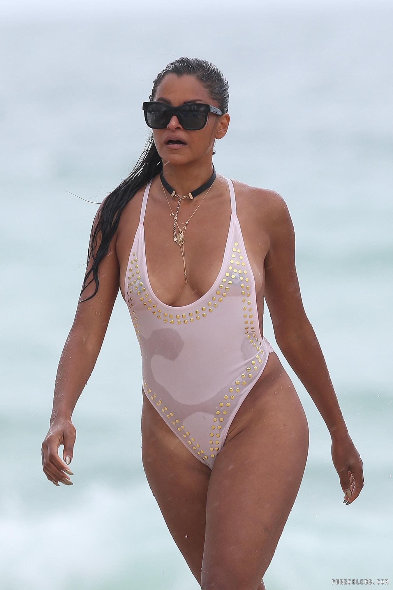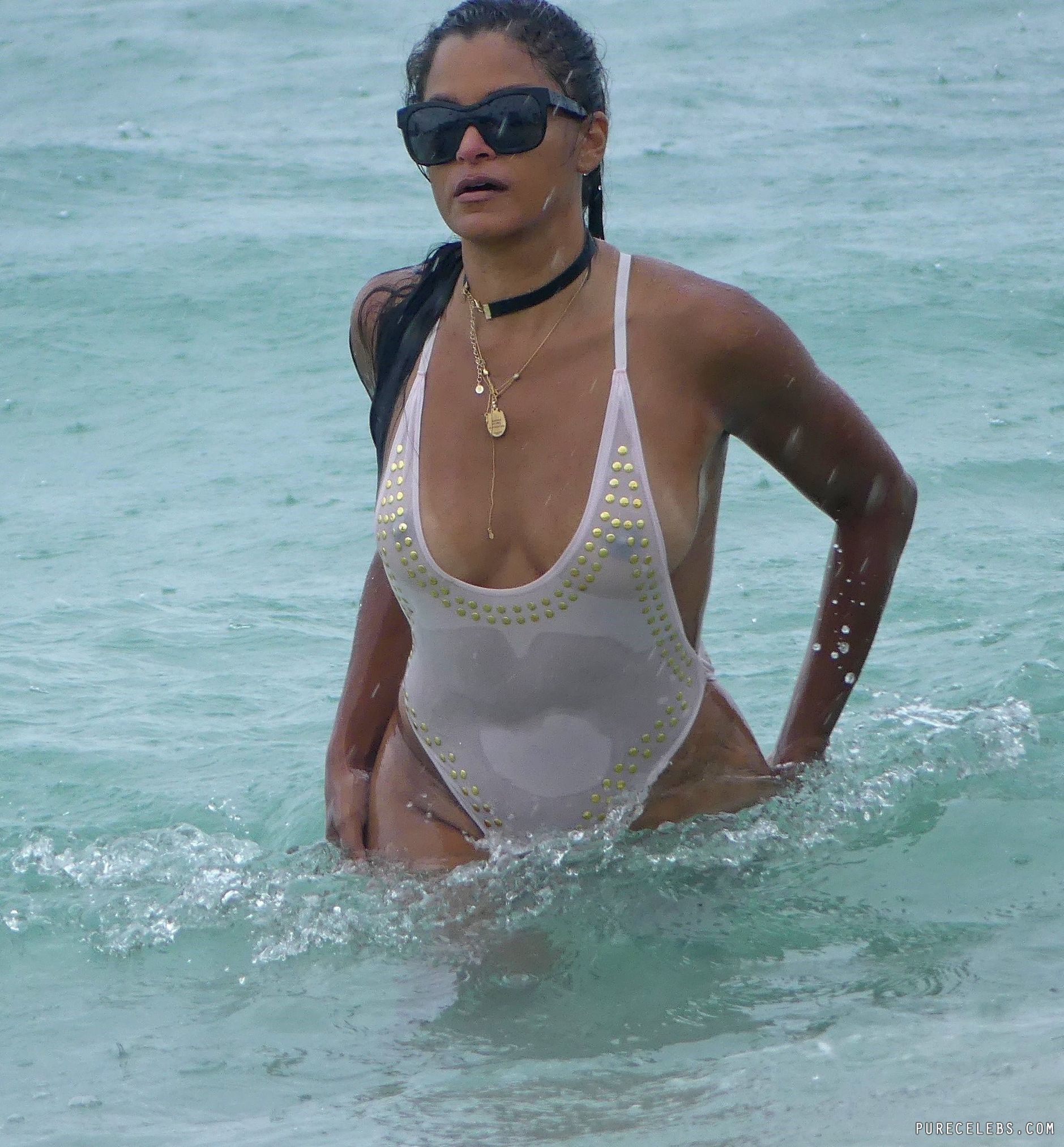 American actress Claudia Jordan flashed her nude breasts while swimming in the sea. The girl was wearing a white swimsuit with a very narrow top. Therefore, it is not surprising that at one point Claudia Jordan nude boob with a brown nipple slipped out of it. And paparazzi immediately caught this nipple slip moment with this celebrity.