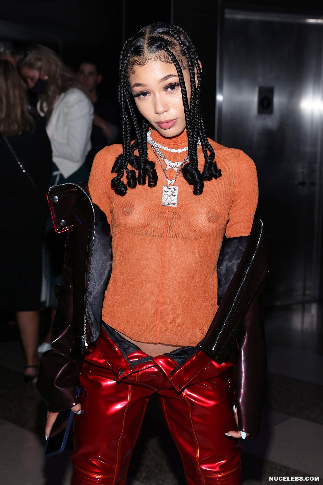 The American rapper Coi Leray loves to tease his fans, exposing his nude body in public. So, this celebrity went down the street in gray pants with a print. At the same time, Coi Leray tits were completely nude, only her nipples covered black stickers. And at another event, this beauty appeared in red shiny pants and an orange transparent sweater. At the same time, the girl was bralass. So Coi Leray nude titties with brown nipples were perfectly visible through.