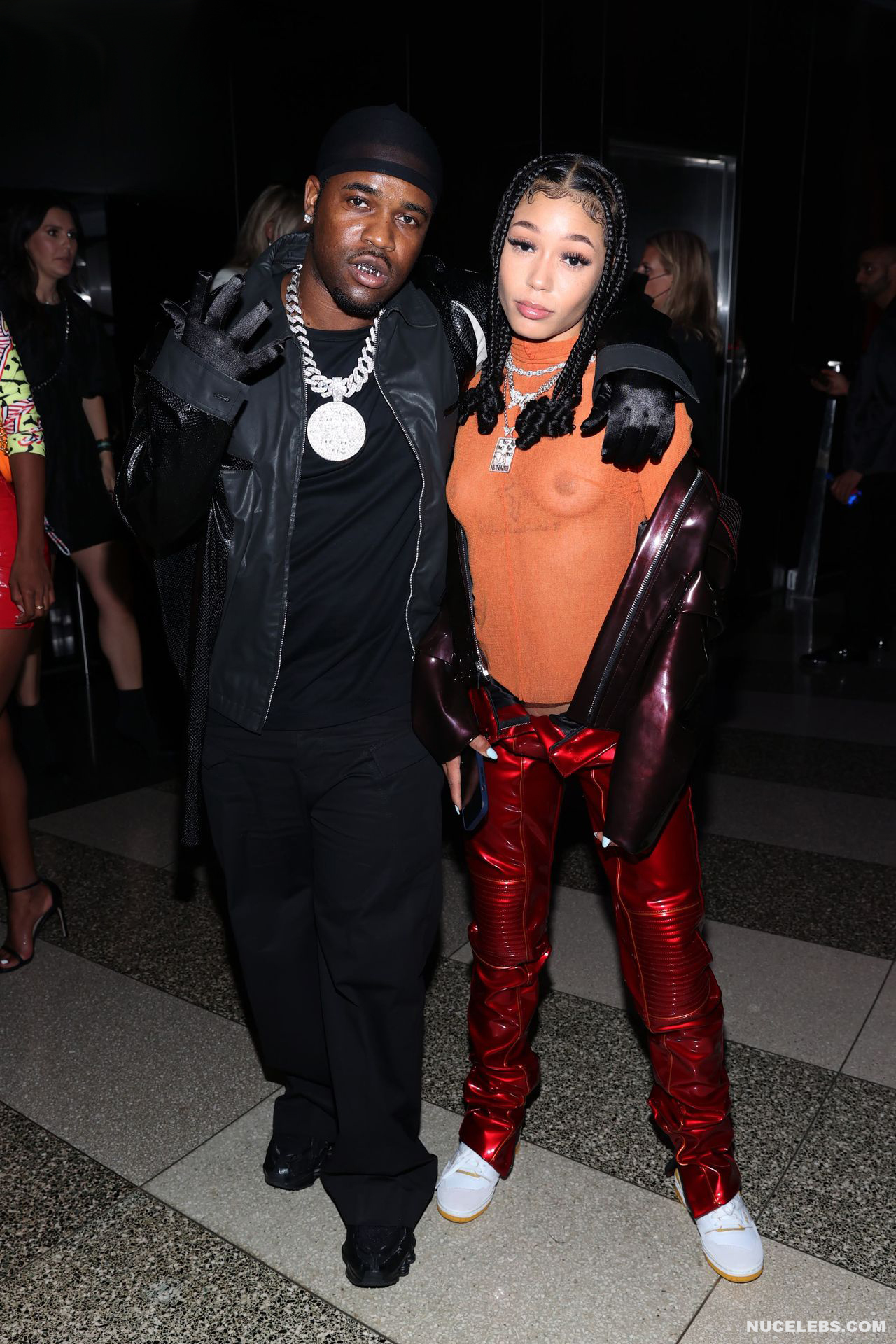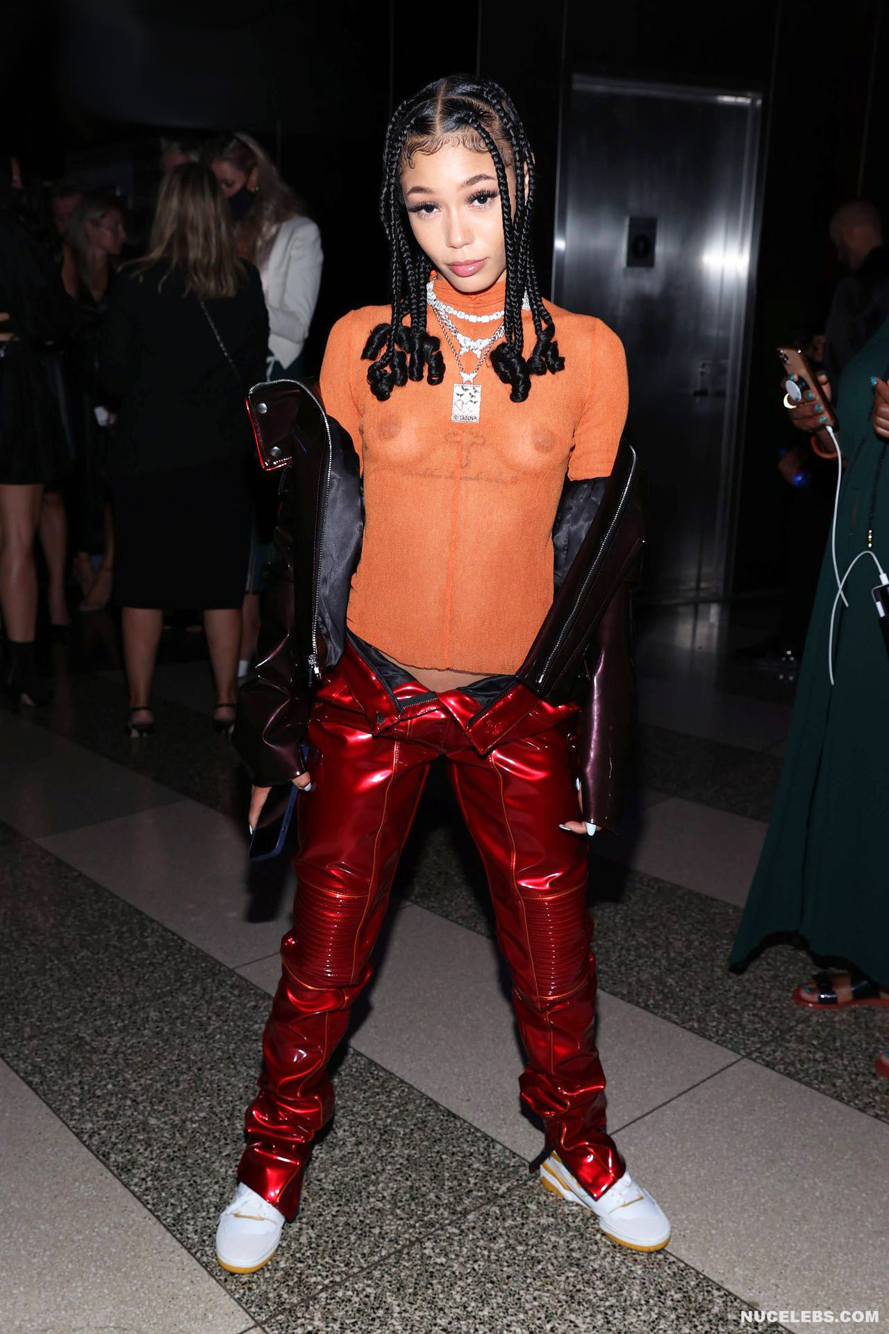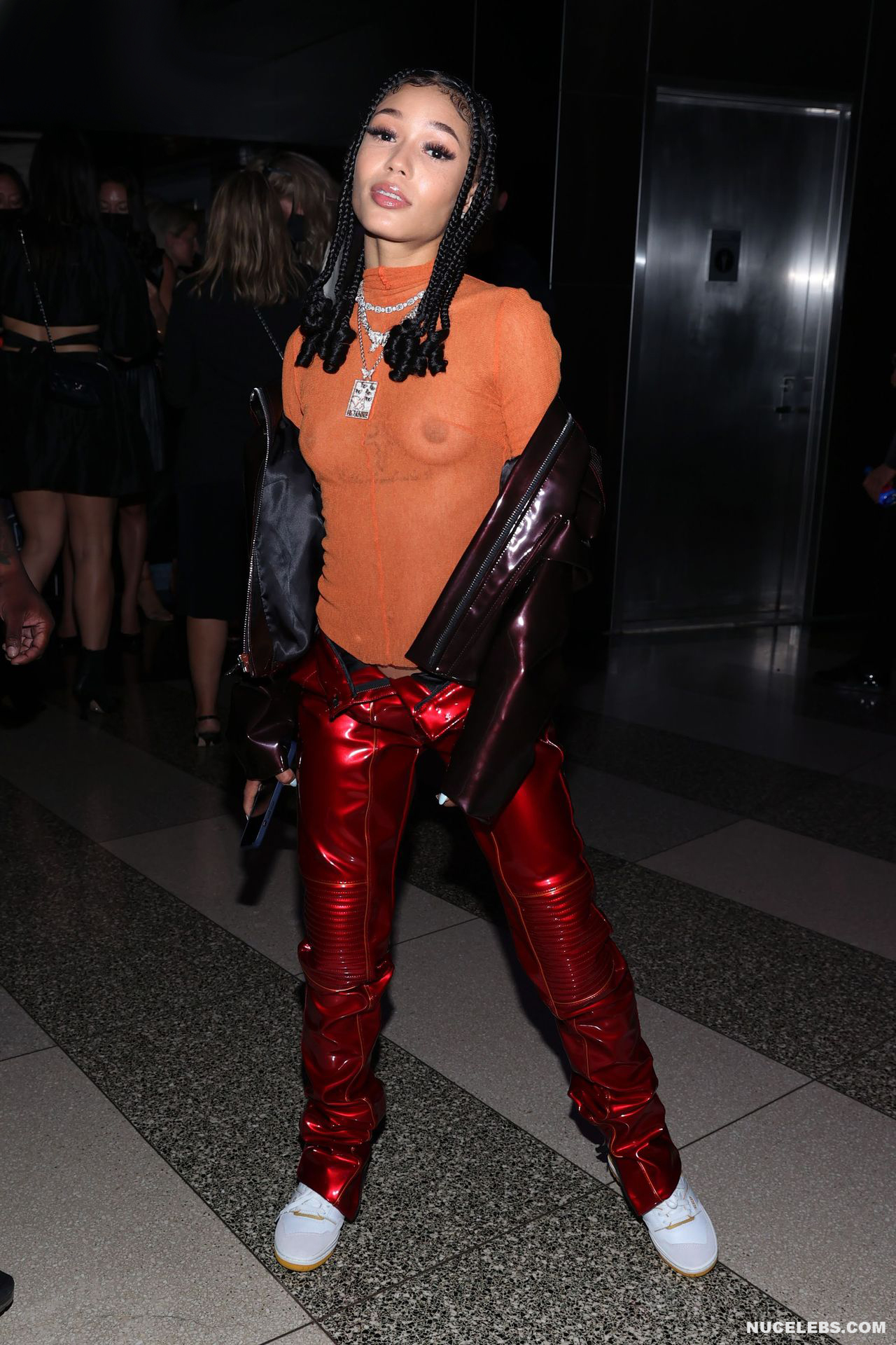 The American rapper Coi Leray loves to tease his fans, exposing his nude body in public. So, this celebrity went down the street in gray pants with a print. At the same time, Coi Leray tits were completely nude, only her nipples covered black stickers. And at another event, this beauty appeared in red shiny pants and an orange transparent sweater. At the same time, the girl was bralass. So Coi Leray nude titties with brown nipples were perfectly visible through.