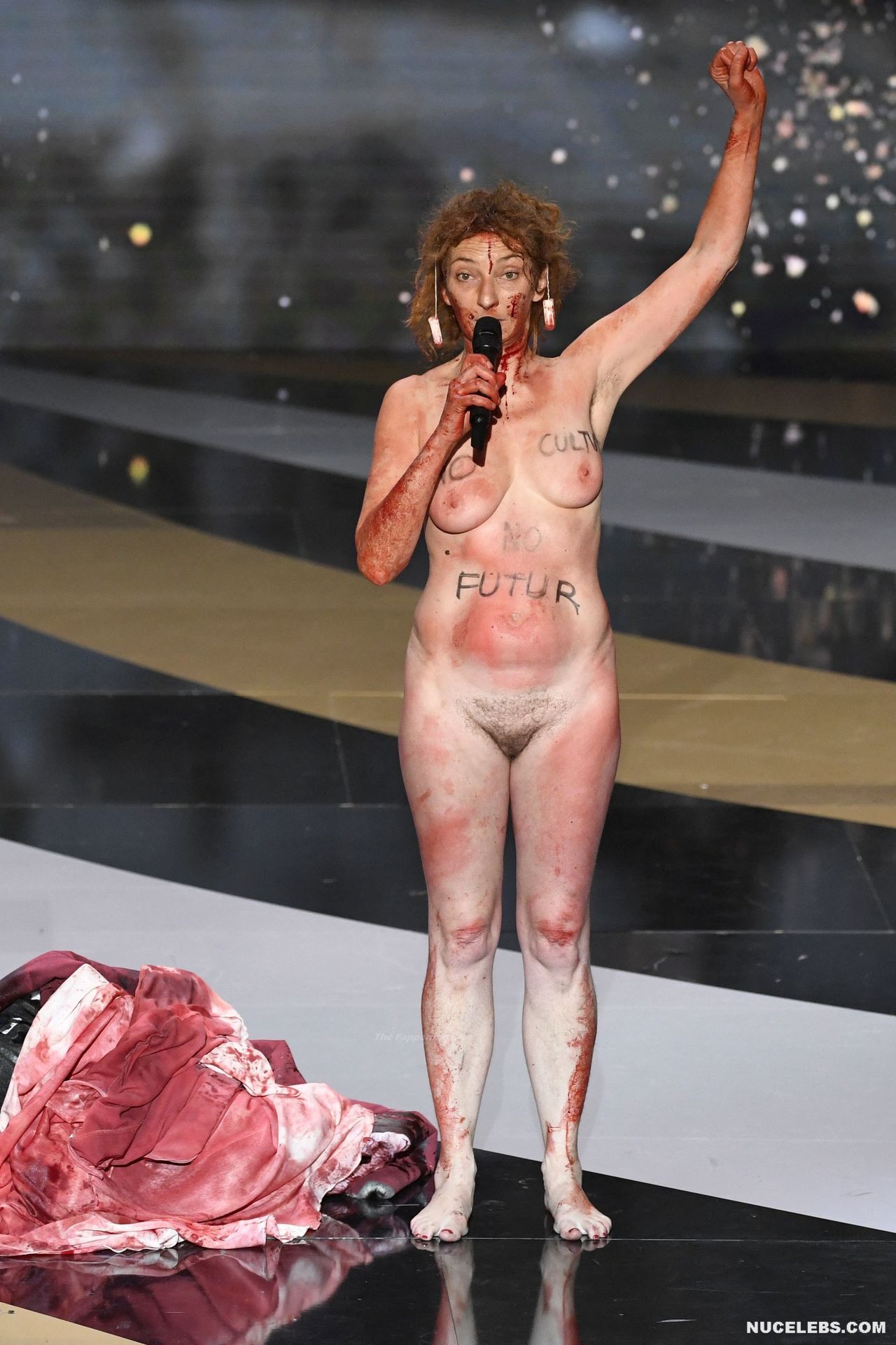 French actress Corinne Masiero became the main character at The 46th César Awards. I guess no one expected Corinne Masiero to appear on stage completely nude! At first, the actress was nevertheless dressed in a donkey costume and a dress. However, she soon threw off her outfit. So, the audience was able to see Corinne Masiero nude boobs with captions, and then her hairy pussy! In addition, Corinne Masiero also turned her back to the audience, showing her nude ass! Well, this star undoubtedly managed to make a splash at this event.