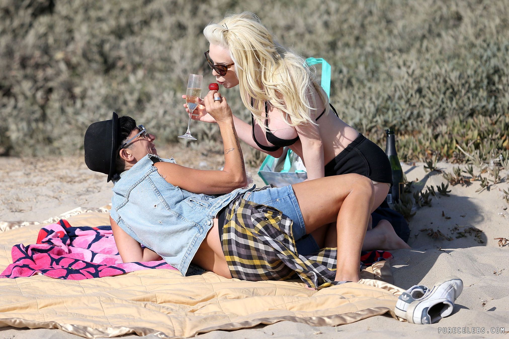 This blonde babe was already married with her 16 years old to a 50-year-old-actor. Her name is Courtney Stodden and she loves posing on camera and teasing everyone with her big fake breasts. She is enjoying her free time with her husband on the beach in a sexy black bra and black shorts that cover up her big bouncy booty as she didn’t leave her husband’s arms.
