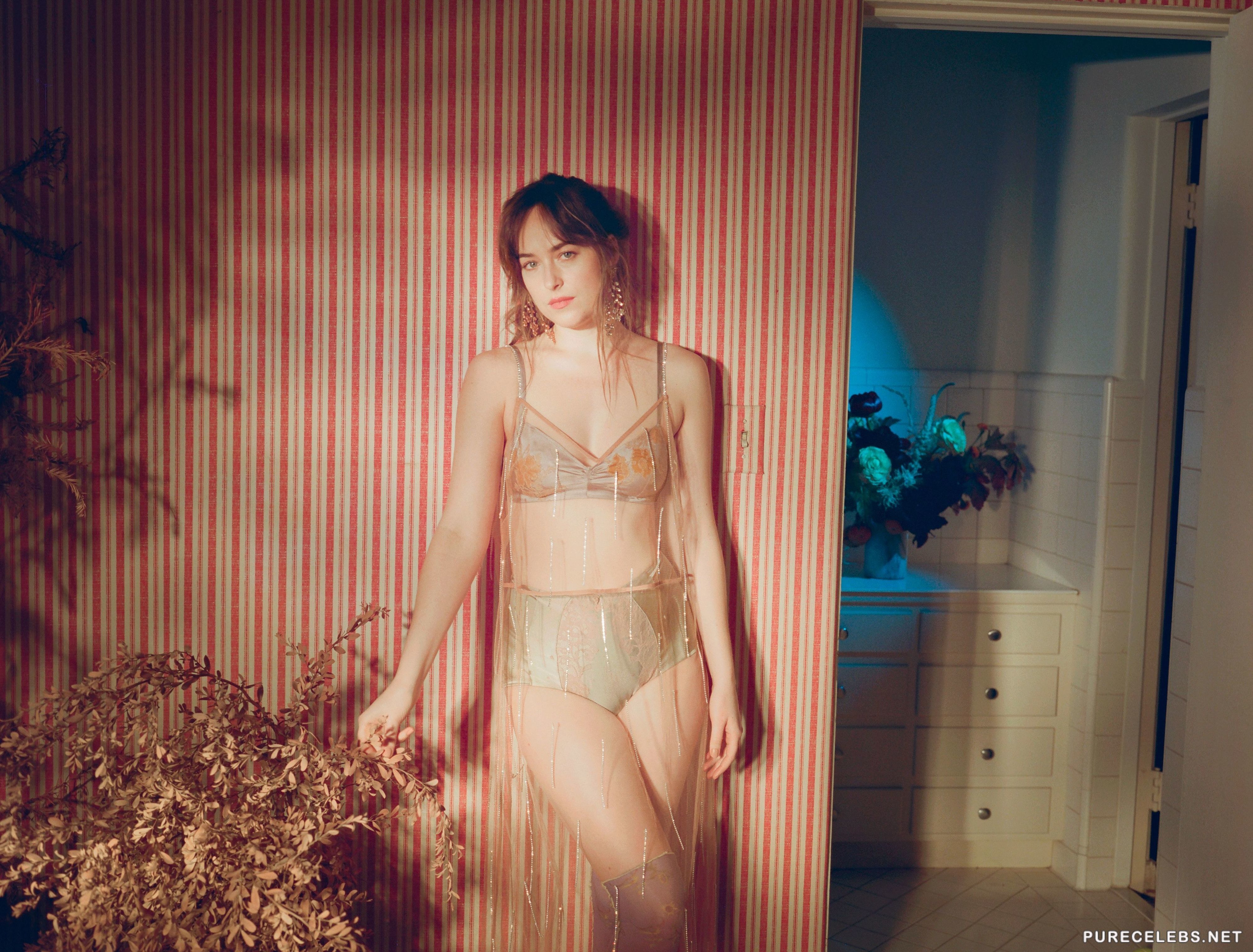 Star of many successful movies, Dakota Johnson proved herself to be an amazing actress. One of the other qualities she has is her stunning looks, from those big blue eyes all the way down to her shapely legs, she is definition of beauty. This time she posed for Allure Magazine, and oh boy, does she looks amazing on those photos. From sexy lingerie to that white see-through dress that accentuates her perfect body.